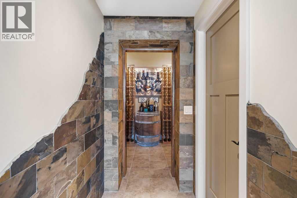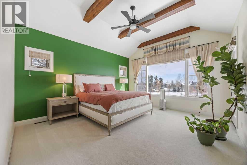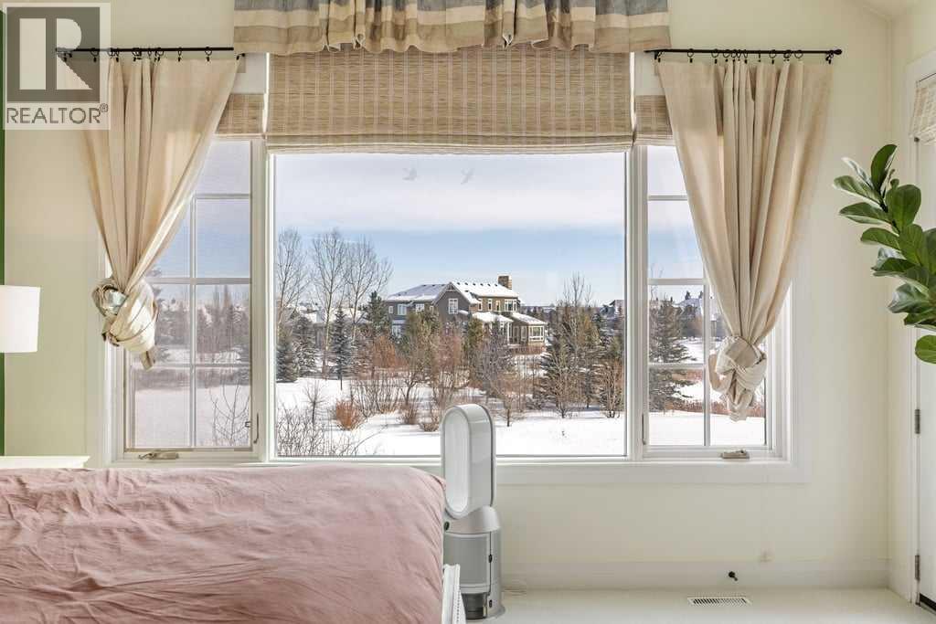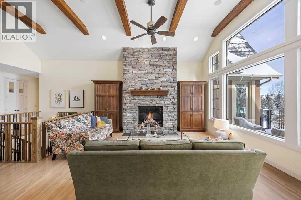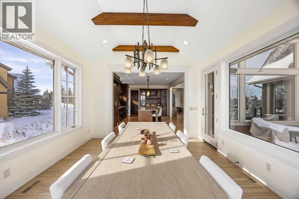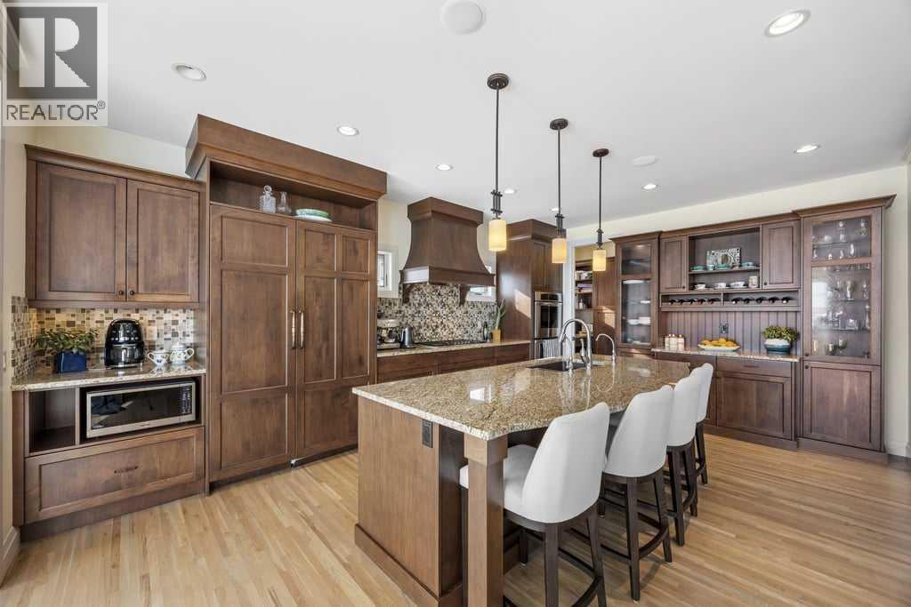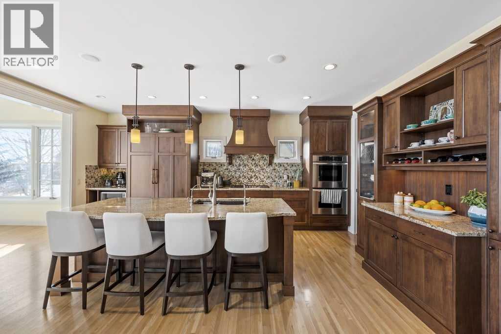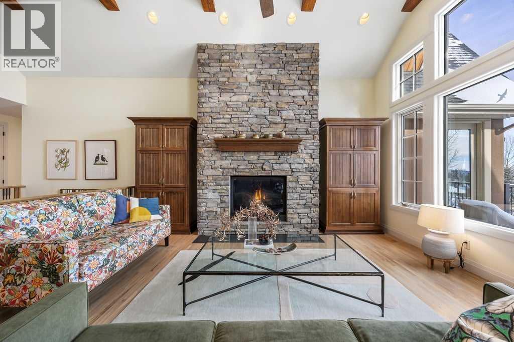 Set on over 2 acres of beautifully treed land, this exceptional Springbank home offers a rare blend of privacy, space, and refined comfort, all just minutes from west Calgary amenities and top schools.A curved driveway winds through mature landscaping, creating a strong sense of arrival as the home comes into view. Inside, soaring vaulted ceilings with exposed beams and rich hardwood floors set the tone in the main living area, where a striking stone fireplace anchors the space and invites both quiet evenings and larger gatherings.The kitchen is designed for both everyday living and entertaining, featuring integrated Thermador appliances, a walk-in pantry, a generous island with seating, and thoughtful details like a built-in wine rack. The adjacent dining area is surrounded by views of the natural landscape and opens onto a private balcony, extending your living space outdoors.The main floor primary suite is positioned to take full advantage of the peaceful setting, with views toward the pond and a well-appointed ensuite complete with dual vanities, a soaker tub, steam shower, heated floors, and separate walk-in closets. An office, along with a functional mudroom and laundry space with built-ins, completes the main level.Upstairs, a dedicated family zone offers two spacious bedrooms, a full bathroom, and a flexible recreation or study area, ideal for growing families.The walkout lower level is bright and expansive, designed for both relaxation and entertainment. Heated floors run throughout, with spaces that include a wet bar, wine cellar, theatre area, gym, and multiple recreation areas, along with two additional bedrooms and a full bathroom for guests.Outdoors, the property feels like a private retreat. Mature trees, two patio areas, a tranquil water feature with a flowing stream, and a firepit setting near the pond create multiple spaces to unwind or host throughout the seasons.Additional features include an oversized four-car garage with access to both t he front and rear of the property, air conditioning, and whole-home audio. Residents also enjoy community features such as pond maintenance and seasonal stocking through the HOA.Located within the Springbank school system and close to Calgary’s leading private schools, with convenient access west to the mountains, this is a rare opportunity to own a truly special property in a sought-after setting. (id:63190)