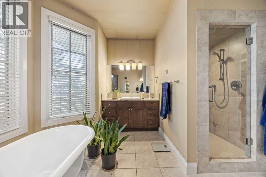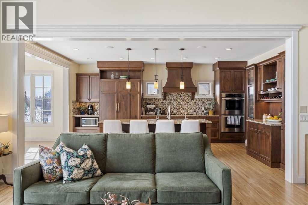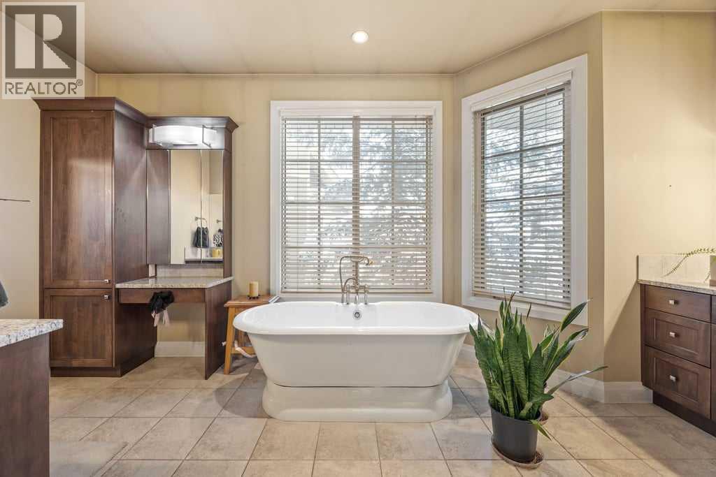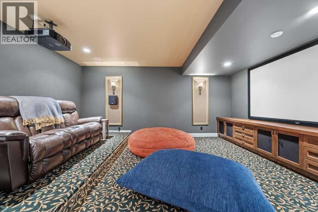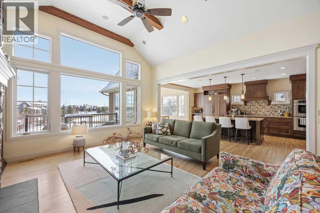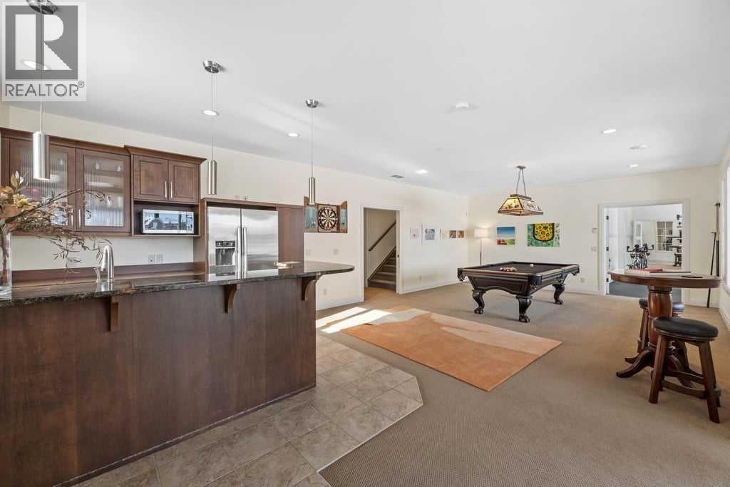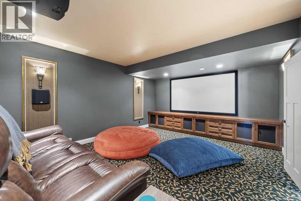 Set on over 2 acres of beautifully treed land, this exceptional Springbank home offers a rare blend of privacy, space, and refined comfort, all just minutes from west Calgary amenities and top schools.A curved driveway winds through mature landscaping, creating a strong sense of arrival as the home comes into view. Inside, soaring vaulted ceilings with exposed beams and rich hardwood floors set the tone in the main living area, where a striking stone fireplace anchors the space and invites both quiet evenings and larger gatherings.The kitchen is designed for both everyday living and entertaining, featuring integrated Thermador appliances, a walk-in pantry, a generous island with seating, and thoughtful details like a built-in wine rack. The adjacent dining area is surrounded by views of the natural landscape and opens onto a private balcony, extending your living space outdoors.The main floor primary suite is positioned to take full advantage of the peaceful setting, with views toward the pond and a well-appointed ensuite complete with dual vanities, a soaker tub, steam shower, heated floors, and separate walk-in closets. An office, along with a functional mudroom and laundry space with built-ins, completes the main level.Upstairs, a dedicated family zone offers two spacious bedrooms, a full bathroom, and a flexible recreation or study area, ideal for growing families.The walkout lower level is bright and expansive, designed for both relaxation and entertainment. Heated floors run throughout, with spaces that include a wet bar, wine cellar, theatre area, gym, and multiple recreation areas, along with two additional bedrooms and a full bathroom for guests.Outdoors, the property feels like a private retreat. Mature trees, two patio areas, a tranquil water feature with a flowing stream, and a firepit setting near the pond create multiple spaces to unwind or host throughout the seasons.Additional features include an oversized four-car garage with access to both t he front and rear of the property, air conditioning, and whole-home audio. Residents also enjoy community features such as pond maintenance and seasonal stocking through the HOA.Located within the Springbank school system and close to Calgary’s leading private schools, with convenient access west to the mountains, this is a rare opportunity to own a truly special property in a sought-after setting. (id:63190)