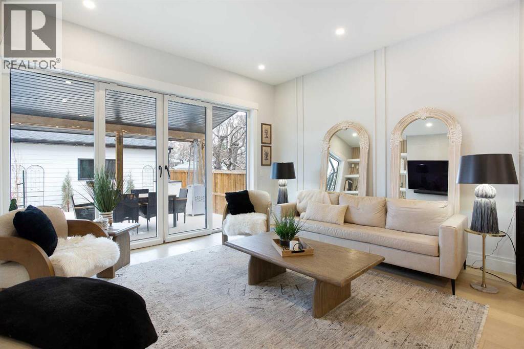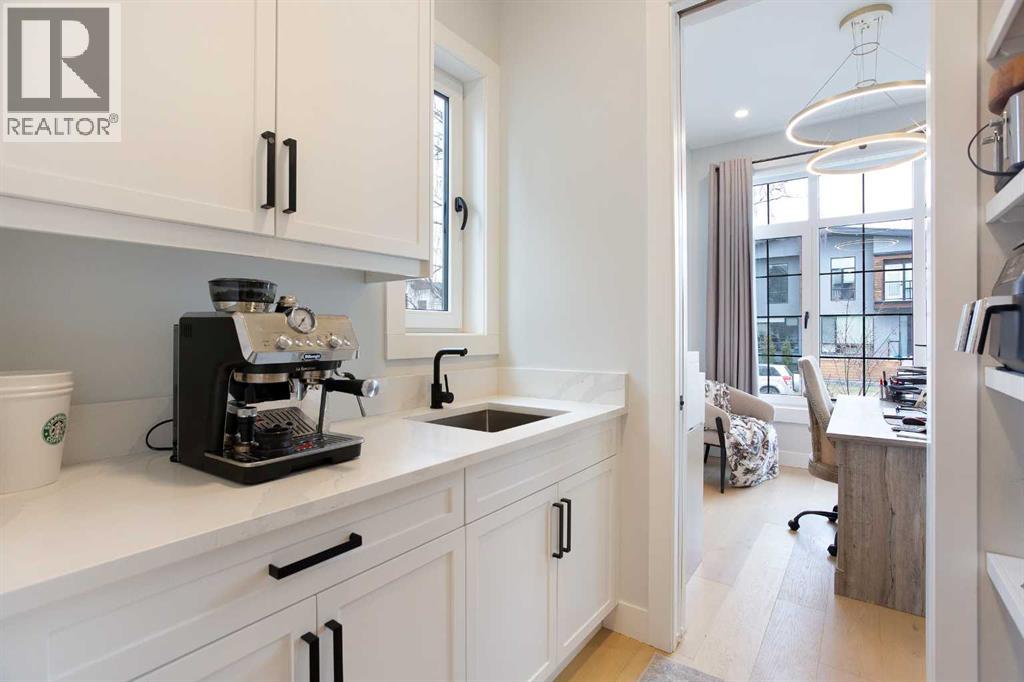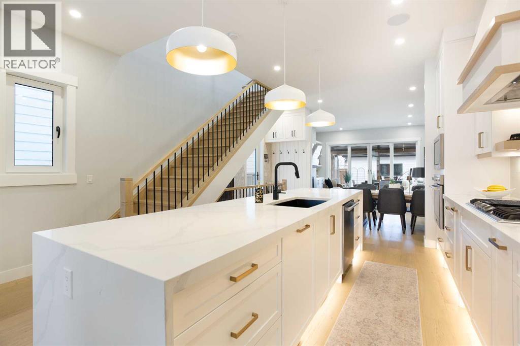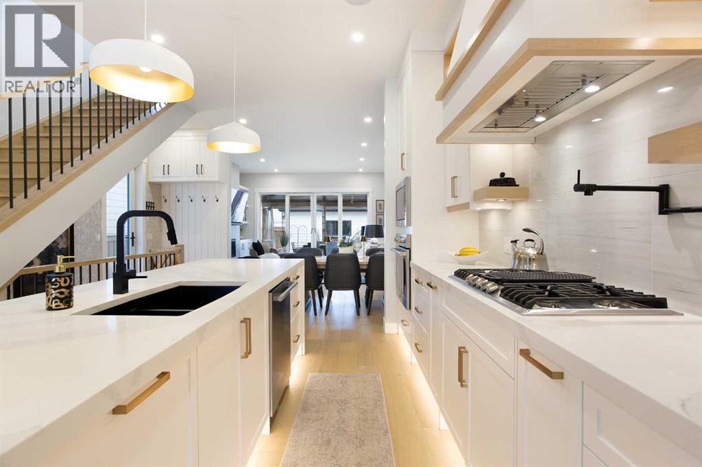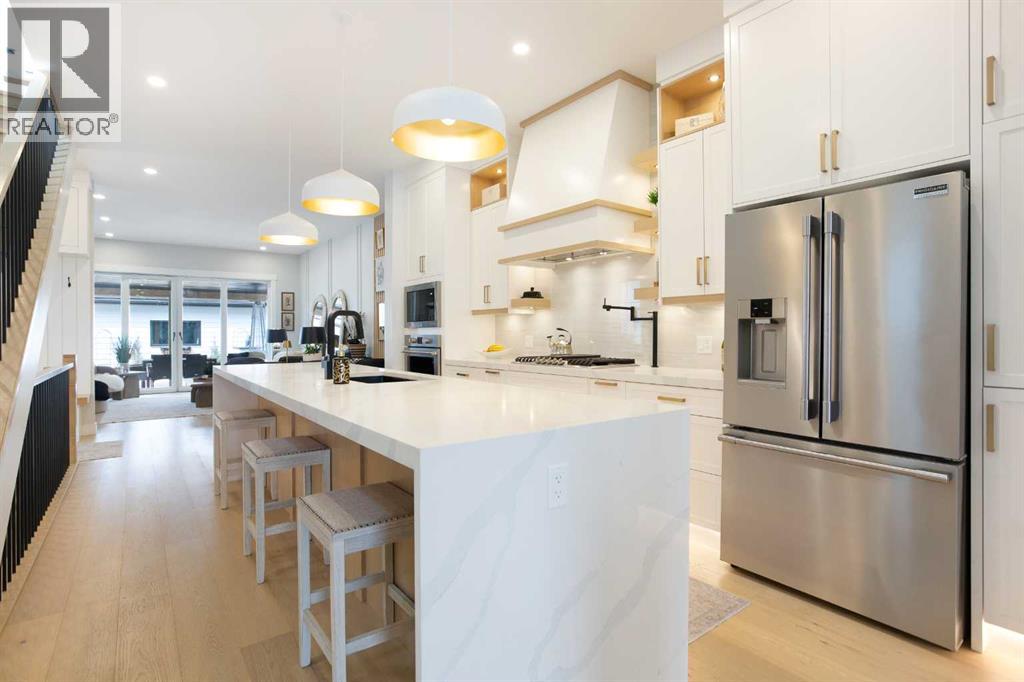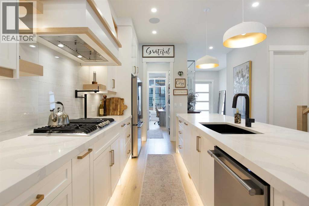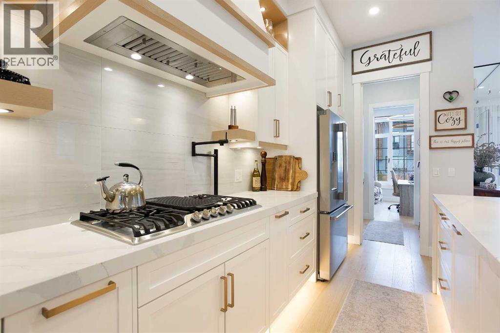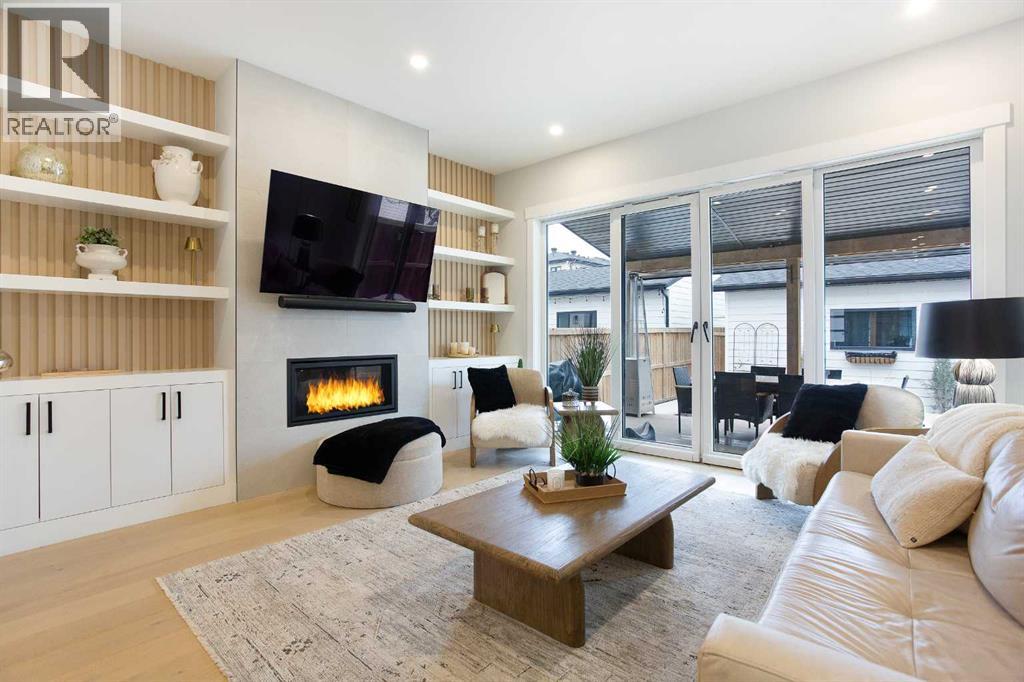 Experience elevated inner-city living in this custom-built home in Rosscarrock, offering over 3,000 sq ft of finished space and a location that puts you minutes to downtown, Westbrook LRT, Edworthy Park, and Shaganappi Golf Course.The main floor is bright and functional with 10-foot ceilings, wide-plank engineered hardwood, and a seamless open layout. A glass-enclosed front flex room works perfectly as a home office or formal dining space. At the heart of the home, the kitchen delivers both style and performance with full-height two-tone cabinetry, built-in appliances, a gas cooktop with pot filler, and a waterfall quartz island. A walkthrough butler’s pantry adds extra prep and storage space.The living area is anchored by a gas fireplace with custom millwork and opens to the backyard through large Kulu Tilt & Slide tilt-and-turn doors, leading to a covered composite deck and professionally landscaped yard.Upstairs features a central bonus room, laundry, and three bedrooms. The primary suite offers a walk-in closet with built-ins and a five-piece ensuite with heated floors, dual vanities, a soaker tub, and a fully tiled shower.The finished basement adds a spacious rec room with wet bar, a fourth bedroom, and a full bathroom, ideal for guests or additional living space.Additional highlights include built-in speakers, air conditioning, and a heated double detached garage with epoxy flooring.A polished, move-in-ready home in a growing inner-city neighbourhood. (id:63190)