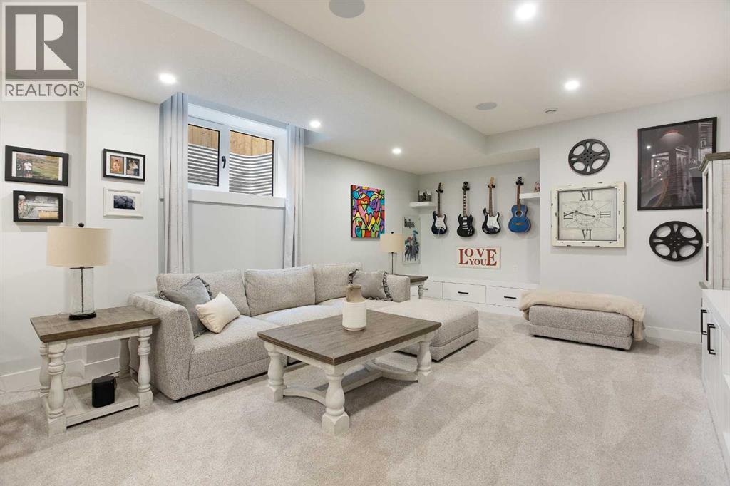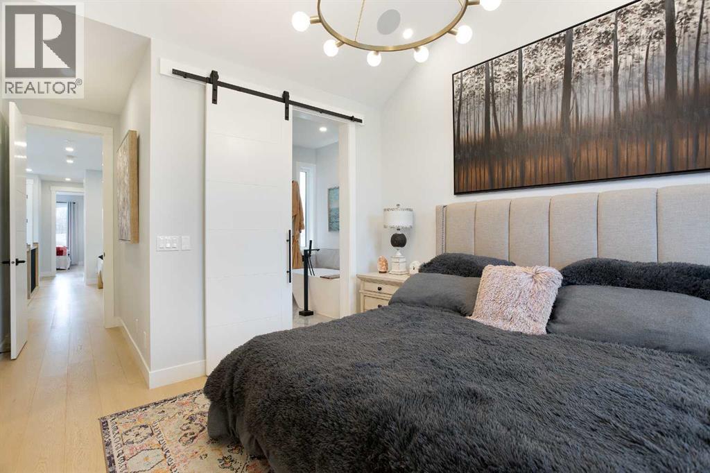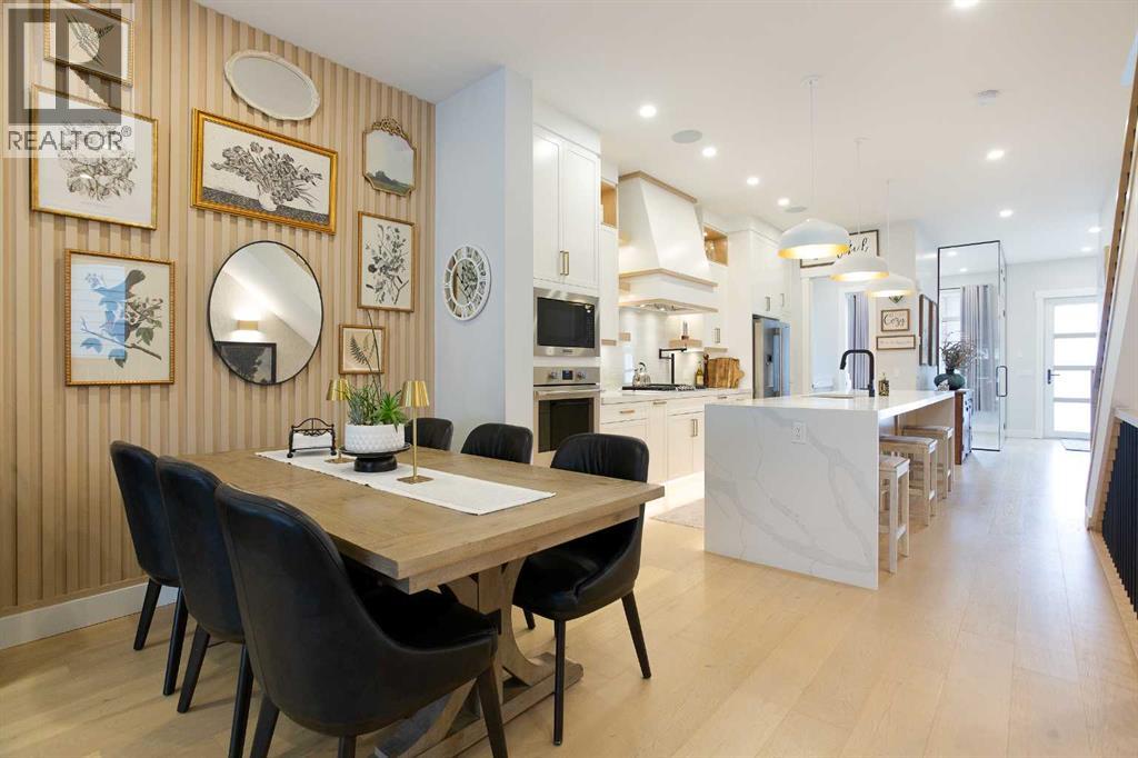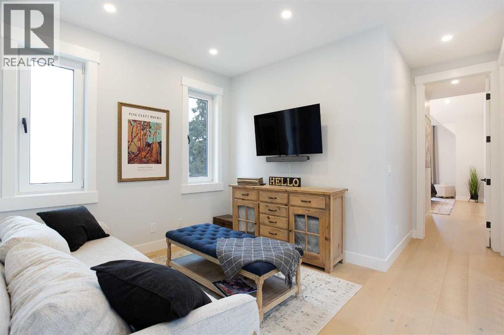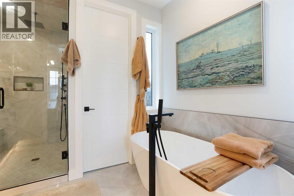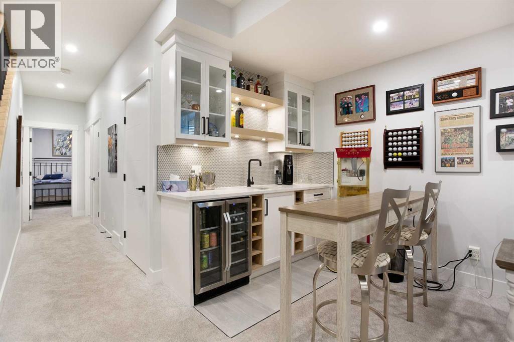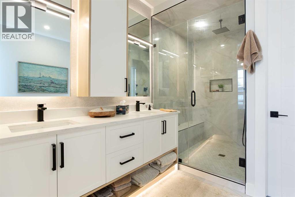 Experience elevated inner-city living in this custom-built home in Rosscarrock, offering over 3,000 sq ft of finished space and a location that puts you minutes to downtown, Westbrook LRT, Edworthy Park, and Shaganappi Golf Course.The main floor is bright and functional with 10-foot ceilings, wide-plank engineered hardwood, and a seamless open layout. A glass-enclosed front flex room works perfectly as a home office or formal dining space. At the heart of the home, the kitchen delivers both style and performance with full-height two-tone cabinetry, built-in appliances, a gas cooktop with pot filler, and a waterfall quartz island. A walkthrough butler’s pantry adds extra prep and storage space.The living area is anchored by a gas fireplace with custom millwork and opens to the backyard through large Kulu Tilt & Slide tilt-and-turn doors, leading to a covered composite deck and professionally landscaped yard.Upstairs features a central bonus room, laundry, and three bedrooms. The primary suite offers a walk-in closet with built-ins and a five-piece ensuite with heated floors, dual vanities, a soaker tub, and a fully tiled shower.The finished basement adds a spacious rec room with wet bar, a fourth bedroom, and a full bathroom, ideal for guests or additional living space.Additional highlights include built-in speakers, air conditioning, and a heated double detached garage with epoxy flooring.A polished, move-in-ready home in a growing inner-city neighbourhood. (id:63190)
