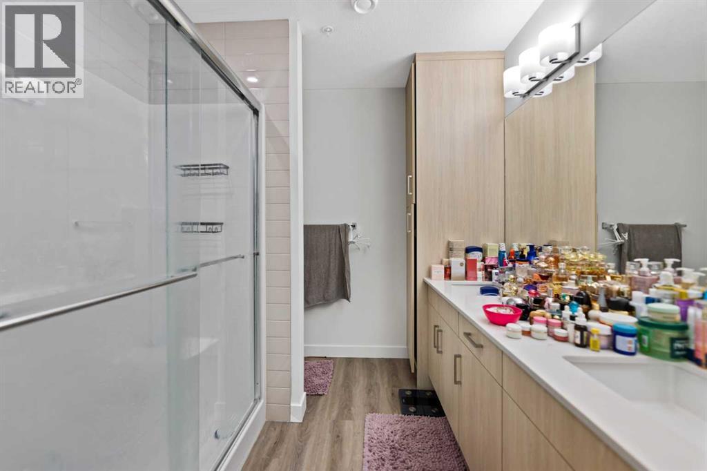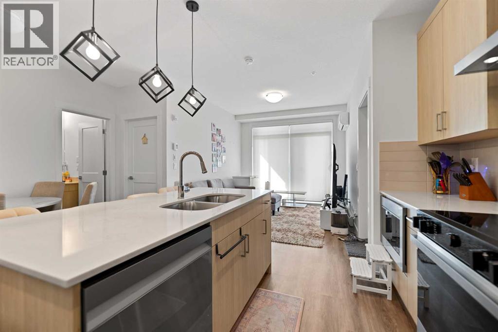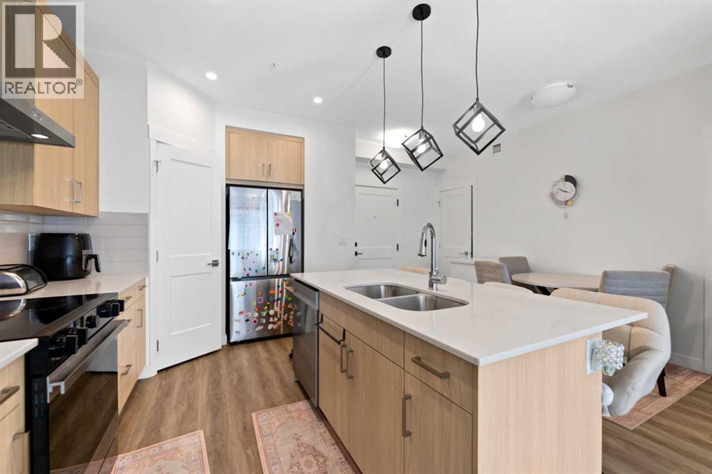 Welcome to this modern 2-bedroom, 2-bathroom condo located on the 3rd floor in the vibrant community of Livingston. Featuring a bright open-concept layout, the kitchen offers quartz countertops, stainless steel appliances, and contemporary cabinetry, flowing seamlessly into the living area and private balcony.The primary bedroom includes a walk-in closet and ensuite, while the second bedroom is conveniently located next to the full main bath, ideal for guests or a home office. Additional features include air conditioning, in-suite laundry, luxury vinyl plank flooring, titled underground parking, and a storage unit.Close to parks, walking paths, shopping, and major roadways, this home offers modern comfort and everyday convenience. (id:63190)