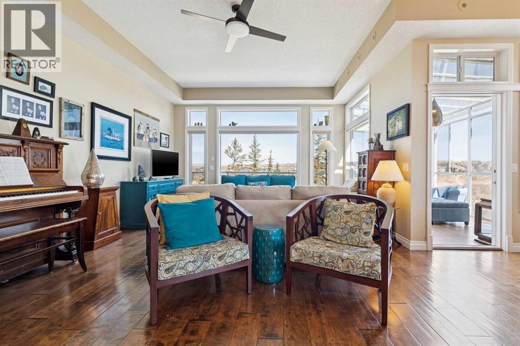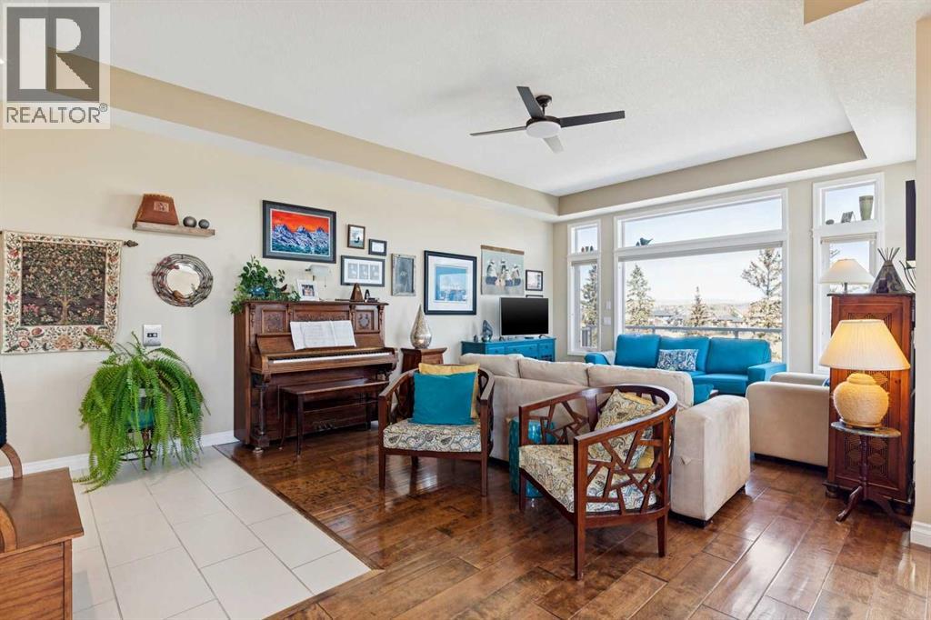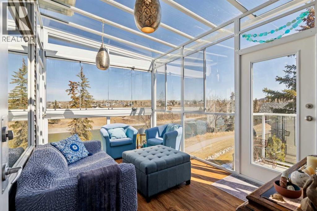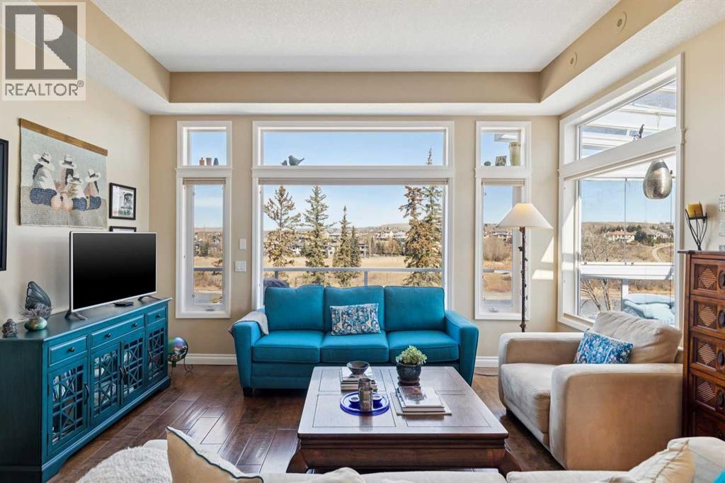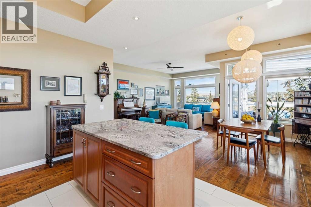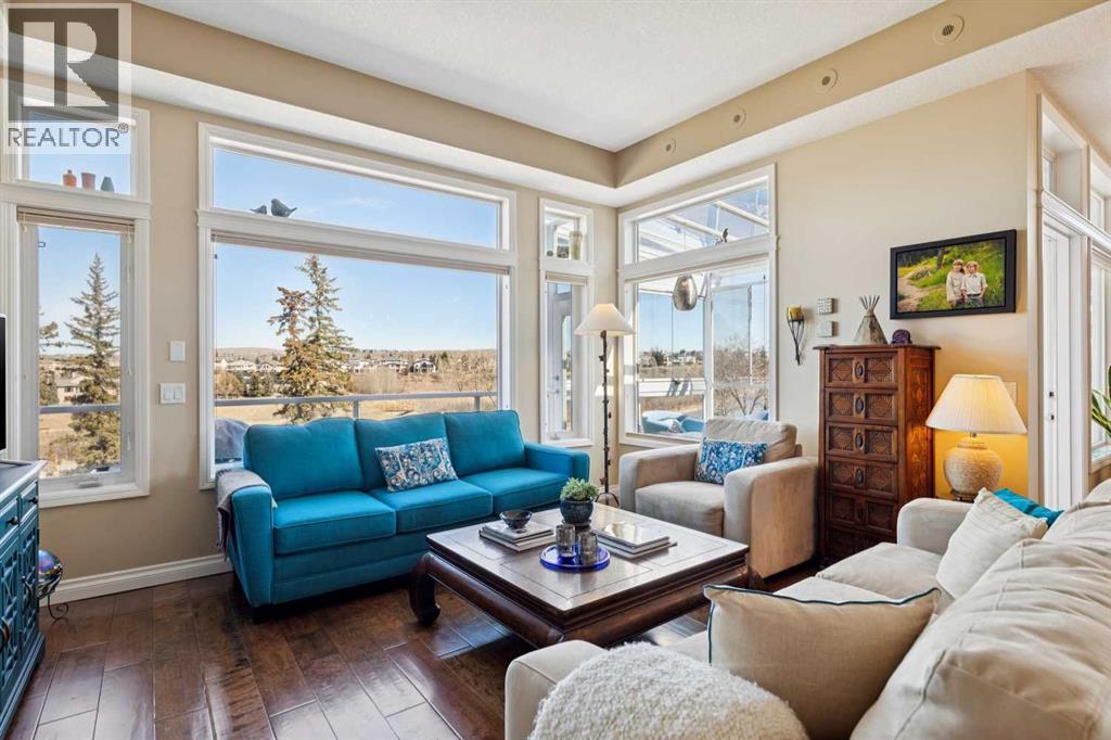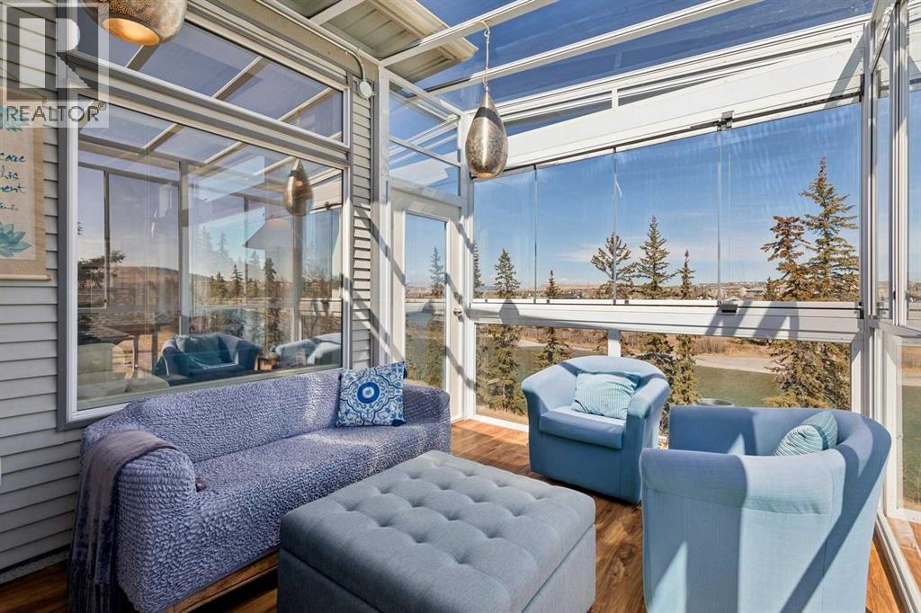WOW! Prepare to be impressed by this stunning, ultra-stylish, recently updated TOP FLOOR condo offering breathtaking, UNOBSTRUCTED VIEWS of the Bow River, River valley and ROCKY MOUNTAINS! This exceptional home delivers a truly unique lifestyle, featuring a PRIVATE ELEVATOR with direct access to your unit and a HEATED DOUBLE GARAGE with additional storage. Nestled along the Bow River and Jumping Pound Creek, this tranquil setting is surrounded by scenic pathways, creating the perfect backdrop for relaxing, entertaining, and enjoying the outdoors year-round. Inside, the home is flooded with natural light, showcasing soaring 10-foot ceilings and beautiful engineered flooring throughout. The open-concept main living area is both elegant and functional, highlighted by a modern kitchen complete with a gas stove, stainless steel appliances, and granite countertops—ideal for hosting or everyday living.To the front of the unit, you’ll find two spacious bedrooms, including a large primary retreat with a luxurious 4-piece ensuite featuring a soaker tub. A second 4-piece bathroom also offers granite countertops. A bright and spacious office provides an ideal work-from-home space. This home is loaded with premium features, including AIR CONDITIONING and convenient ATTIC STORAGE for seasonal items. Recent upgrades elevate both comfort and style, including a STUNNING 3 SEASON SUNROOM ($34,000 ), new sliding doors and designer lighting throughout the entire home. Additional updates include LG washer and dryer (Nov 2023), Whirlpool refrigerator (2022), and Bosch dishwasher (2025).With unparalleled views, upscale finishes, and a serene natural setting, this is a rare opportunity to enjoy refined riverside living at its finest. Book your showing today!! (id:63190)