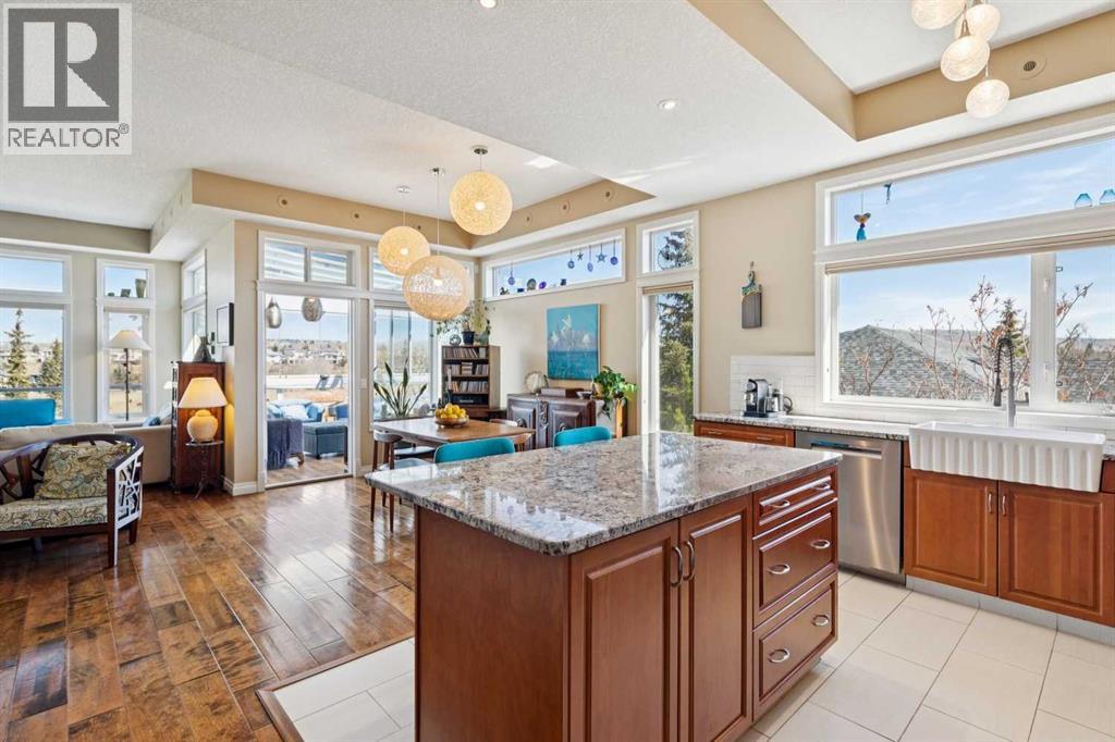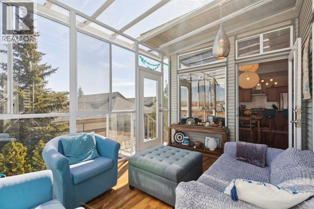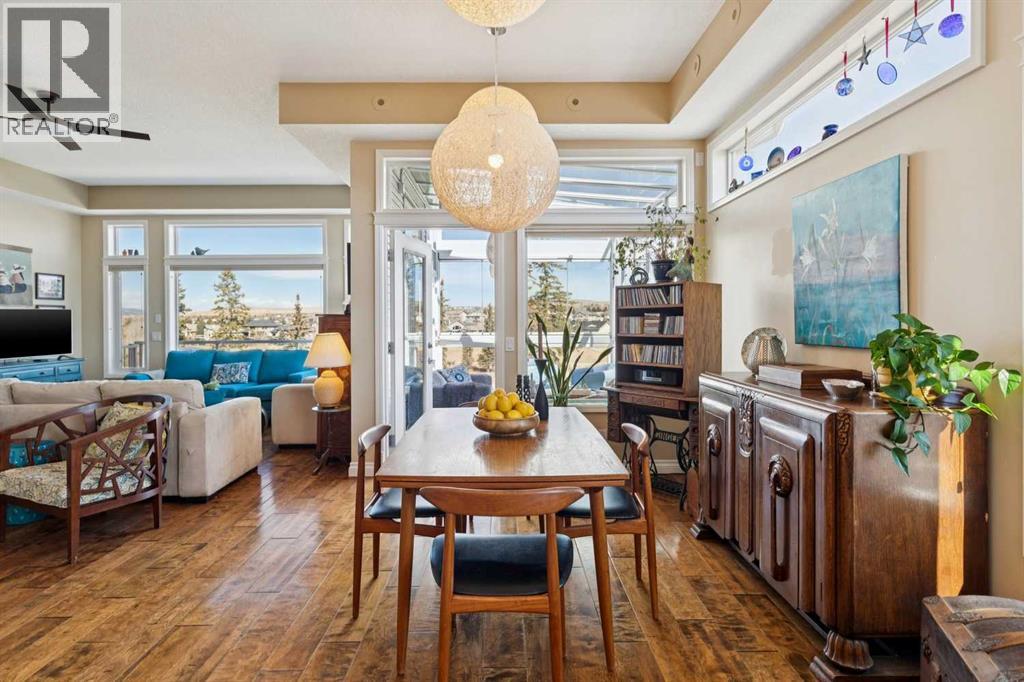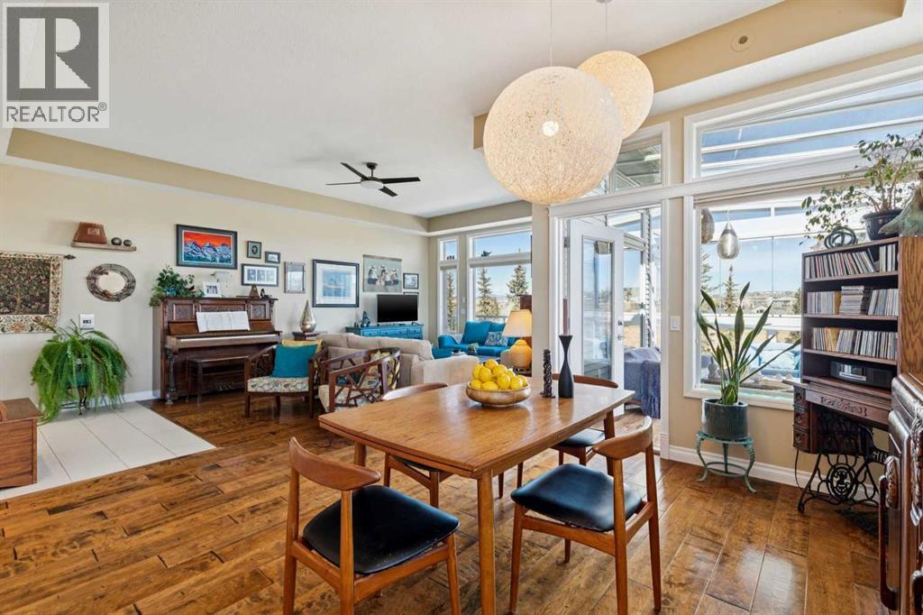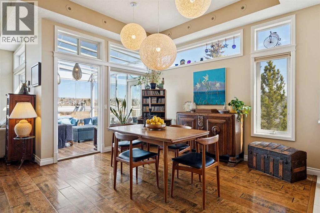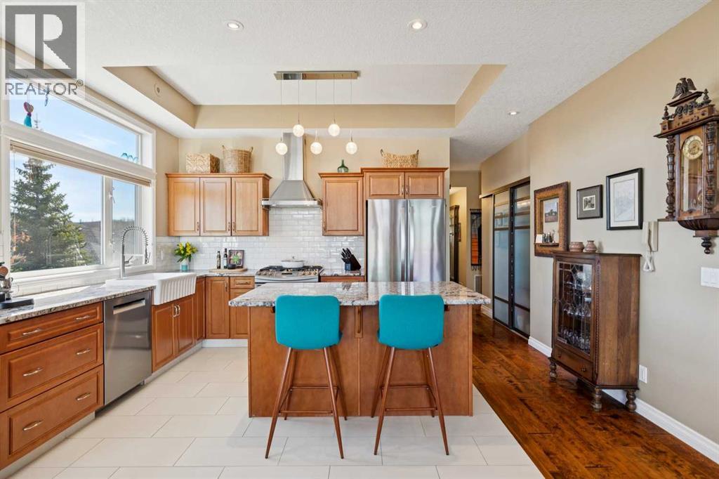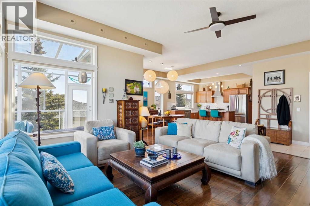 WOW! Prepare to be impressed by this stunning, ultra-stylish, recently updated TOP FLOOR condo offering breathtaking, UNOBSTRUCTED VIEWS of the Bow River, River valley and ROCKY MOUNTAINS! This exceptional home delivers a truly unique lifestyle, featuring a PRIVATE ELEVATOR with direct access to your unit and a HEATED DOUBLE GARAGE with additional storage. Nestled along the Bow River and Jumping Pound Creek, this tranquil setting is surrounded by scenic pathways, creating the perfect backdrop for relaxing, entertaining, and enjoying the outdoors year-round. Inside, the home is flooded with natural light, showcasing soaring 10-foot ceilings and beautiful engineered flooring throughout. The open-concept main living area is both elegant and functional, highlighted by a modern kitchen complete with a gas stove, stainless steel appliances, and granite countertops—ideal for hosting or everyday living.To the front of the unit, you’ll find two spacious bedrooms, including a large primary retreat with a luxurious 4-piece ensuite featuring a soaker tub. A second 4-piece bathroom also offers granite countertops. A bright and spacious office provides an ideal work-from-home space. This home is loaded with premium features, including AIR CONDITIONING and convenient ATTIC STORAGE for seasonal items. Recent upgrades elevate both comfort and style, including a STUNNING 3 SEASON SUNROOM ($34,000 ), new sliding doors and designer lighting throughout the entire home. Additional updates include LG washer and dryer (Nov 2023), Whirlpool refrigerator (2022), and Bosch dishwasher (2025).With unparalleled views, upscale finishes, and a serene natural setting, this is a rare opportunity to enjoy refined riverside living at its finest. Book your showing today!! (id:63190)