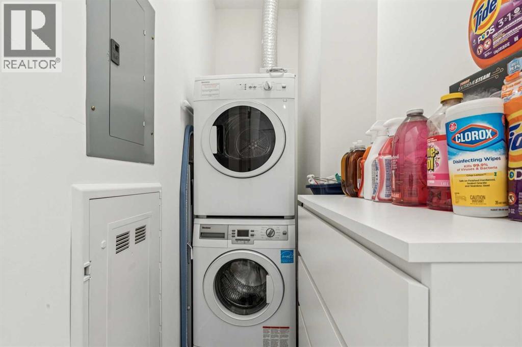 Experience elevated penthouse living at The Vogue, perched high above the city’s financial core. This rare 2 bedroom, 2 bathroom residence features soaring vaulted ceilings, floor-to-ceiling windows, and TWO well-placed balconies that capture sweepingurban views, river views, and natural light throughout the day. The thoughtfully designed layout includes a spacious primary retreat with a walk-in closet and an exceptional 5-piece ensuite with double vanity, a separate in-unit laundry room, and open-concept living ideal for both everyday comfort and entertaining. Offered in only a limited number of high-rise units, this penthouse delivers a truly exclusive living experience. Completing the package are TWO TITLED underground parking stalls (UNITS 1 & 2) with immediate access from the parkade entrance, a rare and valuable convenience in the downtown core. (id:63190)