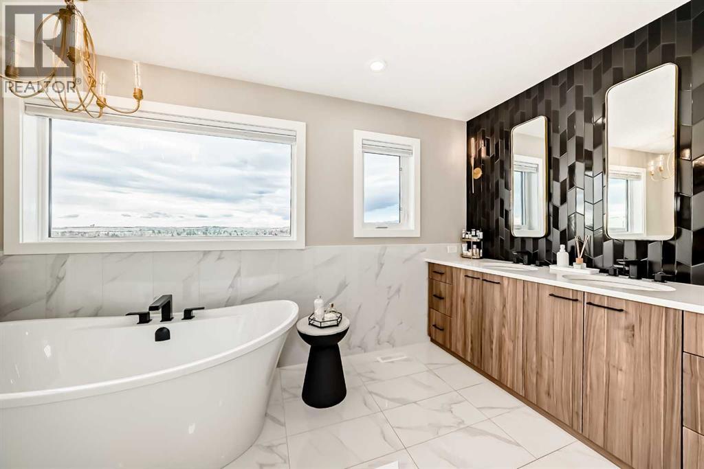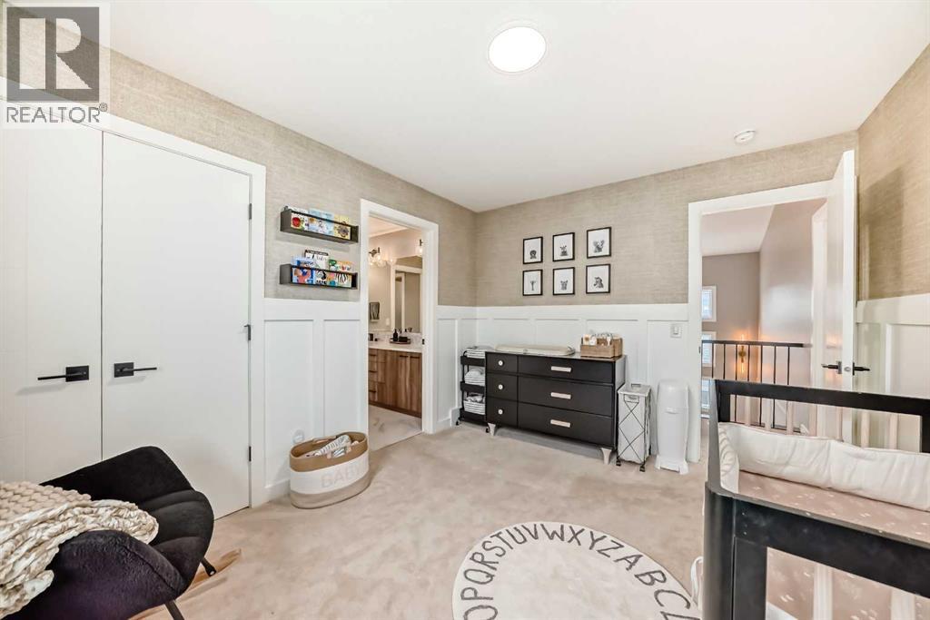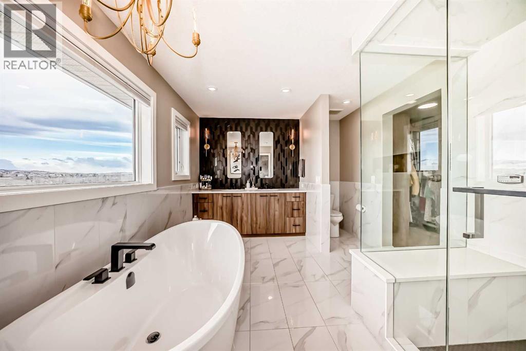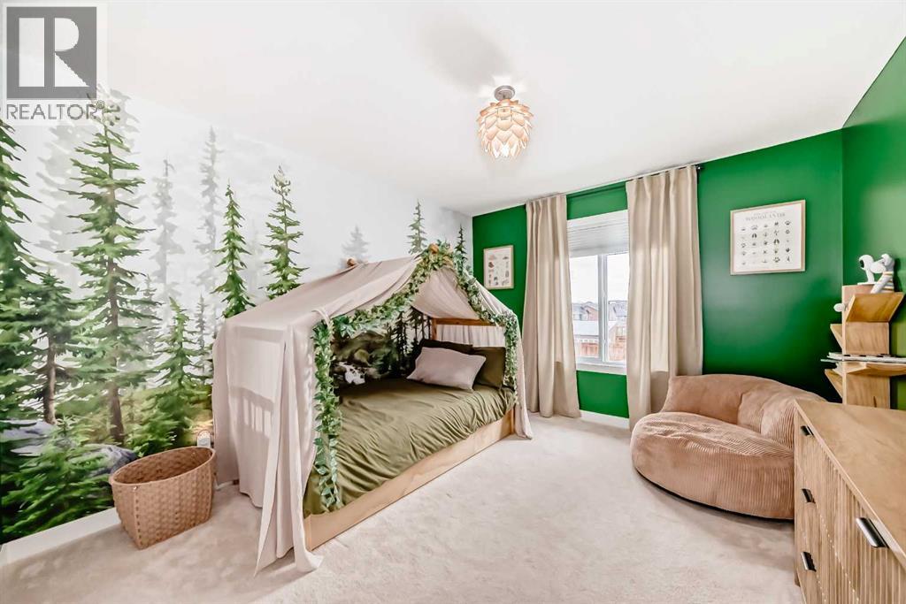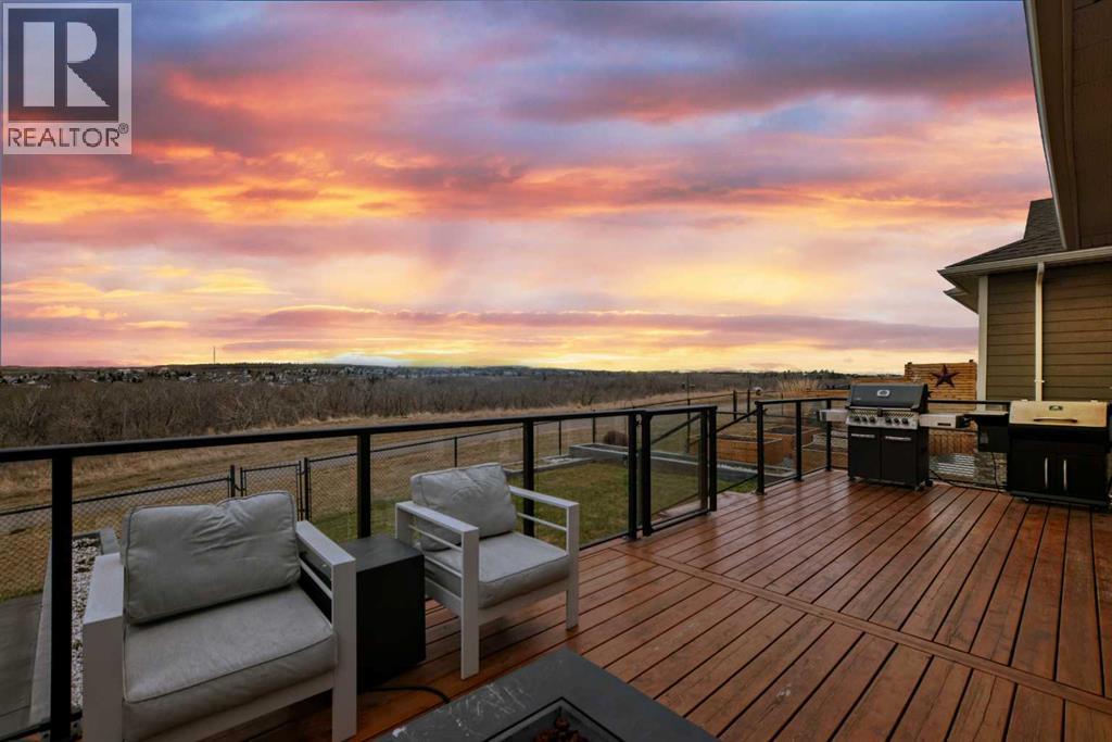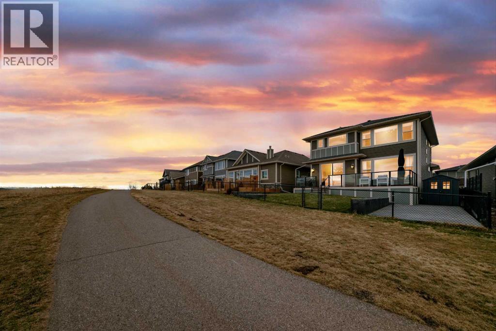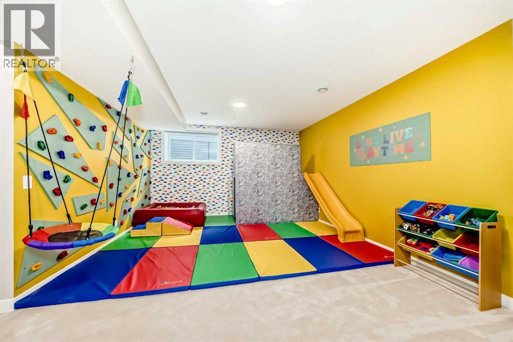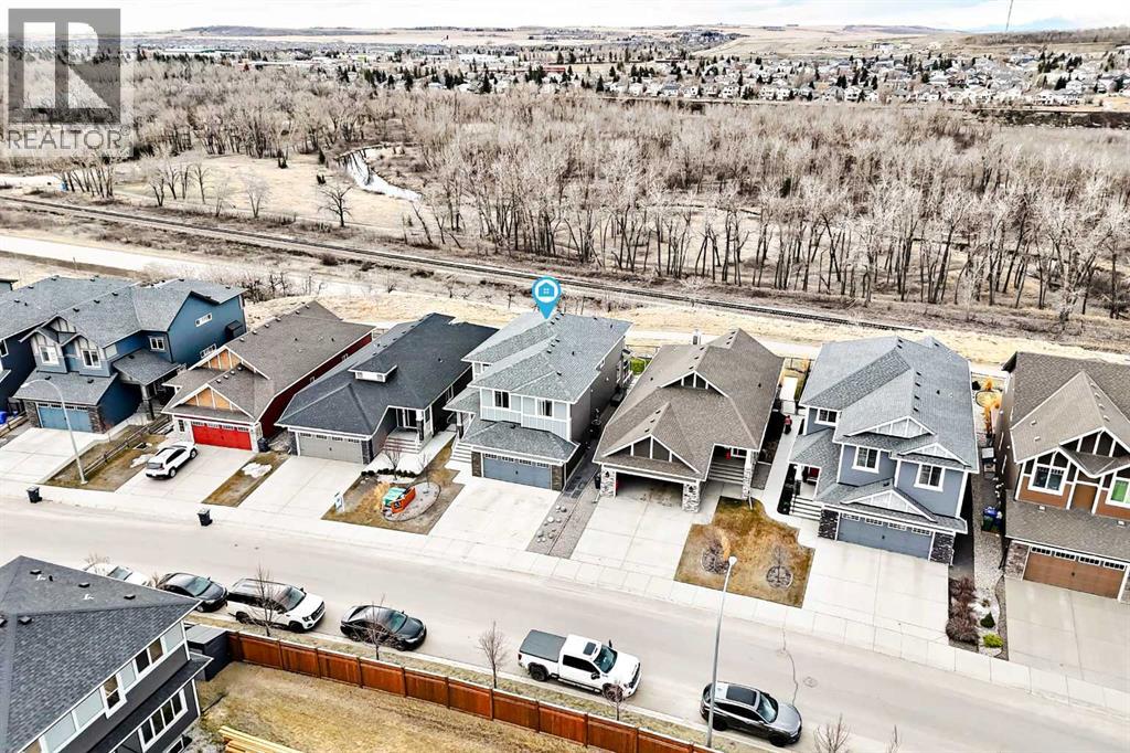 Welcome home! This 2020 Sterling Homes-built masterpiece in Okotoks delivers elevated design, thoughtful upgrades, and a highly functional layout in the quiet, sought-after, family-friendly community of Mountainview. Offering over 3,700 sq. ft. of finished living space, this 2-storey features 5 bedrooms, 4 bathrooms, and a front-attached double garage.The main floor is open, refined, and designed for modern living. A dedicated front office provides a polished work-from-home space, while the mudroom off the garage keeps everyday life organized and efficient. The main living area is bright and expansive, anchored by southwest-facing windows that capture mountain views and flood the home with natural light. The kitchen is a true centrepiece, showcasing a massive quartz island, two-tone cabinetry, premium stainless-steel appliances, and a fully equipped butler’s pantry with bar fridge, additional storage, and prep space. The dining and living areas flow seamlessly together, highlighted by a sleek feature fireplace and extending out to a cedar deck with glass railings—perfect for effortless indoor-outdoor entertaining.Upstairs, vaulted ceilings elevate both the central bonus room and primary suite, creating volume and an enhanced sense of space. The primary retreat is a private sanctuary with Scandinavian-inspired design and unobstructed views of greenspace and mountains. The spa-calibre ensuite features heated tile floors, steam shower with bench and niche, freestanding soaker tub, and a large walk-in closet with custom California Closets built-ins and integrated lighting. Three additional bedrooms are generously sized, finished with custom wainscoting and designer details, and share a well-appointed Jack & Jill bathroom with dual vanities. A dedicated upper laundry room with built-in shelving and folding counter adds everyday convenience.The fully finished basement is designed for both lifestyle and flexibility, offering 9’ ceilings, a spacious rec area, and a cu stom-built kids’ zone complete with climbing wall, castle fort, slide, ball pit, and swing—an exceptional indoor play experience. A fifth bedroom—currently used as a home gym — adds versatility, along with a 2-piece bathroom and rough-in for a future wet bar.Additional features include dual-zone heating, HRV system, and air conditioning for year-round comfort and efficiency.Outside, the home backs directly onto natural green space and walking paths, offering privacy, open views, and a strong connection to nature. Located in a thoughtfully planned community with above-average spacing between homes, this property blends modern design, functional luxury, and an exceptional setting for elevated family living. Don't miss your opportunity to build great memories. Call today for your private showing. (id:63190)