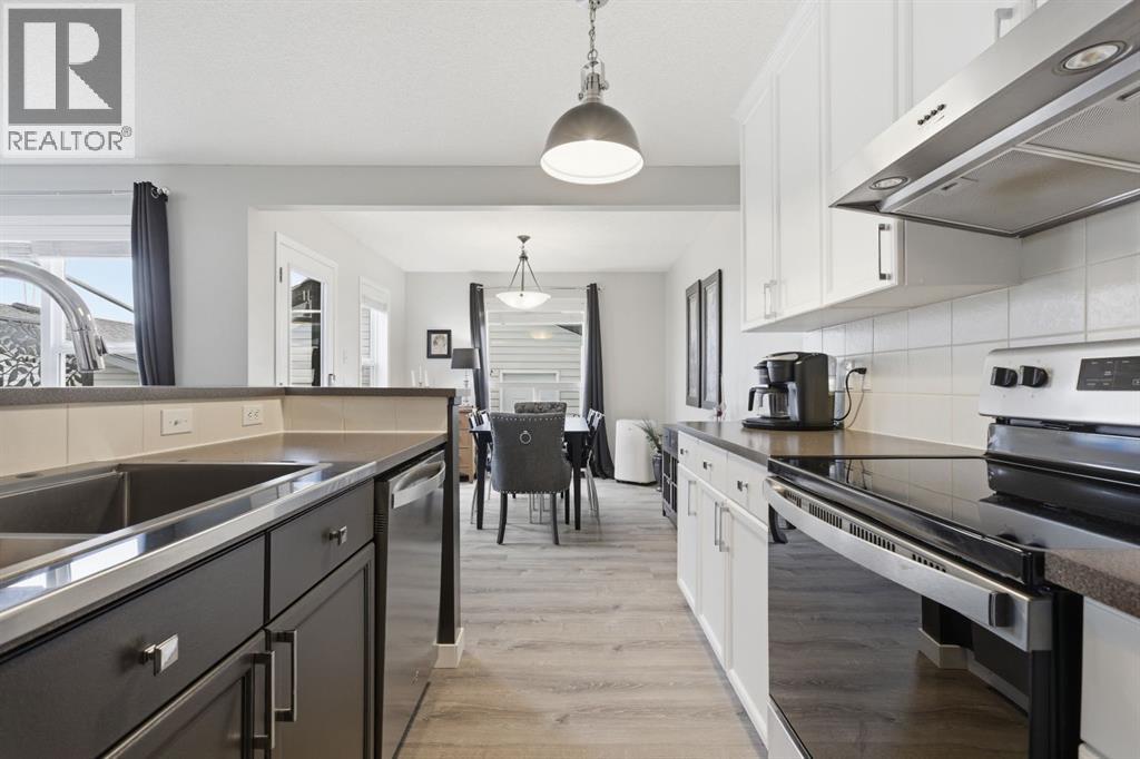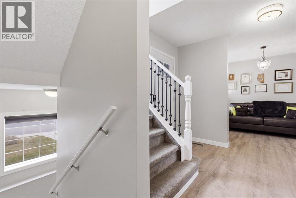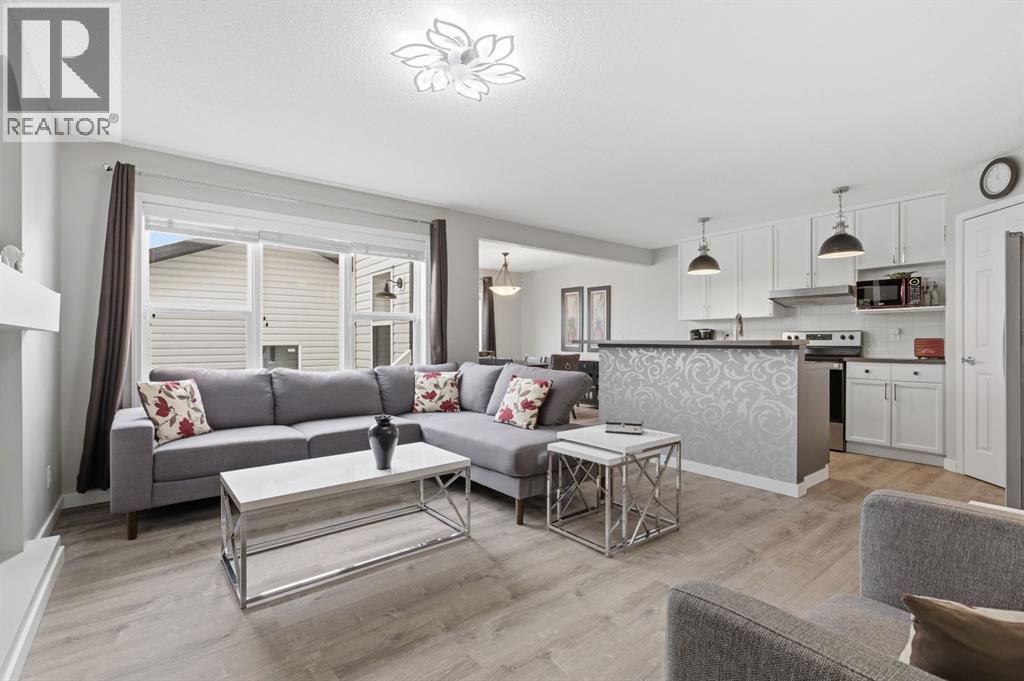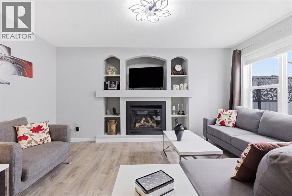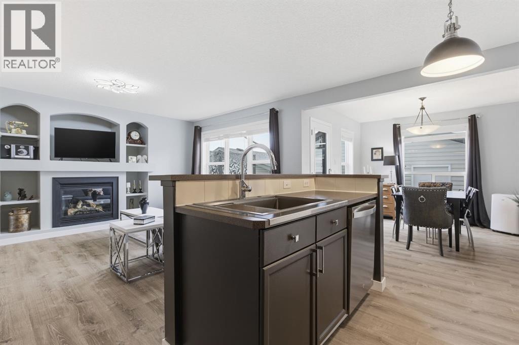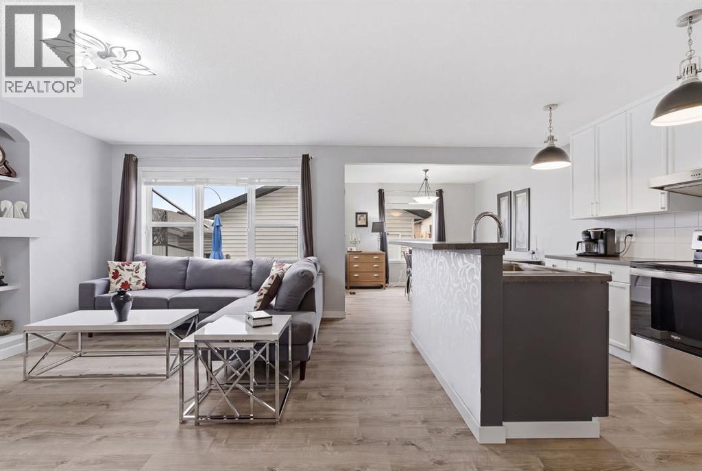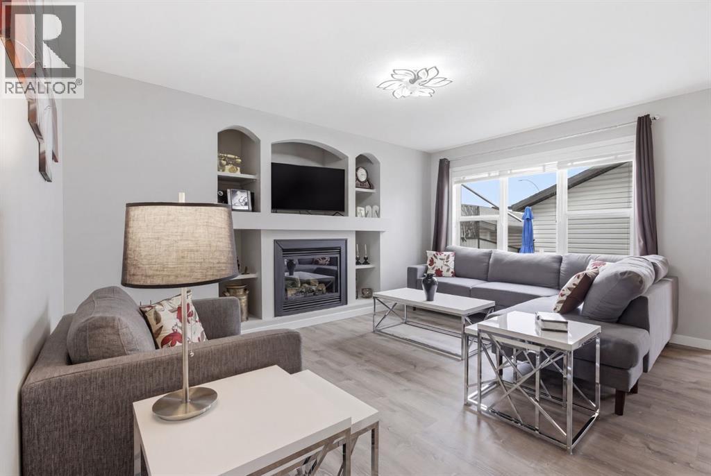 Live in the family friendly community of Cimarron. This cleverly laid out home is situated on a quiet street. As you approach you will appreciate the attractive curb appeal and inviting front porch. Throughout the home, pride of ownership is clear, with plenty of updates such as new vinyl plank flooring, new carpet, a new front door, stylish light fixtures, and an elegant railing. The kitchen is a focal point, boasting cabinets that reach to the ceiling, a tasteful tile backsplash, stainless-steel appliances, and a corner pantry for added storage. The large island seamlessly connects to the expansive living room, which features a gas fireplace with custom built in detail. Adjacent to the kitchen, the dining room is filled with natural light from numerous windows and provides direct access to your private backyard. This low maintenance yard has a large patio, artificial grass, a new fence and a double detached garage. The main floor is complete with a powder room tucked away as well as a front den, perfect for a home office, additional living room or kids’ playroom. Upstairs, you’ll find two generously sized bedrooms, a full 4-piece bathroom, and an expansive primary retreat. The primary suite is a true sanctuary, offering a large walk-in closet and a private ensuite with a luxurious jetted corner tub, separate shower and expansive vanity. The lower level is framed and prepped for easy future development. This home is ideally located within walking distance to schools, parks, pathways, shopping, and professional services. Schedule your private showing or view the virtual tour today. (id:63190)