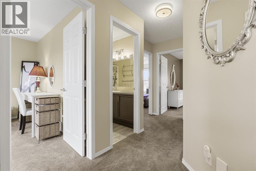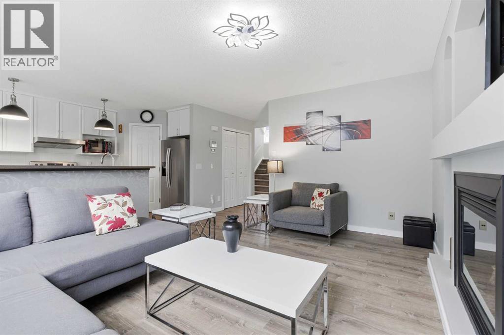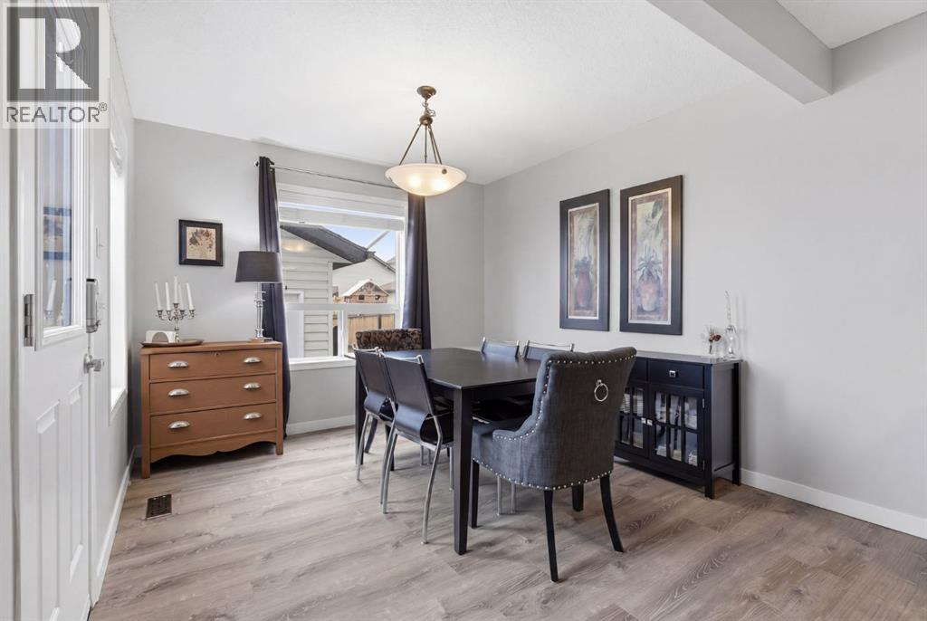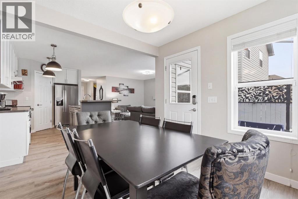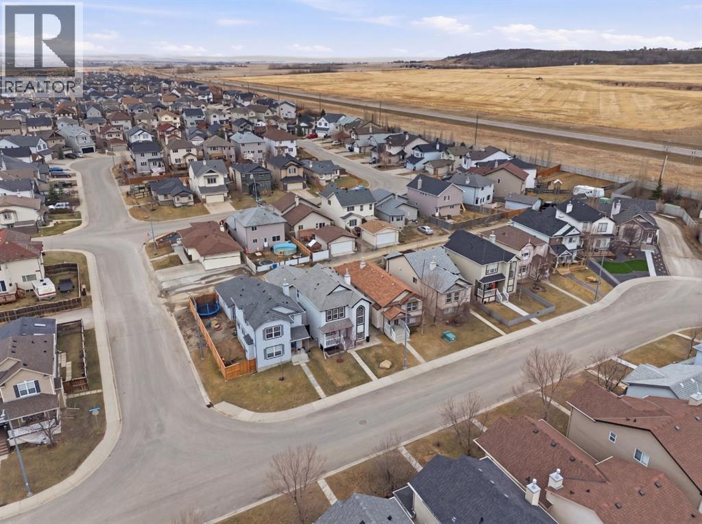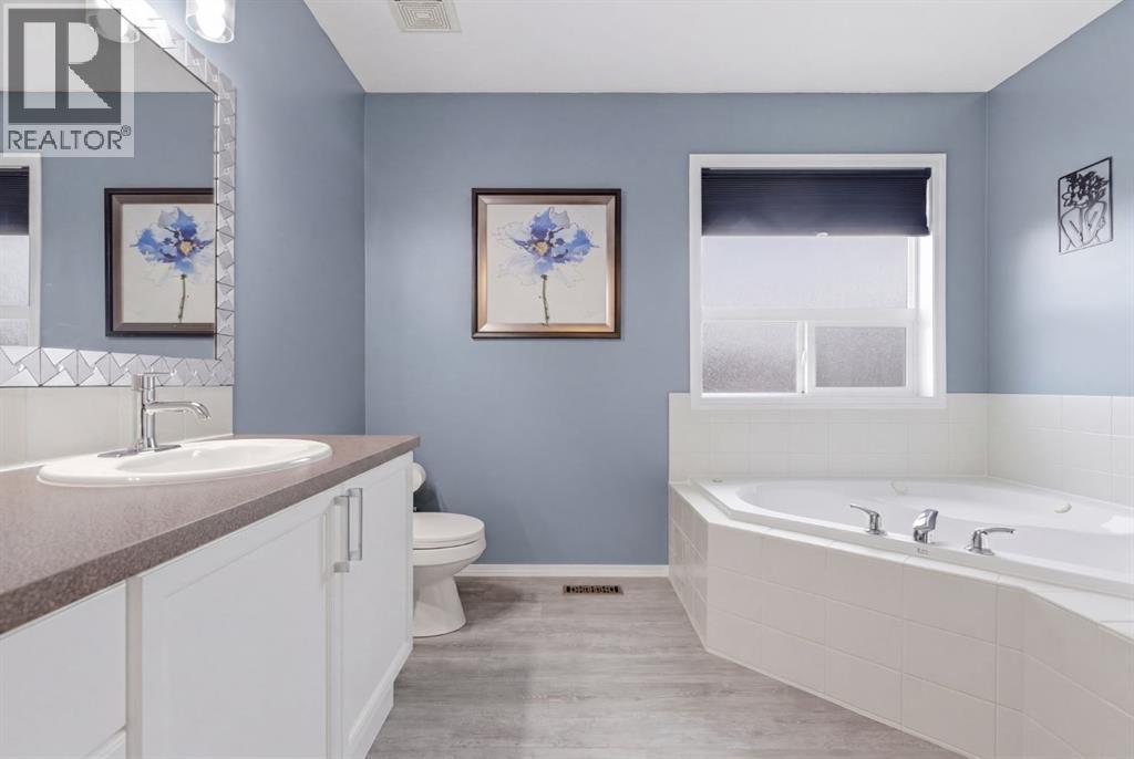 Live in the family friendly community of Cimarron. This cleverly laid out home is situated on a quiet street. As you approach you will appreciate the attractive curb appeal and inviting front porch. Throughout the home, pride of ownership is clear, with plenty of updates such as new vinyl plank flooring, new carpet, a new front door, stylish light fixtures, and an elegant railing. The kitchen is a focal point, boasting cabinets that reach to the ceiling, a tasteful tile backsplash, stainless-steel appliances, and a corner pantry for added storage. The large island seamlessly connects to the expansive living room, which features a gas fireplace with custom built in detail. Adjacent to the kitchen, the dining room is filled with natural light from numerous windows and provides direct access to your private backyard. This low maintenance yard has a large patio, artificial grass, a new fence and a double detached garage. The main floor is complete with a powder room tucked away as well as a front den, perfect for a home office, additional living room or kids’ playroom. Upstairs, you’ll find two generously sized bedrooms, a full 4-piece bathroom, and an expansive primary retreat. The primary suite is a true sanctuary, offering a large walk-in closet and a private ensuite with a luxurious jetted corner tub, separate shower and expansive vanity. The lower level is framed and prepped for easy future development. This home is ideally located within walking distance to schools, parks, pathways, shopping, and professional services. Schedule your private showing or view the virtual tour today. (id:63190)