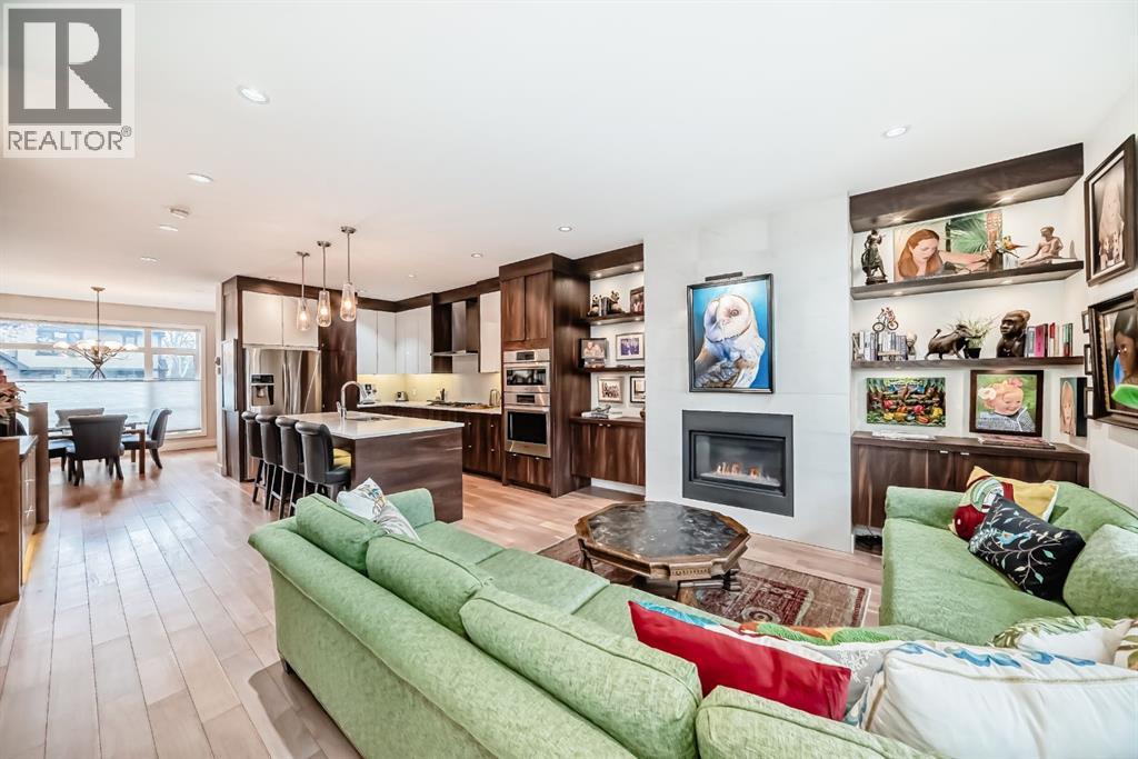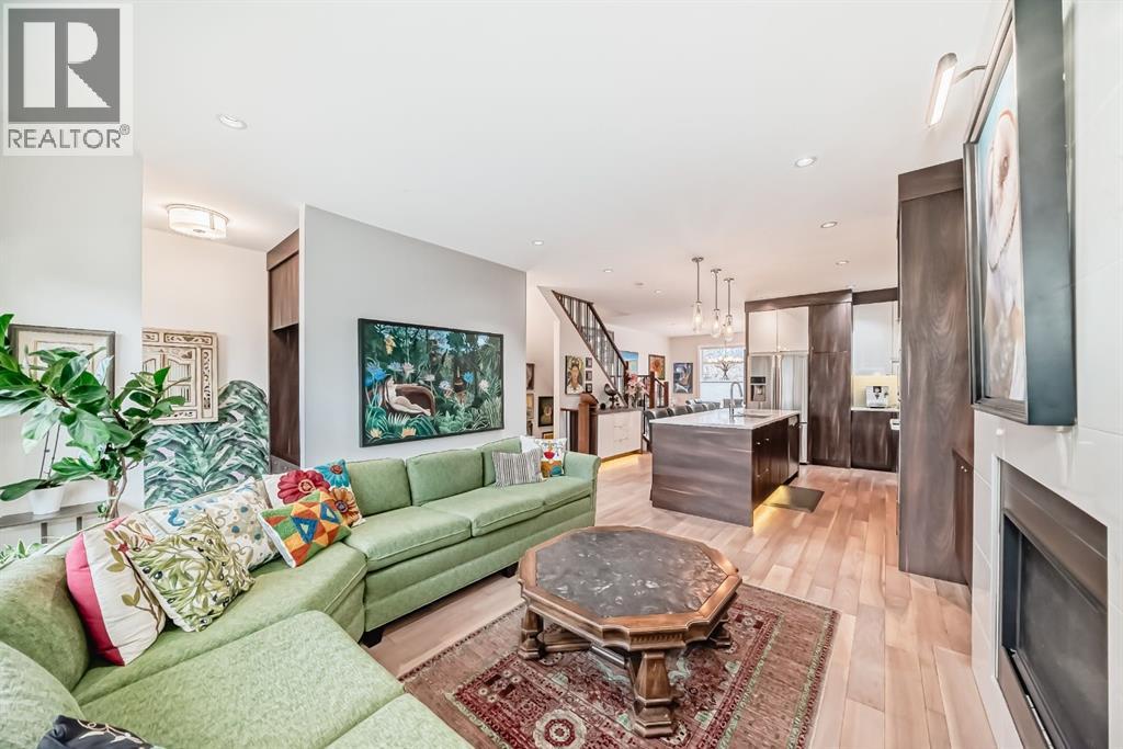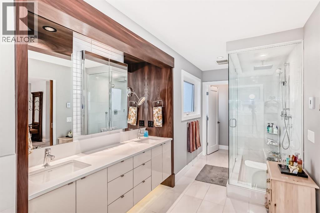 Welcome to this stunning four-bedroom, 3.5-bathroom home in the sought-after inner-city community of Spruce Cliff. Perfectly positioned mid-block on a quiet street, this beautifully designed property offers a sunny south-facing backyard and is just a 10-minute commute to downtown, with easy access to Westbrook amenities, the C-Train, shopping, and nearby golf courses.Offering over 2,300 sq. ft. of developed living space, the open-concept main floor features 9-foot ceilings, wide-plank hardwood flooring, and an abundance of natural light from large windows. The modern kitchen is a true showpiece, complete with a large quartz island, floor-to-ceiling cabinetry, and stainless steel appliances. The inviting great room includes custom built-ins and a gas fireplace, while the functional mudroom leads out to a spacious deck—perfect for entertaining.Upstairs, the luxurious primary suite offers a spa-inspired ensuite with a stunning walk-in shower (roughed-in for steam), a soaker tub, and double vanity. Heated floors are featured in all full bathrooms, adding an extra touch of comfort. The upper level also includes a beautiful skylight that enhances the bright and airy feel.The fully finished basement is designed for both relaxation and entertainment, featuring in-floor heating, a built-in wet bar, roughed in home theatre system, a large bedroom, and an additional four-piece bathroom.Additional highlights include two decks, a double detached garage, roughed-in A/C, landscaped yard, and exceptional curb appeal. Ideally located near Edworthy Park with access to scenic walking and biking paths, this home offers the perfect blend of modern luxury and inner-city convenience. (id:63190)
