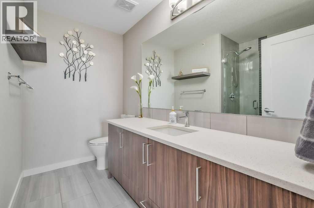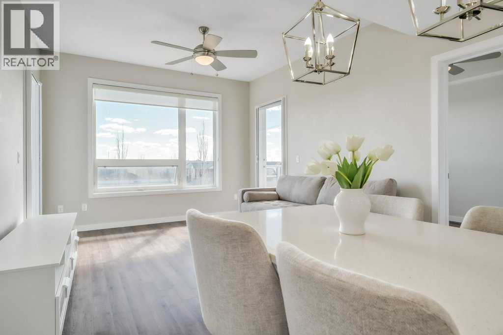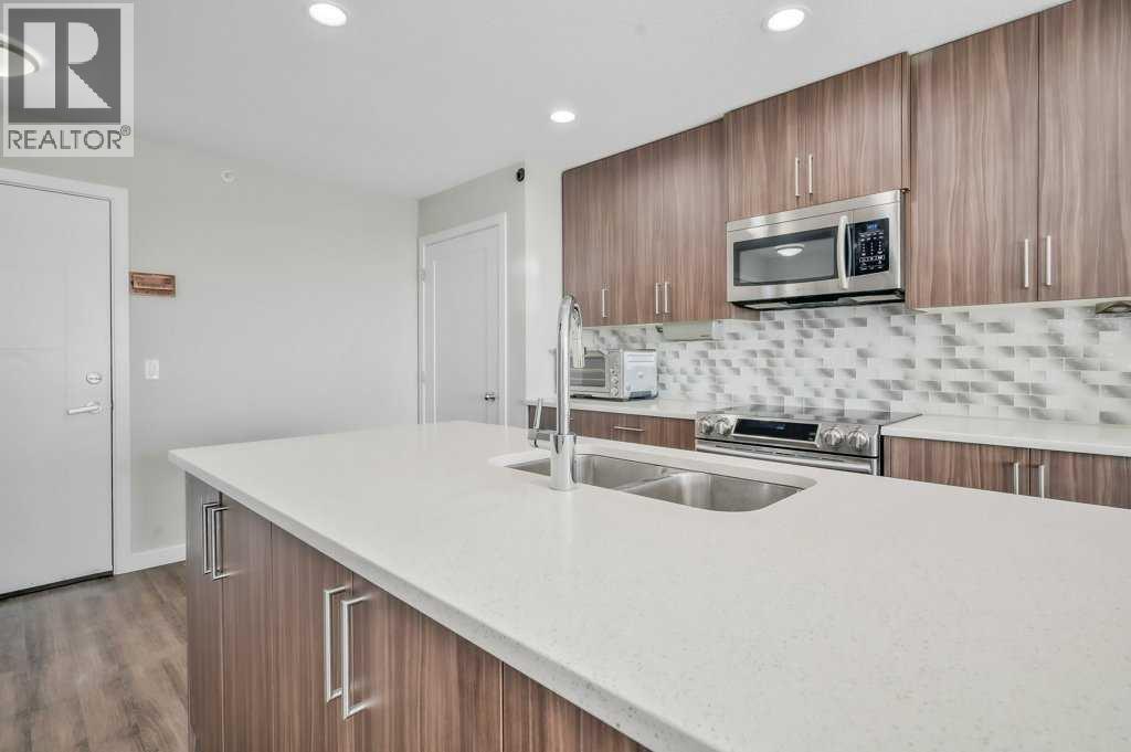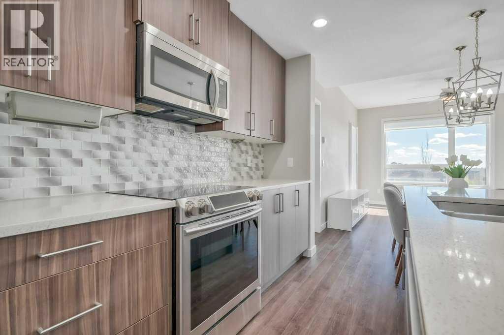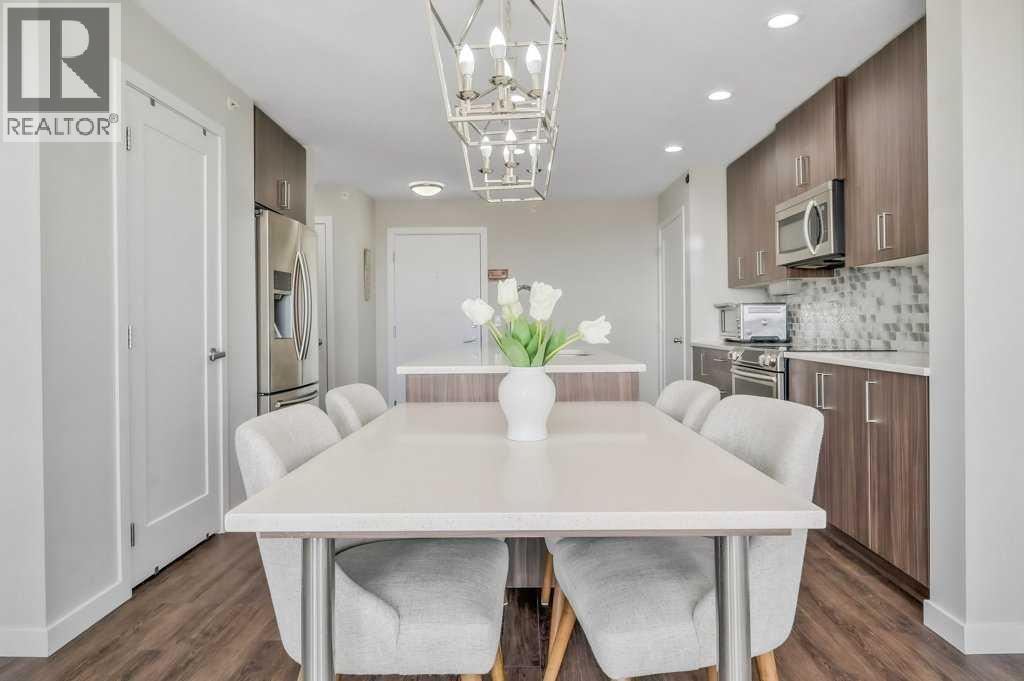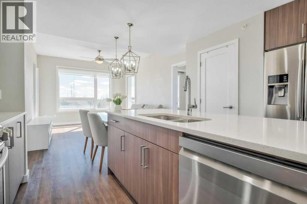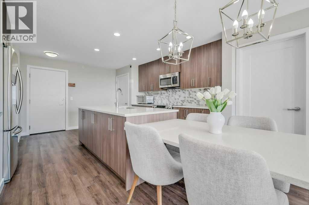 Welcome to the top tier of city living with this CORNER UNIT listing at Vivace! This beautifully designed condo is ideal for anyone aspiring to dwell on the TOP FLOOR with unbeatable views, offering a bright and airy east-facing exposure.Step inside to discover an open floor plan accentuated by high-end laminate flooring that adds a touch of elegance to the living areas. The kitchen is a culinary dream featuring rich, dark cabinetry paired with light-coloured countertops and a sizable island that seamlessly incorporates a built-in quartz dining bar – perfect for serving up morning pancakes or evening cocktails.The condo comprises two spacious bedrooms updated with new luxury vinyl plank flooring, offering vast space for relaxation and rejuvenation. The primary bedroom not only provides ample room but also boasts an ensuite designed for ultimate pampering, equipped with an expansive shower adorned with exquisite tile work and complementary quartz counters.Elevate your morning routine on one of the two balconies, where breathtaking sunrise views establish an enchanting backdrop for your early coffee moments. These balconies are sanctuaries for either embracing the calm morning rays or enjoying a tranquil book-reading session as dusk falls, each offering a serene green space outlook.The convenience doesn’t stop there; the unit includes a tandem parking stall for two vehicles and a separate storage locker to keep your space organized and clutter-free.Situated close to premier shopping centers, frequent transit options, and the newly inaugurated segment of the ring road, this condo provides a seamless and efficient lifestyle. Whether you are a professional desiring a peaceful yet connected habitat, or a small family in pursuit of comfort and convenience, this property meets all your needs.Don’t let this unique opportunity slip by to own this impeccable condo and elevate your lifestyle. It's more than a mere residence; it’s a step up in life. Call today for mo re information!! (id:63190)