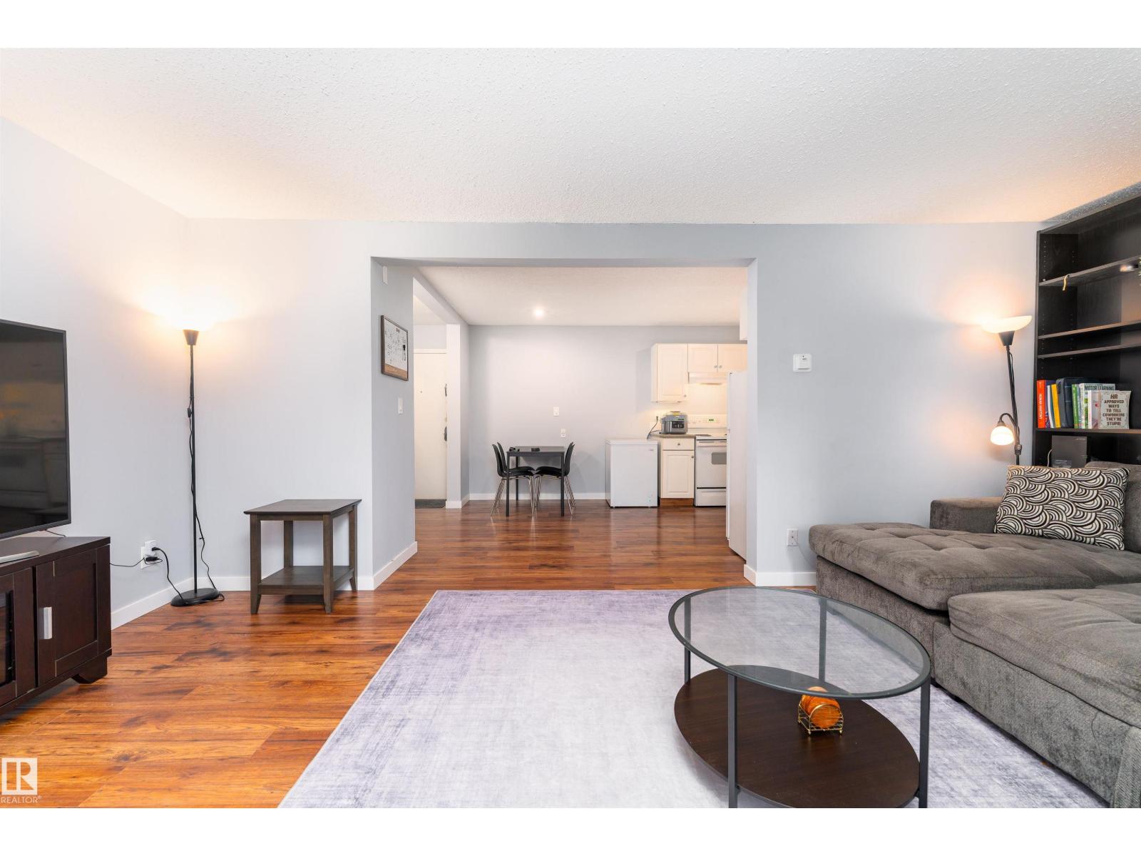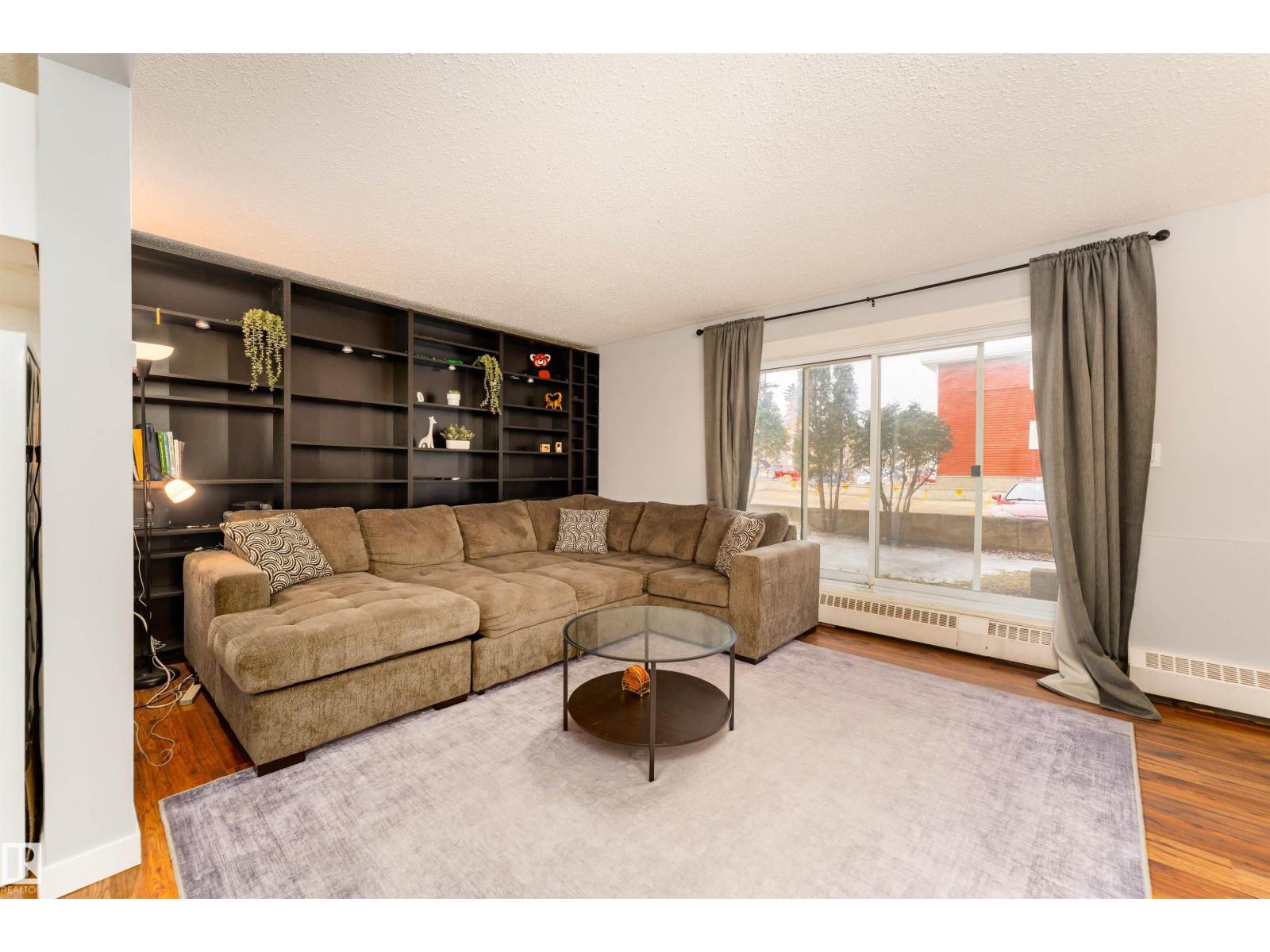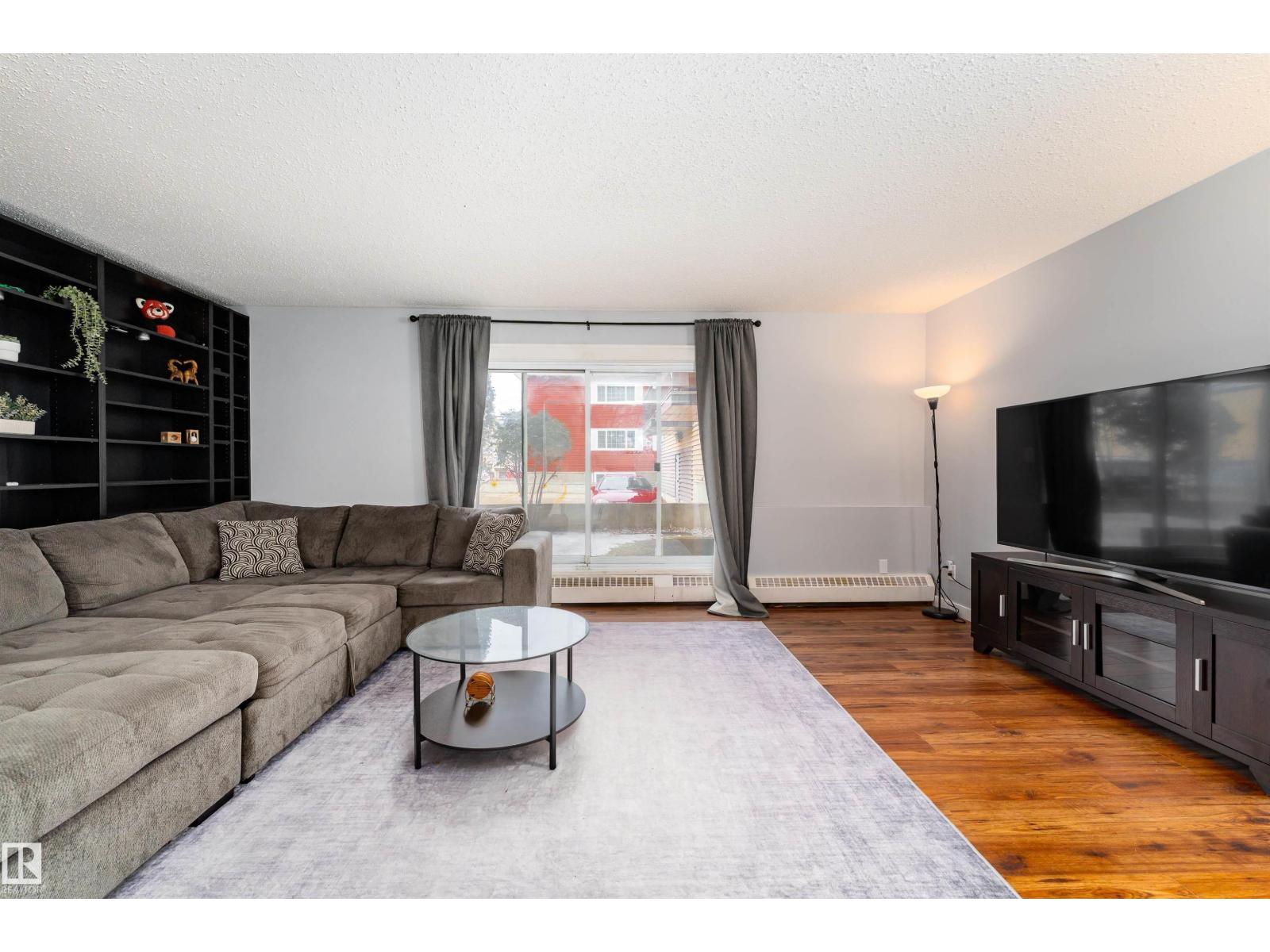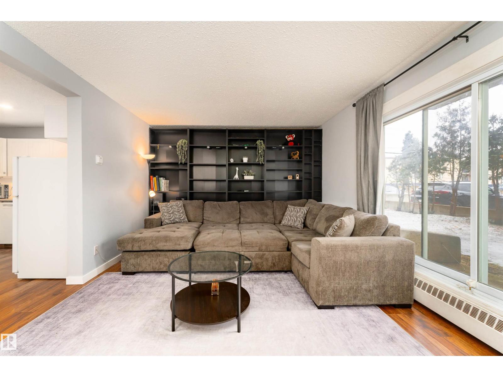 Ground-floor living at its finest in this bright and inviting 790 sq ft 1-bed, 1-bath home! Warm wood-tone flooring flows throughout, creating a space that feels fresh, bright, and effortlessly welcoming from the moment you enter. The crisp, modern kitchen with white cabinetry and matching appliances connects to a dedicated dining area—ideal for everyday meals or entertaining. The sun-filled living room features a custom floor-to-ceiling dark built-in shelving unit and expansive sliding glass doors leading to your private patio, blending indoor and outdoor living. The spacious primary bedroom comfortably fits a king-sized suite with room for additional furnishings. Ideally located just minutes from MacEwan University, downtown shopping, transit, the river valley, and Commonwealth Stadium, this home offers unbeatable convenience. Perfect for students, first-time buyers, or investors, this 18+ adult-only, pet-friendly building includes an assigned parking stall and delivers a truly walkable lifestyle. (id:63190)