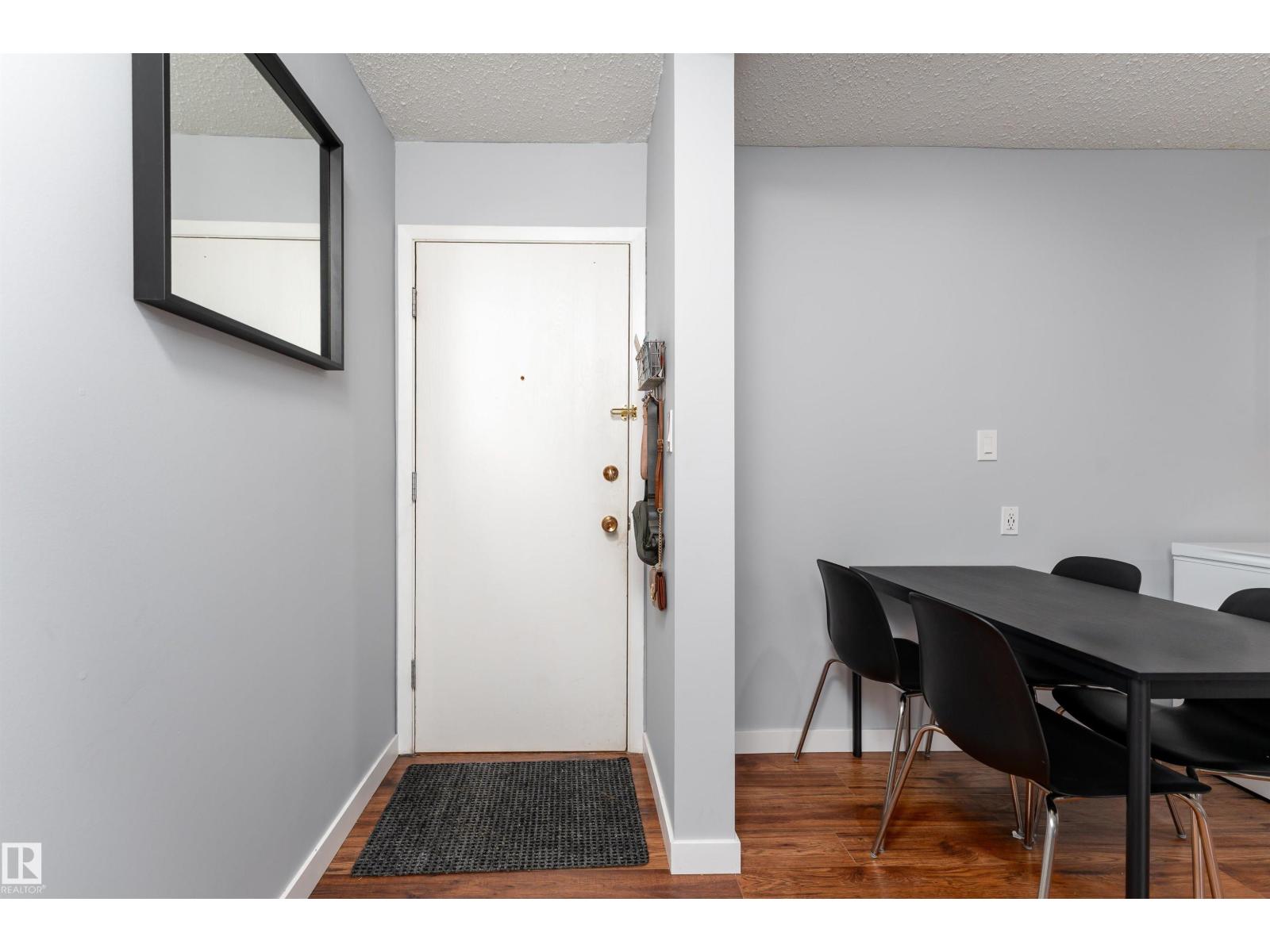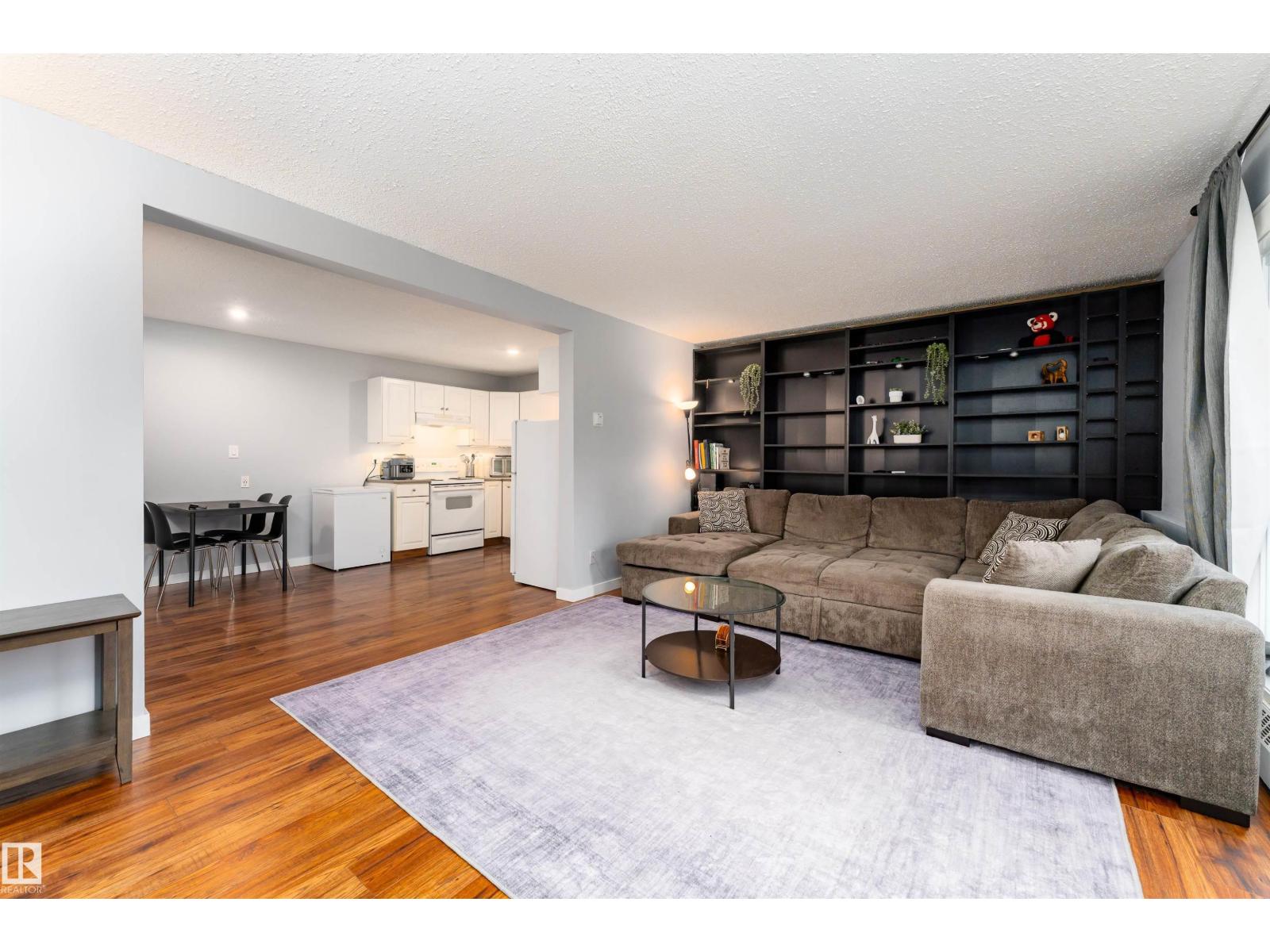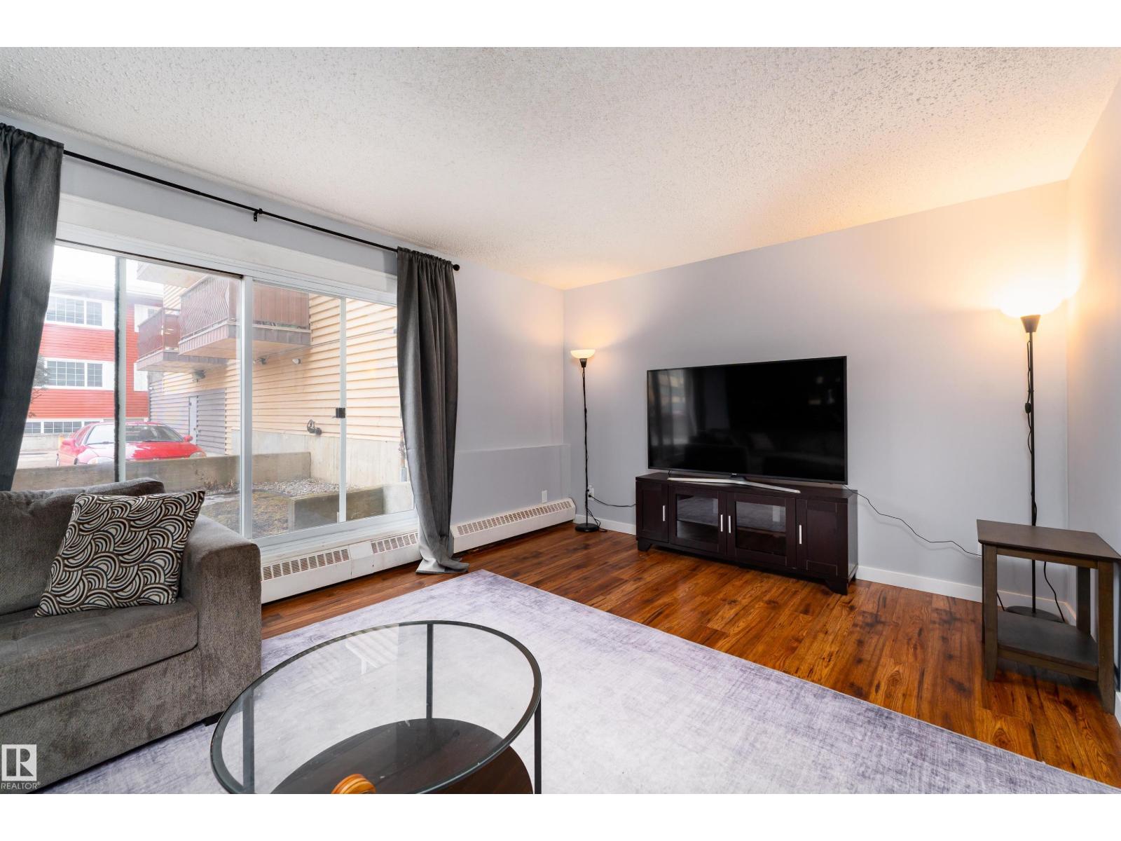 Ground-floor living at its finest in this bright and inviting 790 sq ft 1-bed, 1-bath home! Warm wood-tone flooring flows throughout, creating a space that feels fresh, bright, and effortlessly welcoming from the moment you enter. The crisp, modern kitchen with white cabinetry and matching appliances connects to a dedicated dining area—ideal for everyday meals or entertaining. The sun-filled living room features a custom floor-to-ceiling dark built-in shelving unit and expansive sliding glass doors leading to your private patio, blending indoor and outdoor living. The spacious primary bedroom comfortably fits a king-sized suite with room for additional furnishings. Ideally located just minutes from MacEwan University, downtown shopping, transit, the river valley, and Commonwealth Stadium, this home offers unbeatable convenience. Perfect for students, first-time buyers, or investors, this 18+ adult-only, pet-friendly building includes an assigned parking stall and delivers a truly walkable lifestyle. (id:63190)