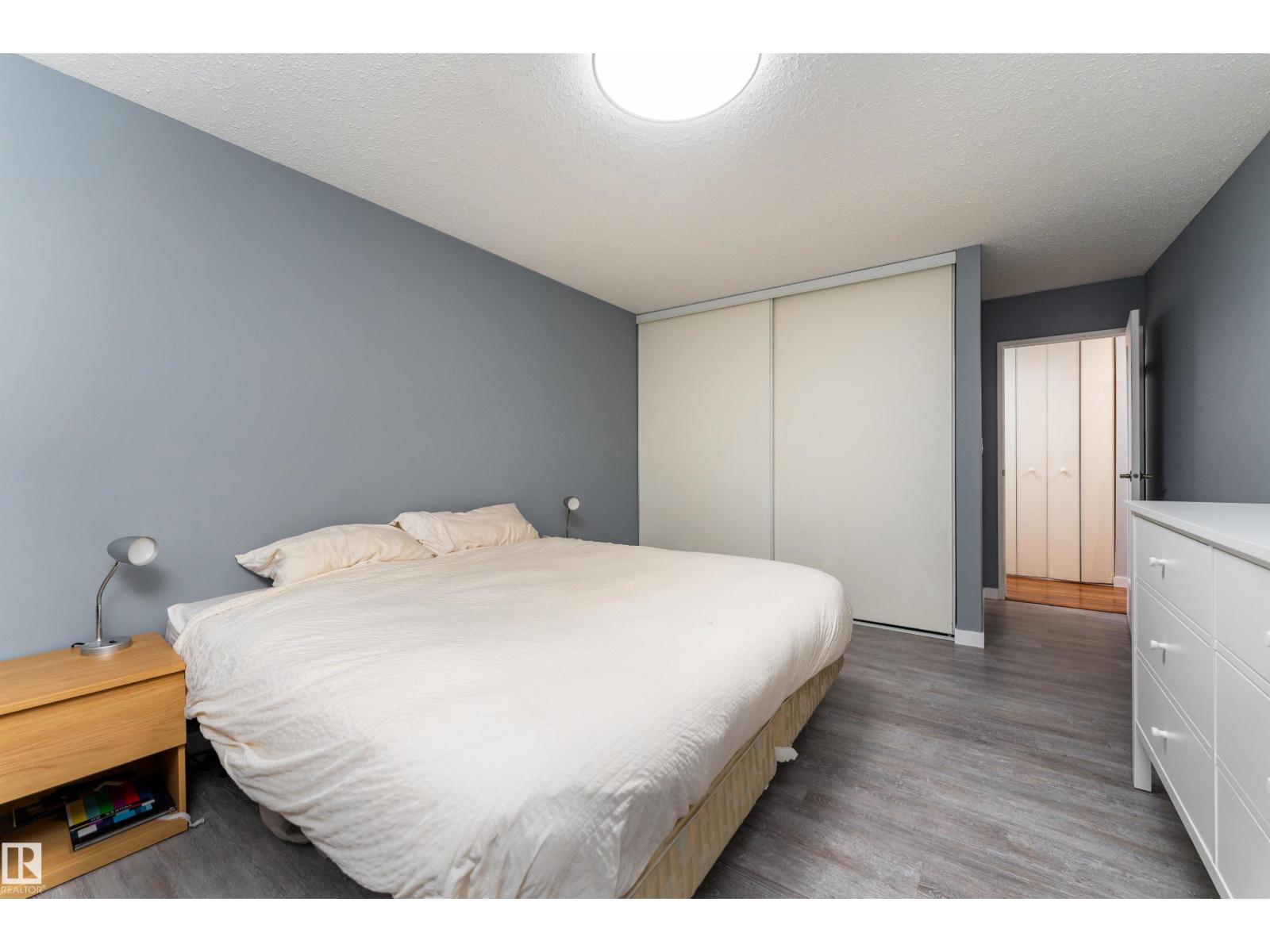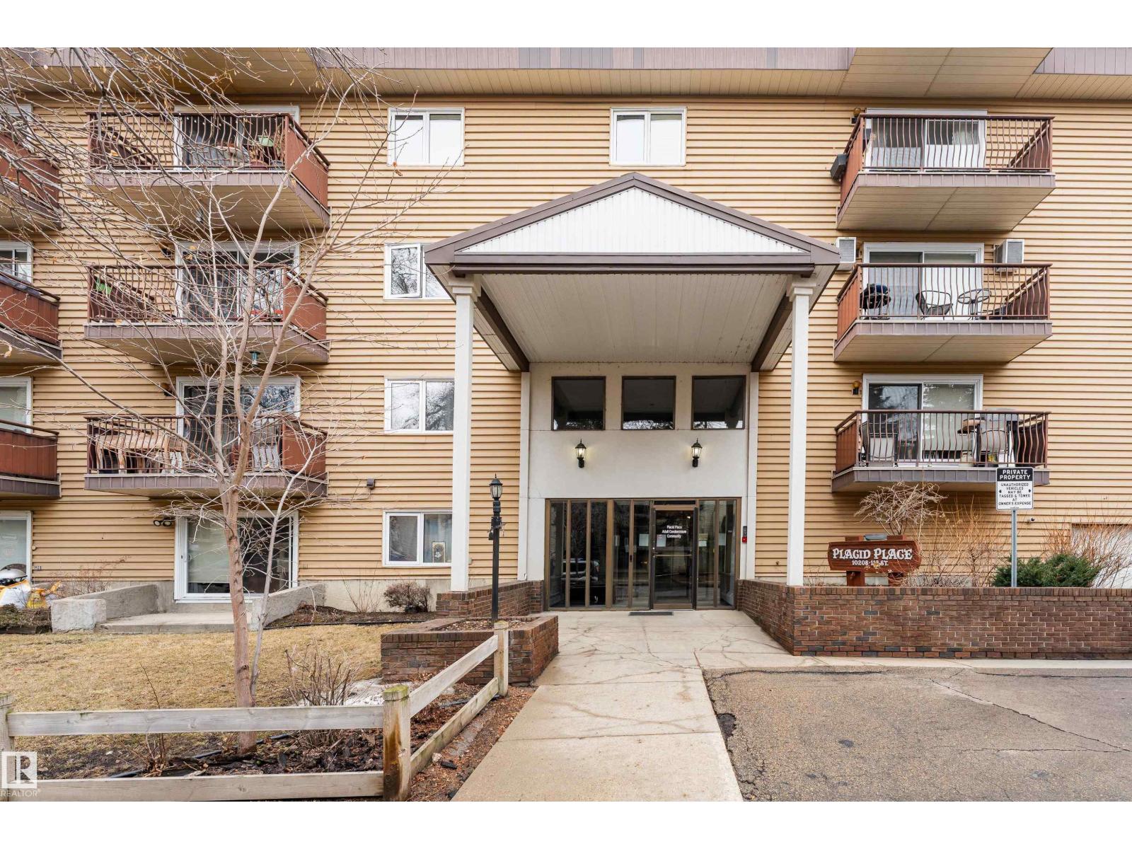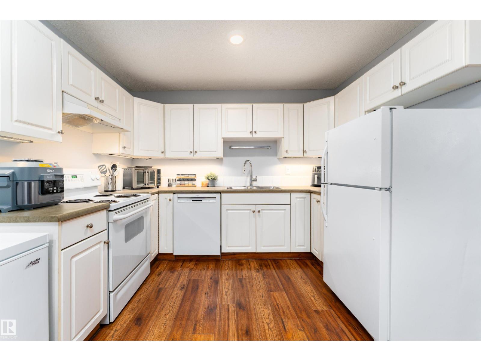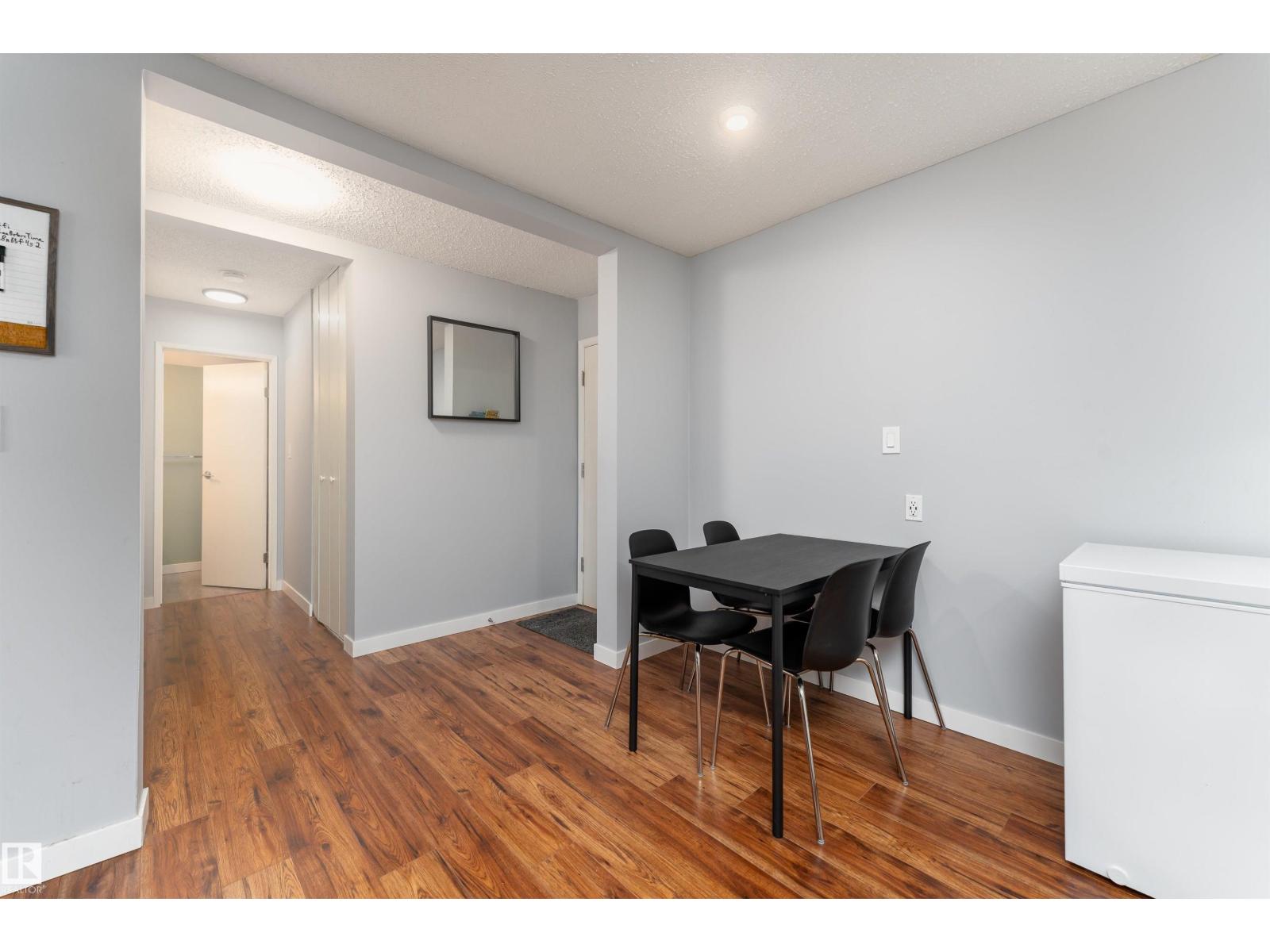 Ground-floor living at its finest in this bright and inviting 790 sq ft 1-bed, 1-bath home! Warm wood-tone flooring flows throughout, creating a space that feels fresh, bright, and effortlessly welcoming from the moment you enter. The crisp, modern kitchen with white cabinetry and matching appliances connects to a dedicated dining area—ideal for everyday meals or entertaining. The sun-filled living room features a custom floor-to-ceiling dark built-in shelving unit and expansive sliding glass doors leading to your private patio, blending indoor and outdoor living. The spacious primary bedroom comfortably fits a king-sized suite with room for additional furnishings. Ideally located just minutes from MacEwan University, downtown shopping, transit, the river valley, and Commonwealth Stadium, this home offers unbeatable convenience. Perfect for students, first-time buyers, or investors, this 18+ adult-only, pet-friendly building includes an assigned parking stall and delivers a truly walkable lifestyle. (id:63190)