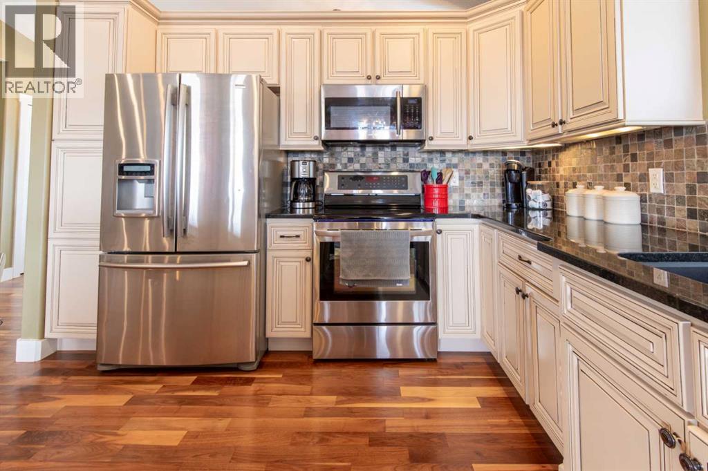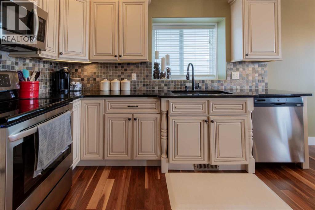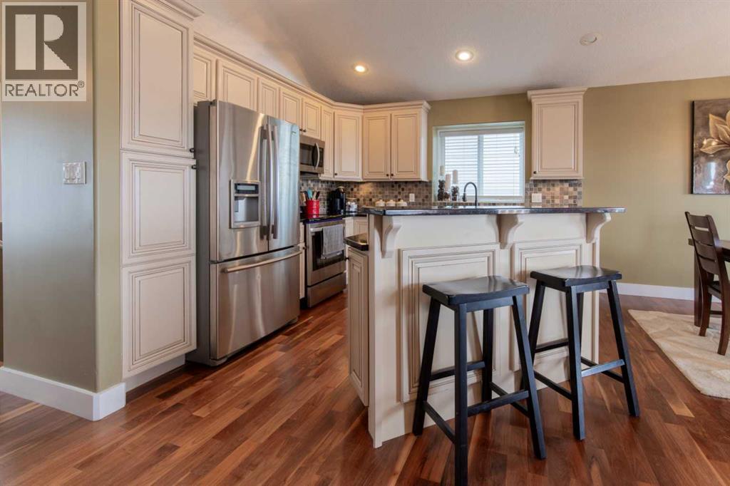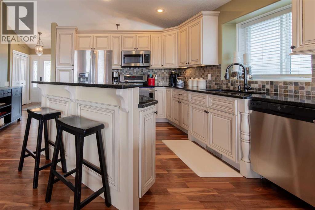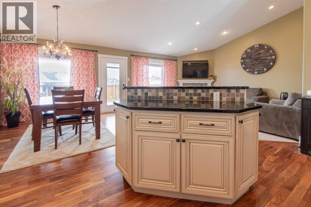 Step into a quiet cul-de-sac where neighbors still wave and daily life feels calm and grounded. This walk-out bungalow delivers the space and flexibility you’ve been looking for, with a layout designed to keep up with real life.From the moment you pull up, the curb appeal draws you in. Inside, vaulted ceilings and an open-concept design create a bright, expansive feel that invites you to settle in right away. The great room anchors the home with a cozy fireplace, perfect for slow evenings or hosting the people who matter most.The kitchen is built for both movement and gathering, with granite countertops, a raised eating bar, and seamless flow into the dining area. It’s where meals come together, conversations happen, and routines take shape. Hardwood floors add warmth and give you the opportunity to refinish and elevate the space to your style.Head out to the covered deck and start your mornings with coffee or wind down in the evening overlooking the yard. Downstairs, the fully developed walk-out basement opens the door to more. Set up a media space, host guests, or explore future suite potential with municipal approval.With 4 bedrooms and 3 full bathrooms, there’s room to grow, host, and adapt as life evolves. Laundry hook-ups on both levels give you options that work for your routine.With a playground and school just steps away, and a neighborhood known for its welcoming feel, this is a place where daily life flows with ease.This isn’t just somewhere to live. It’s a space to move into, make your mark, and start your next chapter. (id:63190)