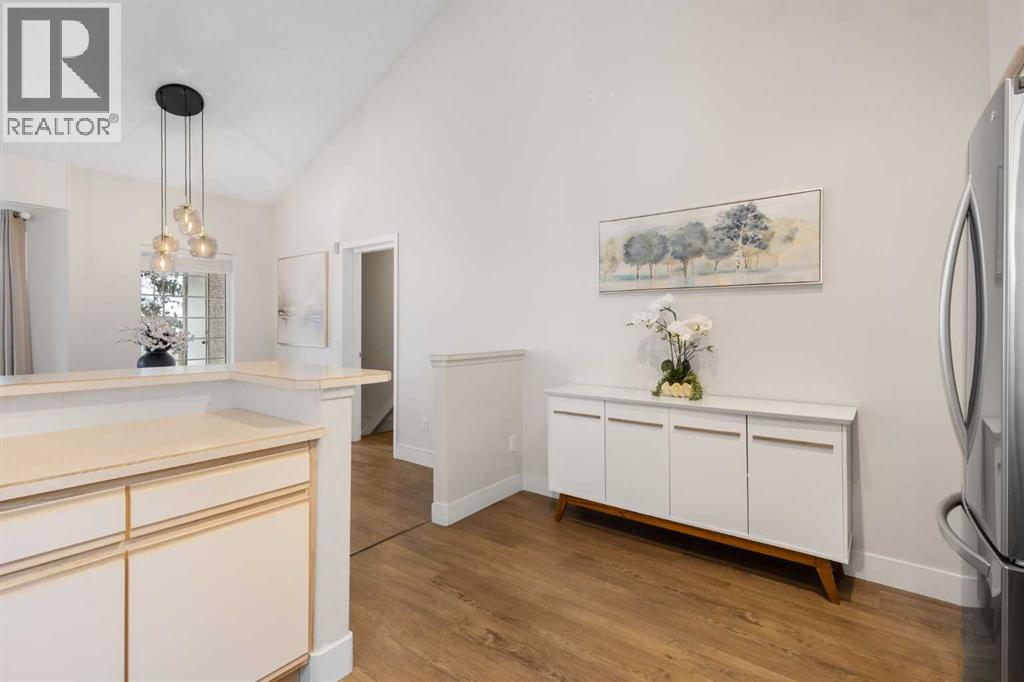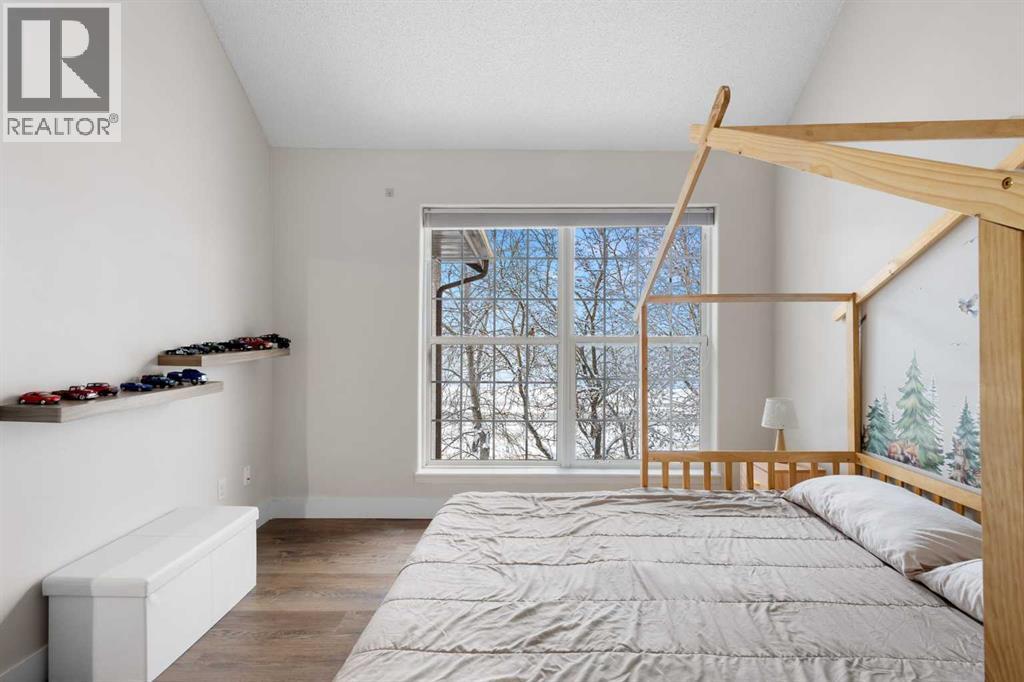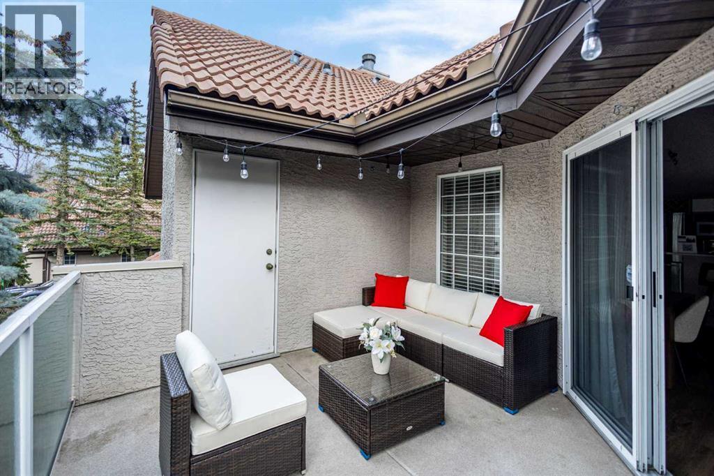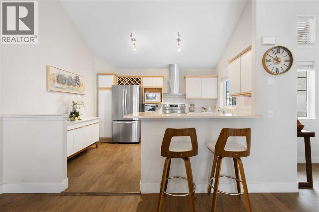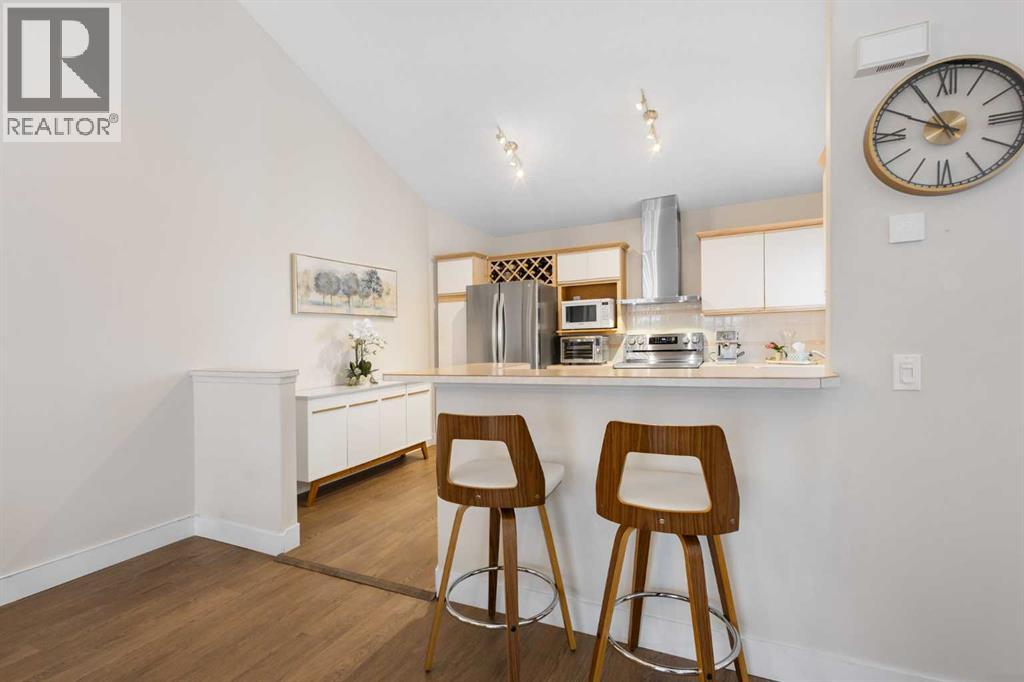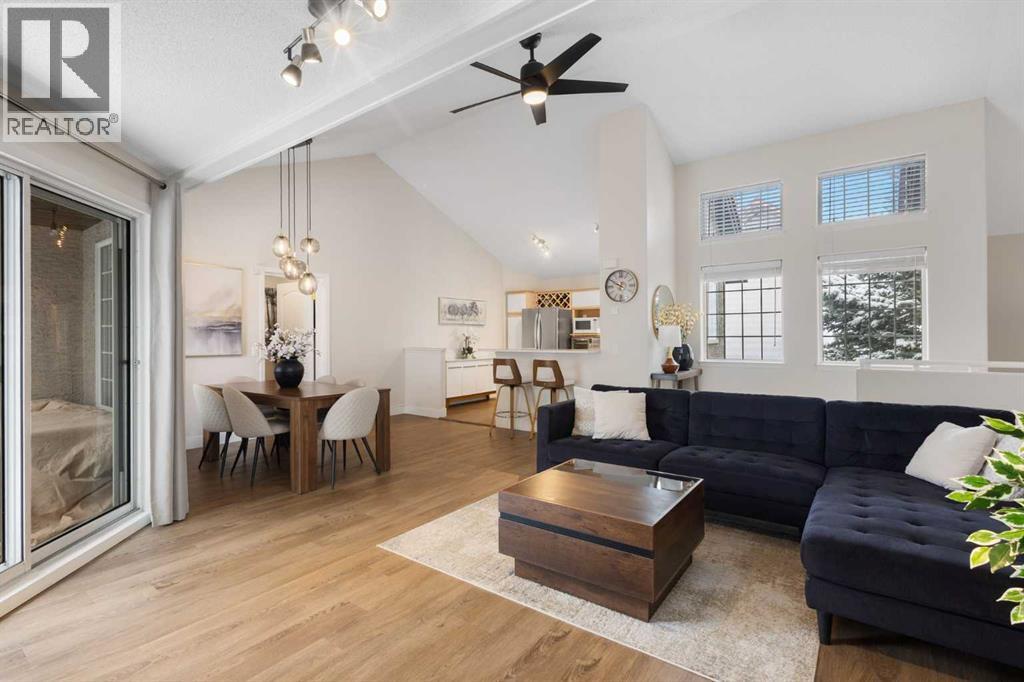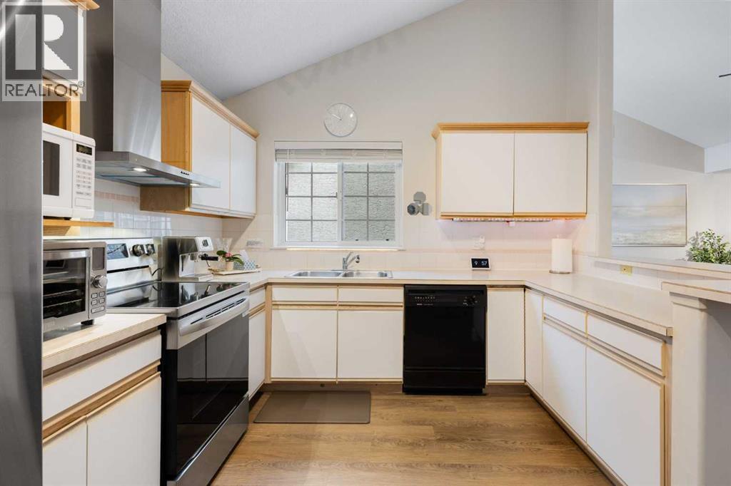 Wake up in Cactus Ridge and the first thing you notice is the light. Vaulted ceilings and oversized windows pull sun straight through the main floor — the kind of quiet, bright space that makes a Saturday morning coffee last twice as long.This upper-level stacked townhouse in Signal Hill overlooks Optimistic Park instead of a neighbour's window. That view is one of the reasons the current owners bought it. A wood-burning fireplace anchors the living room, and the whole space opens to a private balcony with a 25 sq ft storage room tucked off to the side.1,221 sq ft, two bedrooms, two full bathrooms, and a floor plan that separates the primary from the second bed — the setup works for a dedicated home office, a guest room, or in-laws who stay a weekend. The primary has a 4-piece ensuite, walk-in closet, and a replaced bedroom window. The second bedroom sits across the plan with its own 3-piece bath.Underfloor heating runs through the entire home and into the attached garage. Warm floors from November through April, a low-dust, low-allergen environment, and a car you don't have to scrape at 7 a.m. in February.Recent updates from the sellers: full kitchen appliance package, washer and dryer, keypad front entry, security cameras at the door, balcony, and garage, a camera doorbell, new faucets and showerheads in both baths, LED stair lighting, digital thermostat, and new blinds on every window. Both bedroom windows have also been replaced.The home is pet-free and smoke-free — something allergy-sensitive buyers notice the moment they walk in.Outside the door: Sunterra Market, Starbucks, West Market Square, medical, dental, pharmacies, and the Bow River pathways are all inside a five-minute walk. Signal Hill and West Hills Shopping Centres are seven minutes by car. The complex has a private clubhouse residents actually use for gatherings, plus assigned parking directly beside the unit and ample visitor stalls.Move-in ready, with all furniture and décor available for separate purchase. Book a private showing or catch the open house. (id:63190)