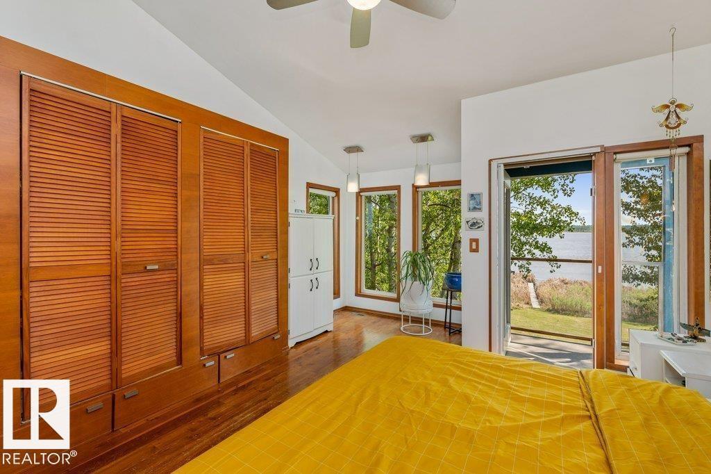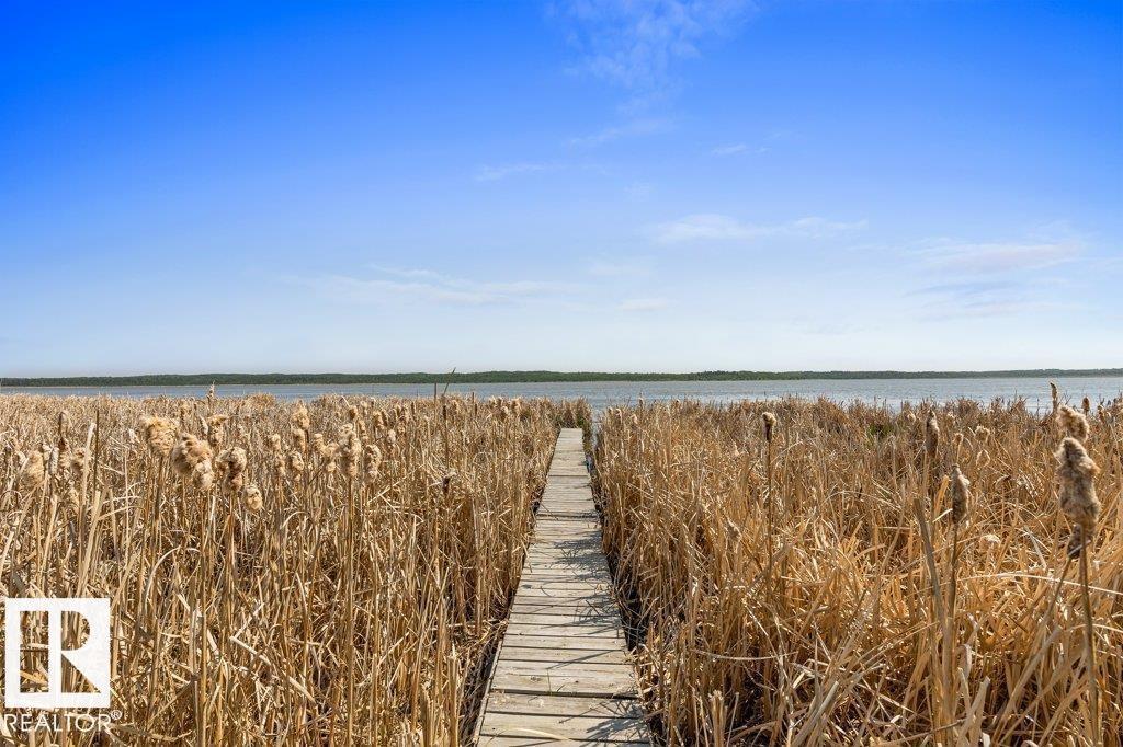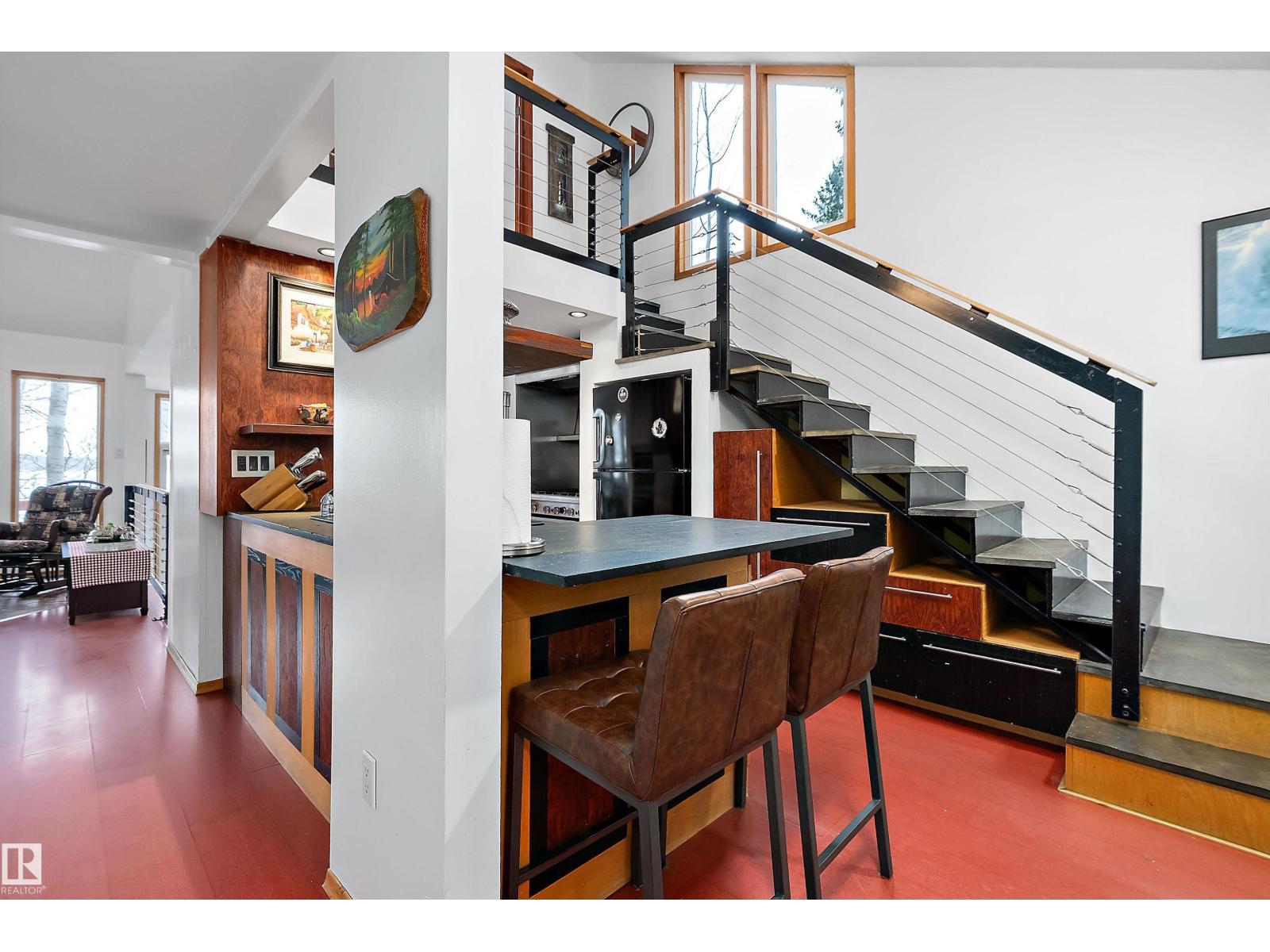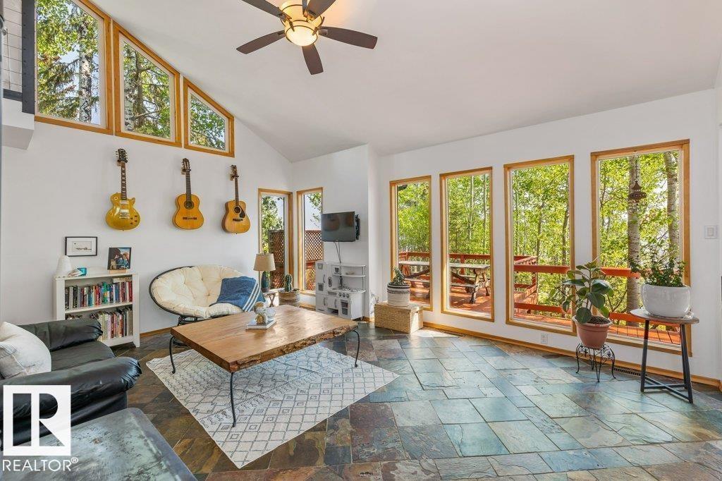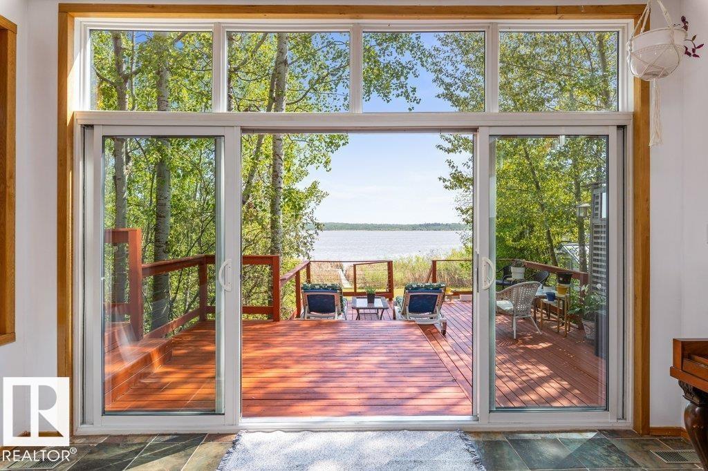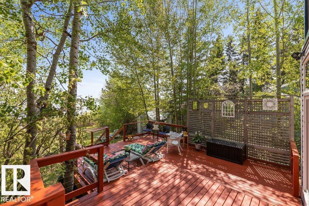 Beautiful, secluded lakefront home! Backing onto quiet Sandy Lake just 30 minutes from Edmonton, at the end of a cul-de-sac with walls of windows to appreciate the serene views over the tiered decks, through the sheltering trees & lawn, to the reeds of your own lake access. Inside, this 1991 2-storey has soaring open vault ceilings so that the views can be appreciated from both floors. Gorgeous slate counters & tile floors, a wood stove for cozy winter nights, gas range in the kitchen, main floor laundry & bathroom, as well as a main floor bedroom. The primary bedroom upstairs has it’s own private balcony looking onto the lake; there’s a 3rd bedroom upstairs, and a quaint bathroom with tiled steam shower & soaker tub. Comes with an attached double tandem garage with additional storage above, work bench, cabinets and additional parking in front for boat/RV/trailer. With a low maintenance metal roof & cistern with potable water, you’ve got all the amenities with the lifestyle you’ve been dreaming of! (id:63190)