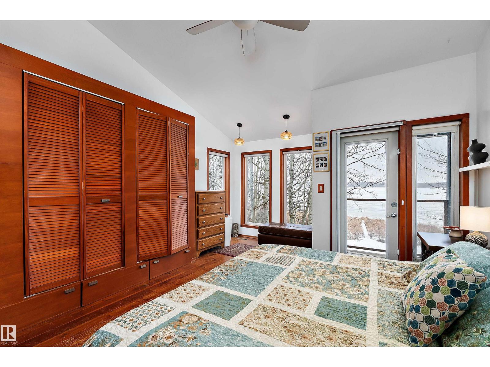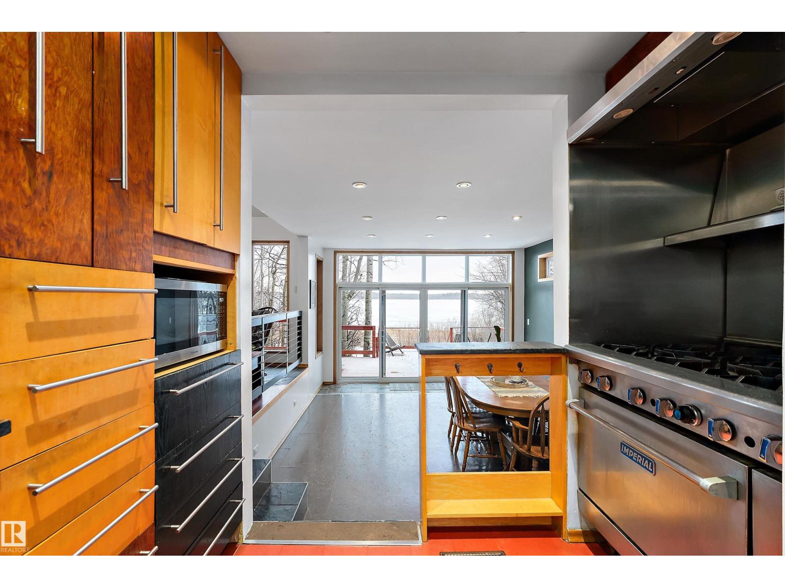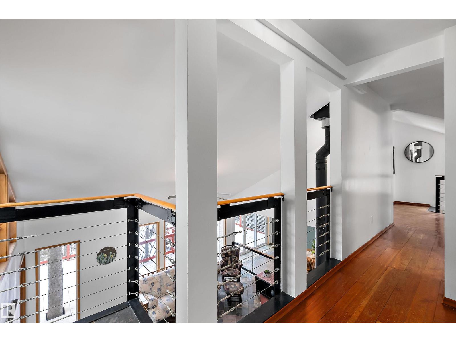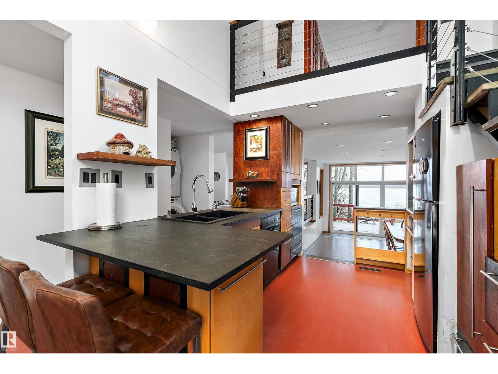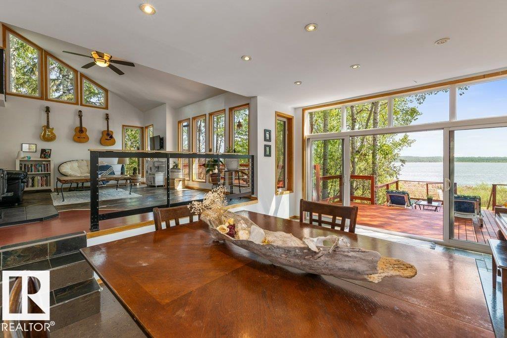 Beautiful, secluded lakefront home! Backing onto quiet Sandy Lake just 30 minutes from Edmonton, at the end of a cul-de-sac with walls of windows to appreciate the serene views over the tiered decks, through the sheltering trees & lawn, to the reeds of your own lake access. Inside, this 1991 2-storey has soaring open vault ceilings so that the views can be appreciated from both floors. Gorgeous slate counters & tile floors, a wood stove for cozy winter nights, gas range in the kitchen, main floor laundry & bathroom, as well as a main floor bedroom. The primary bedroom upstairs has it’s own private balcony looking onto the lake; there’s a 3rd bedroom upstairs, and a quaint bathroom with tiled steam shower & soaker tub. Comes with an attached double tandem garage with additional storage above, work bench, cabinets and additional parking in front for boat/RV/trailer. With a low maintenance metal roof & cistern with potable water, you’ve got all the amenities with the lifestyle you’ve been dreaming of! (id:63190)