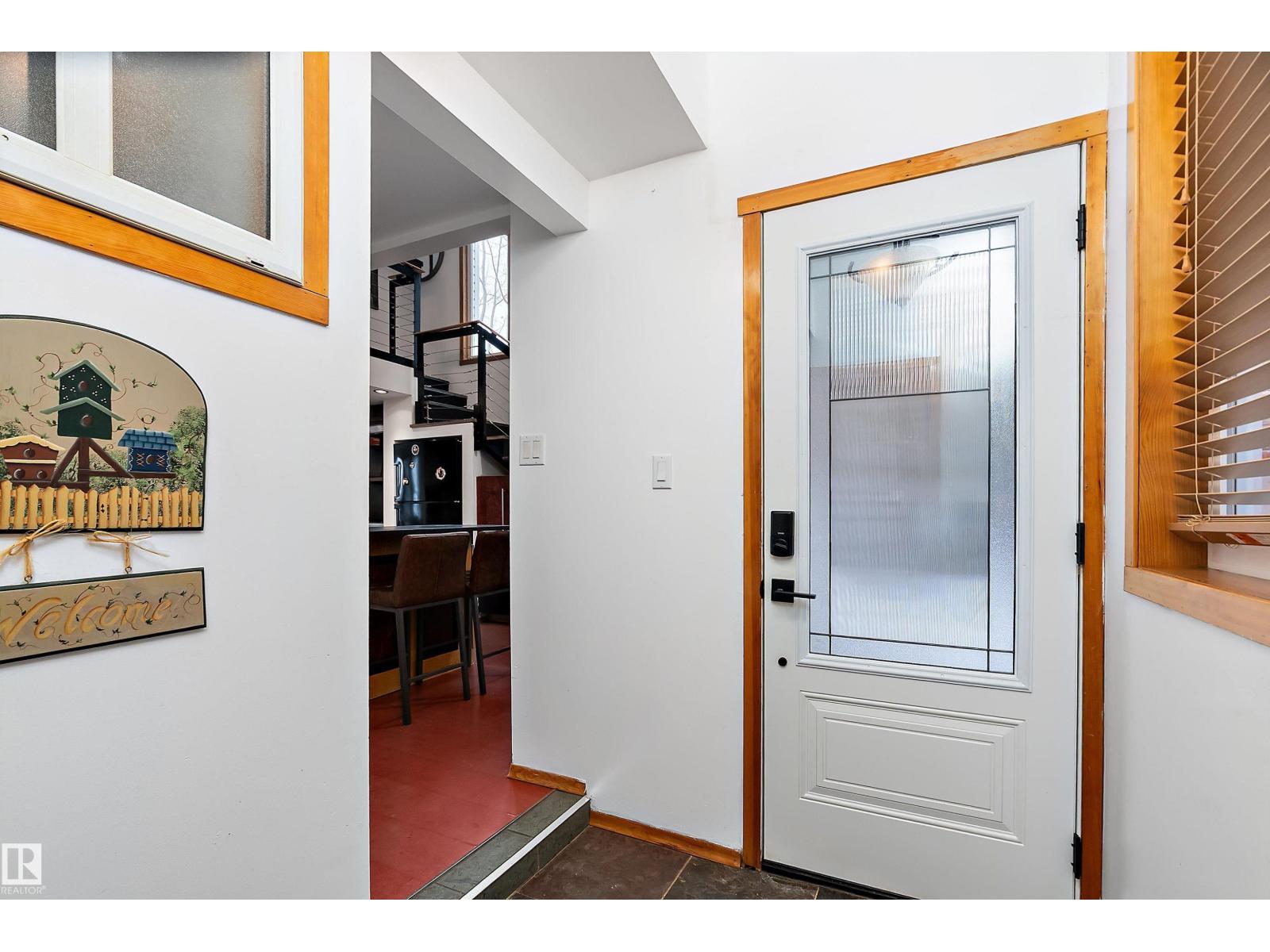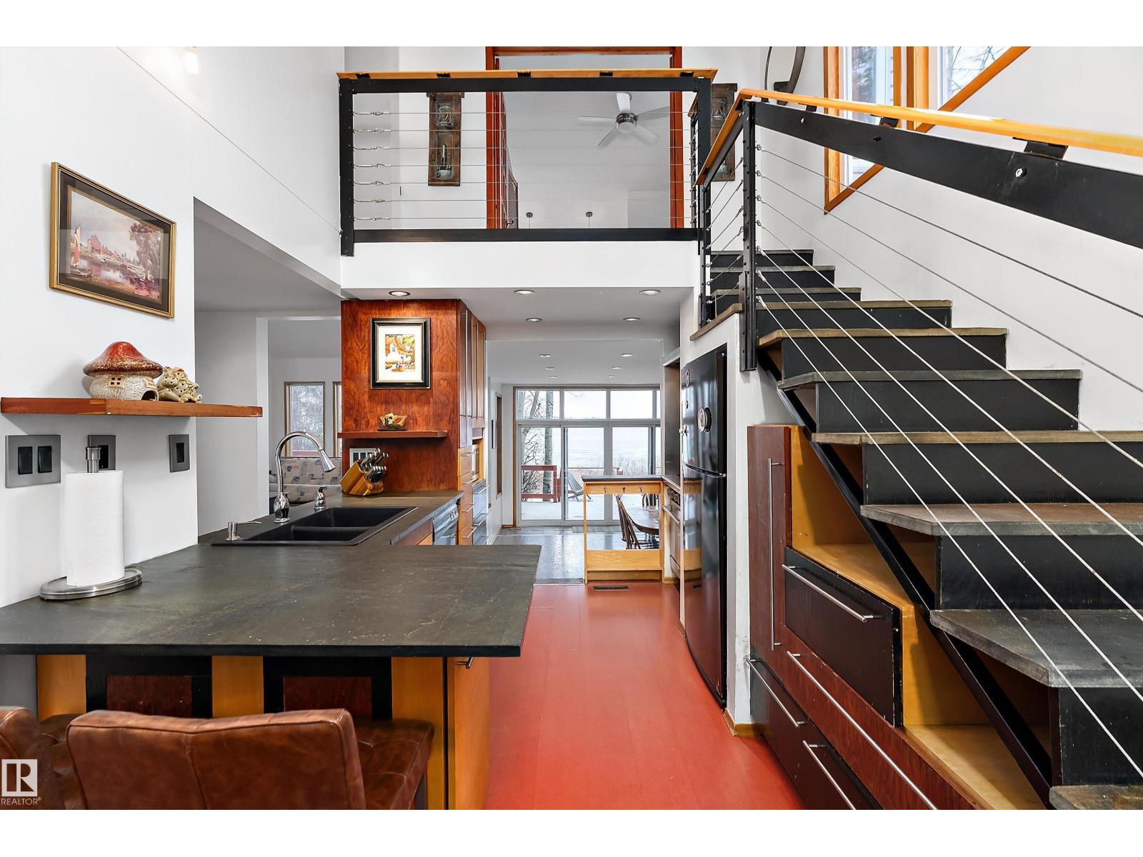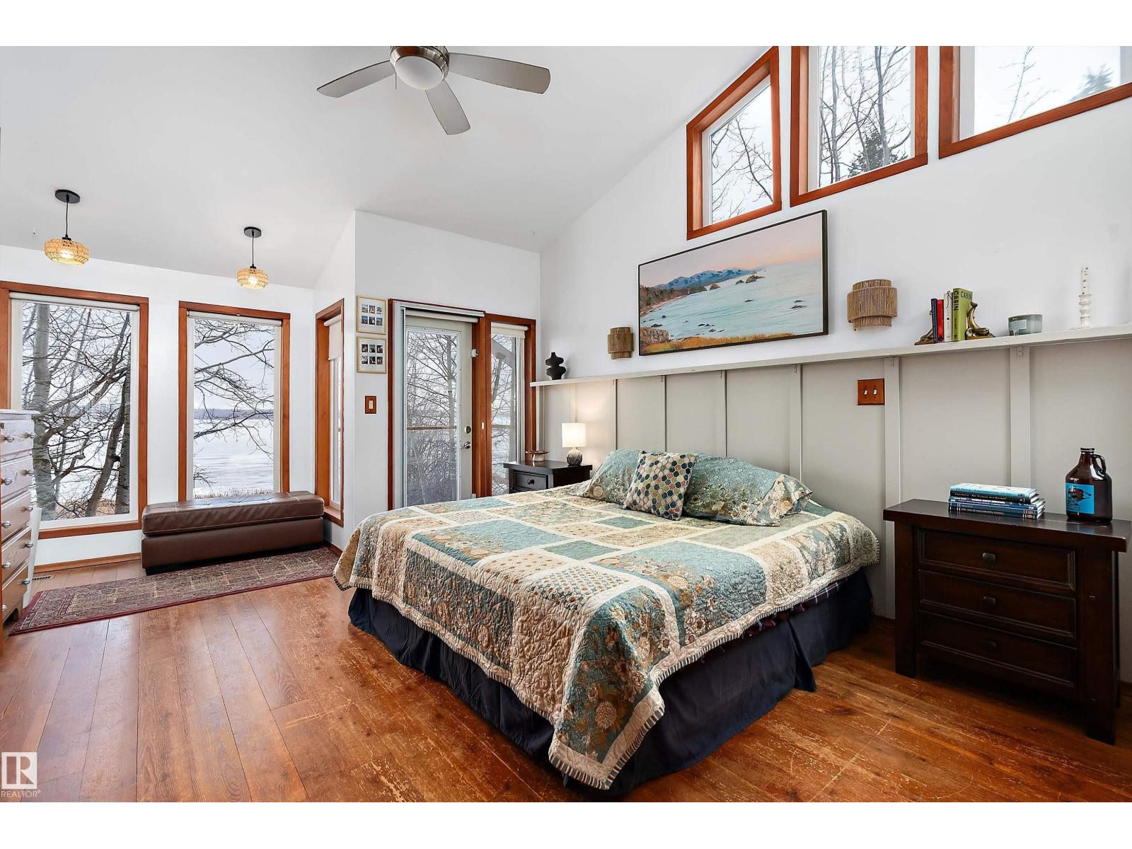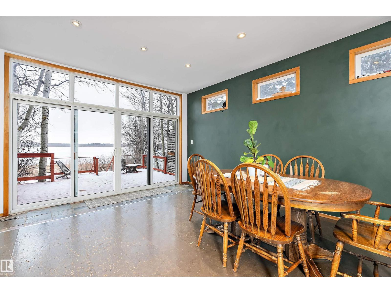 Beautiful, secluded lakefront home! Backing onto quiet Sandy Lake just 30 minutes from Edmonton, at the end of a cul-de-sac with walls of windows to appreciate the serene views over the tiered decks, through the sheltering trees & lawn, to the reeds of your own lake access. Inside, this 1991 2-storey has soaring open vault ceilings so that the views can be appreciated from both floors. Gorgeous slate counters & tile floors, a wood stove for cozy winter nights, gas range in the kitchen, main floor laundry & bathroom, as well as a main floor bedroom. The primary bedroom upstairs has it’s own private balcony looking onto the lake; there’s a 3rd bedroom upstairs, and a quaint bathroom with tiled steam shower & soaker tub. Comes with an attached double tandem garage with additional storage above, work bench, cabinets and additional parking in front for boat/RV/trailer. With a low maintenance metal roof & cistern with potable water, you’ve got all the amenities with the lifestyle you’ve been dreaming of! (id:63190)
