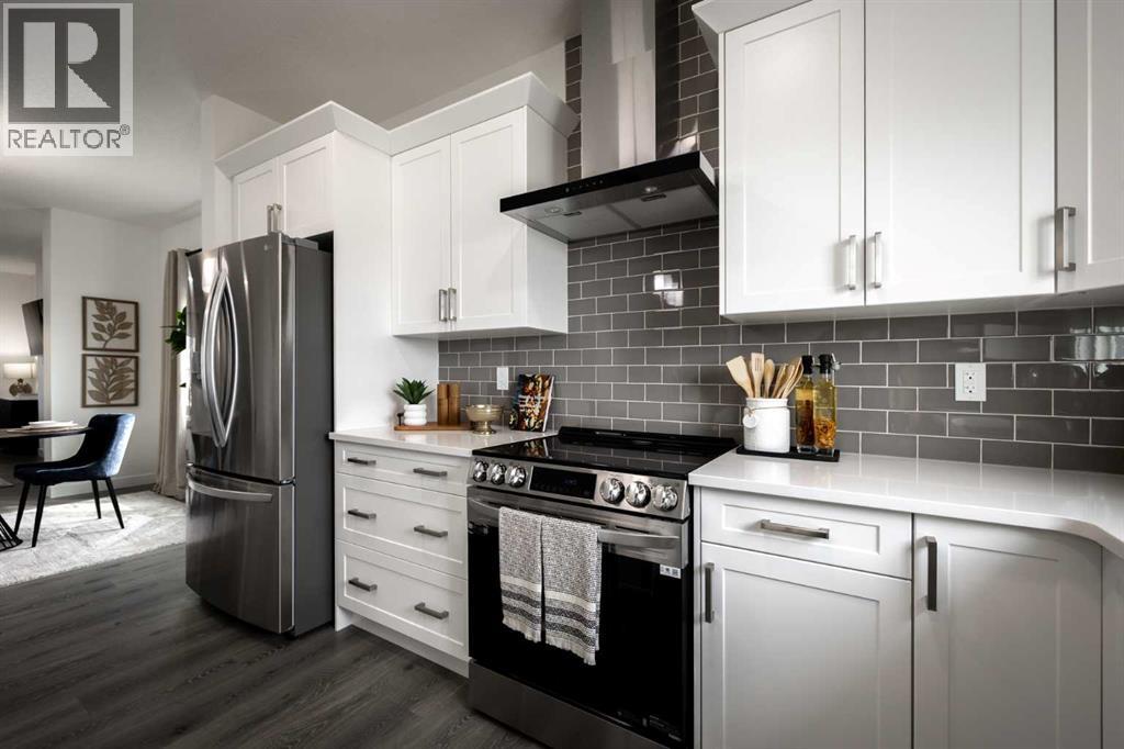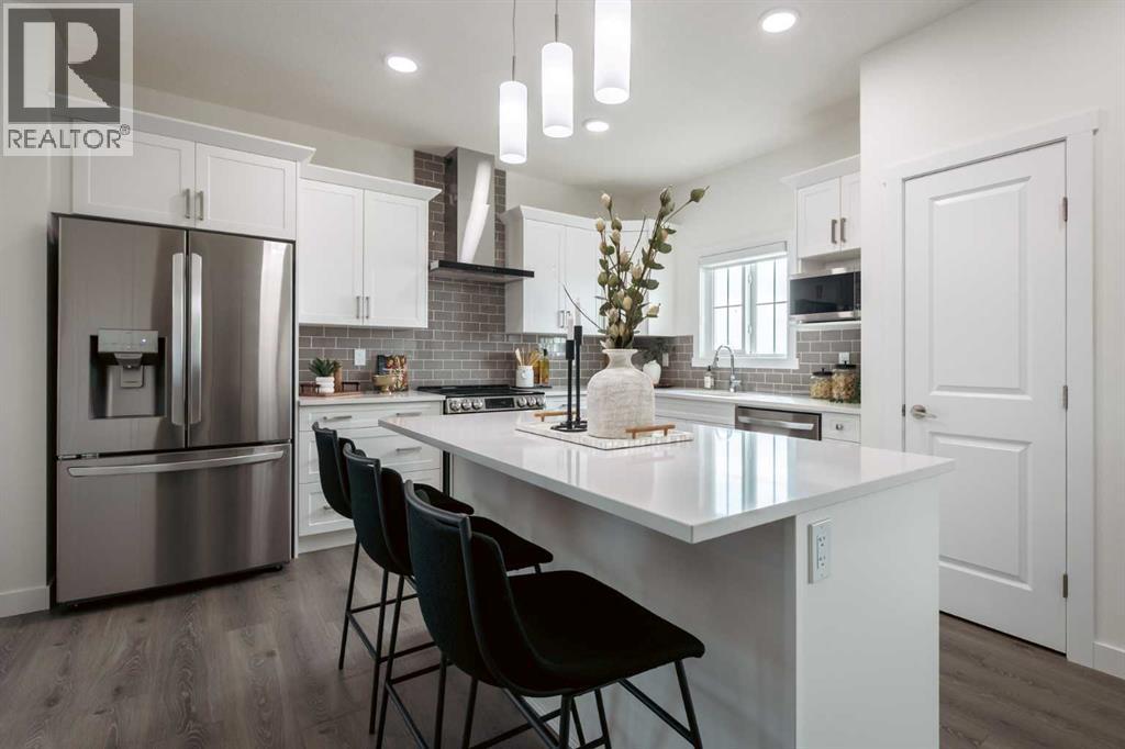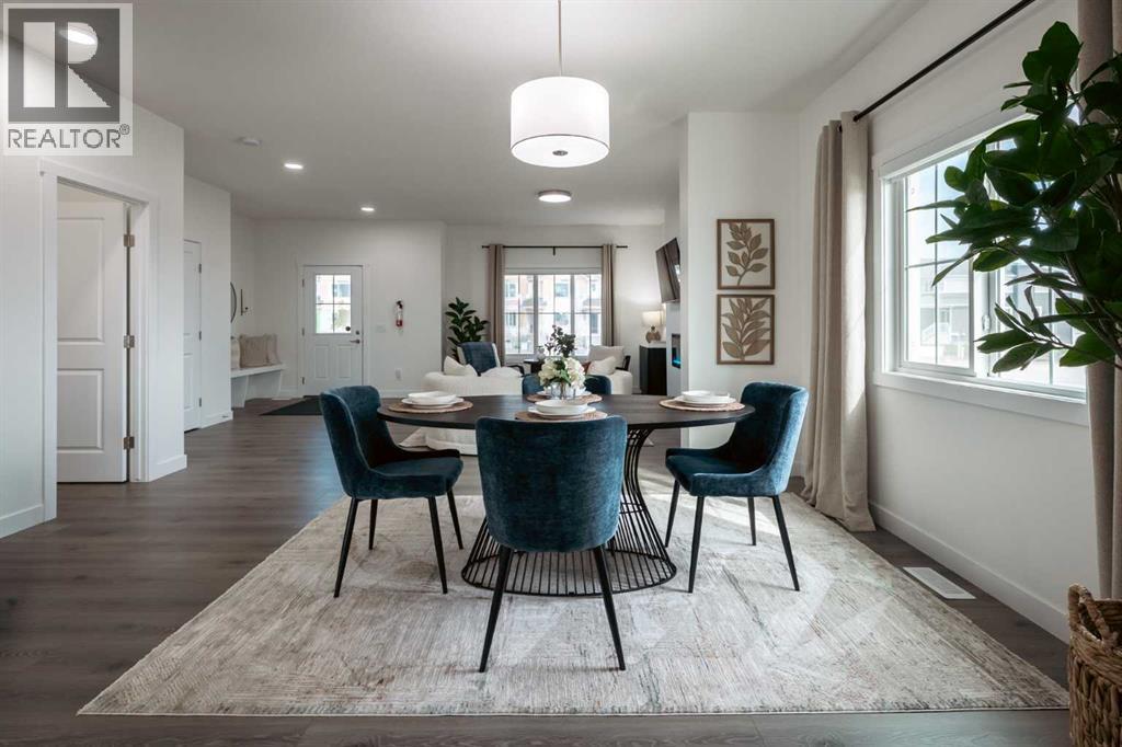 MODERN DOUGLAS WITH BONUS ROOM, SIDE ENTRY & BELMONT CONVENIENCE!Welcome to Belmont, a growing SW Calgary community known for its family-friendly vibe, scenic walking paths, nearby shopping, and easy access to major routes, perfect for balancing lifestyle and convenience.This Douglas-Z model zero lot line home features over 1800 sqft of a bright open-concept main floor with 9’ ceilings and beautiful French-imported laminate flooring, creating a warm and cohesive living space. The modern kitchen is complete with quartz countertops, ample cabinetry, and a seamless connection to the dining and living areas—ideal for both daily living and entertaining. Durable vinyl tile flooring in all wet areas adds practicality where it matters most.Upstairs, you’ll find three spacious bedrooms, a versatile bonus room perfect for family time or a home office, and the convenience of second-floor laundry. The layout is designed to grow with you, offering both comfort and flexibility for busy households.Additional highlights include a separate side entrance for future potential and a rear parking pad for convenient off-street parking. A well-balanced home that blends modern finishes, smart design, and a welcoming community, this is Belmont living at its best. PICTURES ARE OF SHOW HOME; ACTUAL HOME, FIXTURES, FINISHES, ETC. MAY VARY AND ARE SUBJECT TO AVAILABILITY/CHANGE WITHOUT NOTICE (id:63190)