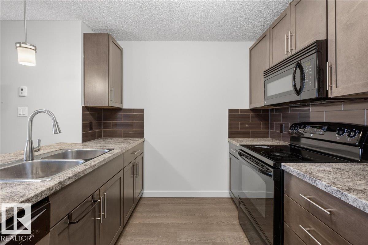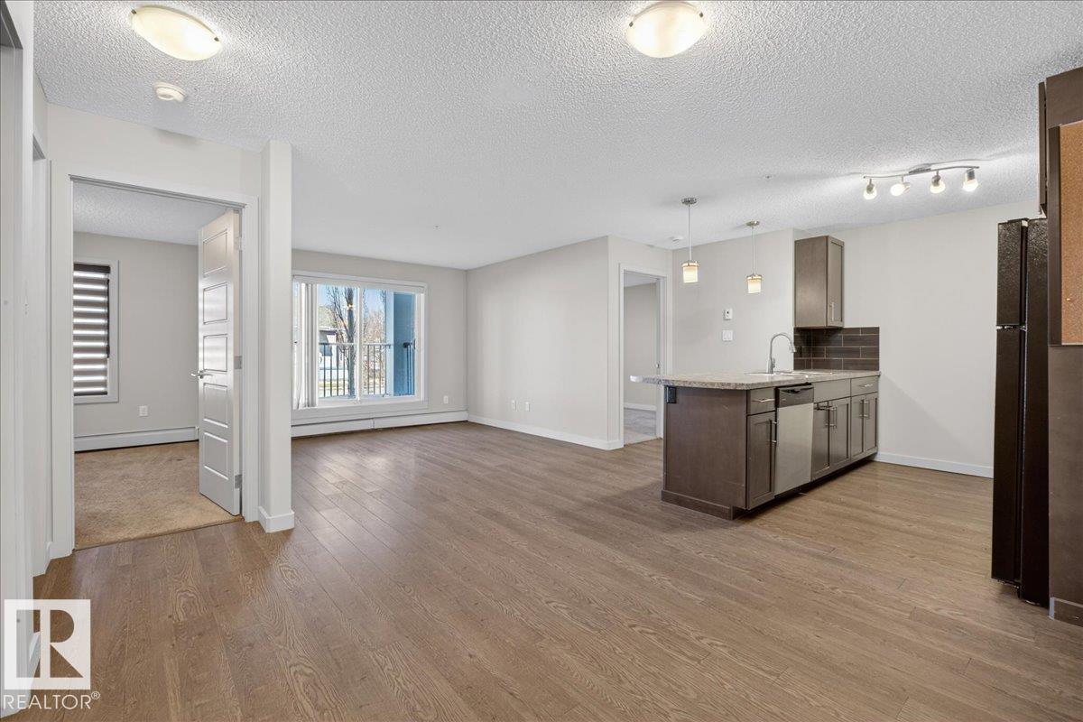 This beautiful 2 bed 2 bath 815 sq ft. condo in the neighborhood of Summerside is a must see! The open concept kitchen, dining room and living room are bright with lots of natural light and feature laminate flooring. The kitchen has rich brown wood cabinetry with tiled backsplash and tons of storage for the home chef. Primary bedroom features carpet flooring, generous walk- in closet, and 3pc en suite bath. This condo also has another well sized carpeted bdrm and a 4pc bath. This amazing condo also has convenient in- suite laundry, air conditioning, nice sized deck to enjoy the fresh air, a titled secure underground parking stall plus bicycle storage, and plenty of additional parking around the building. The building features an exercise room, social room and guest suite. HOA fees include access to Summerside Lake and its amenities! The location offers easy access to parks and green space with walking trails, shopping centres and restaurants, schools, public transit and quick access to the Henday. (id:63190)
