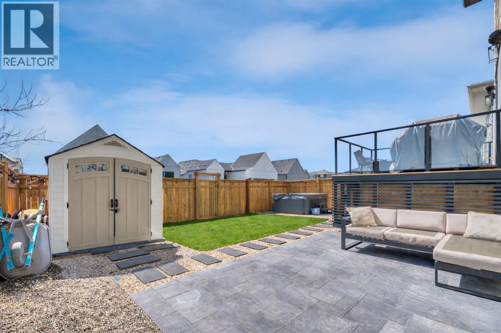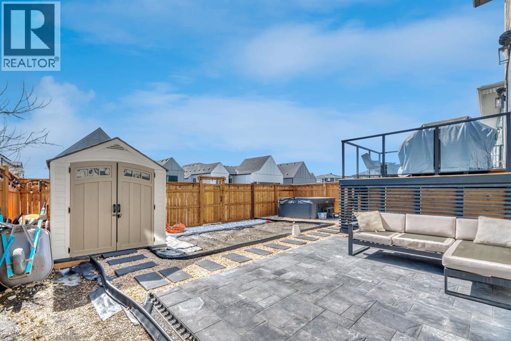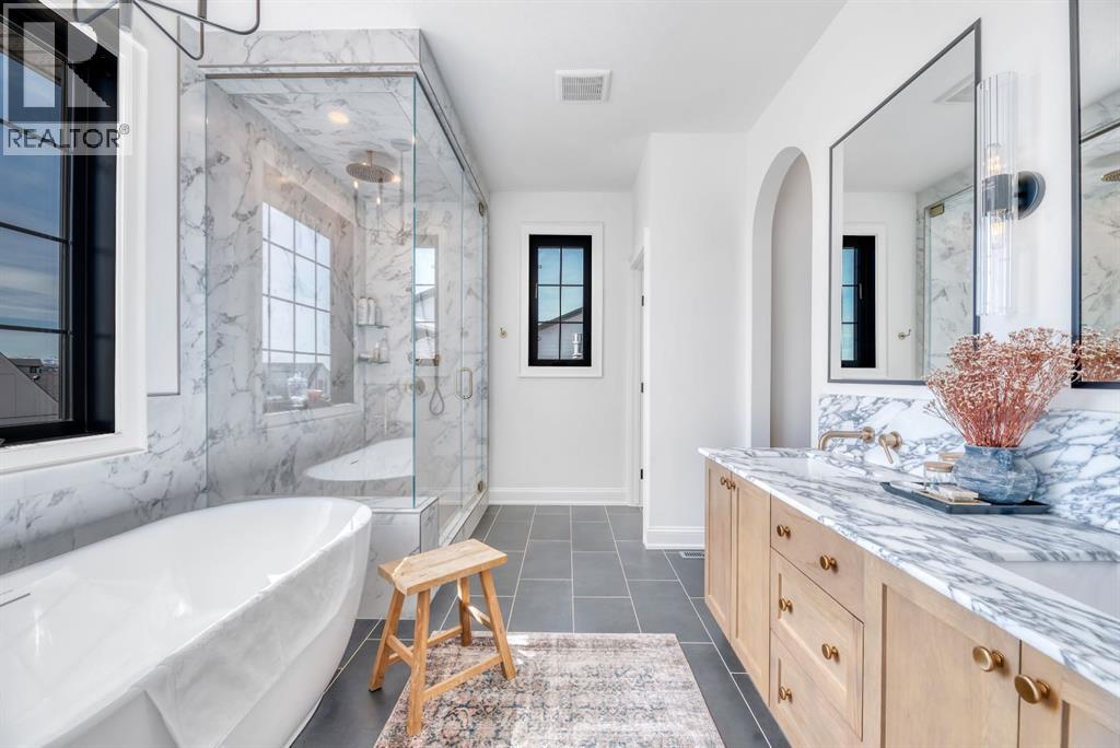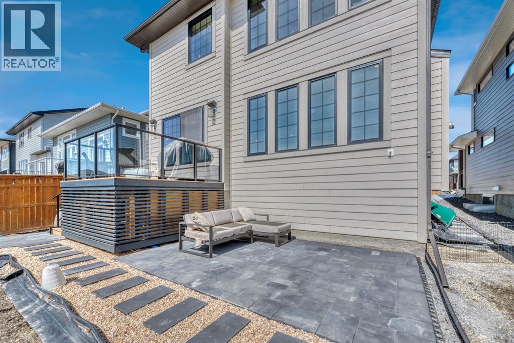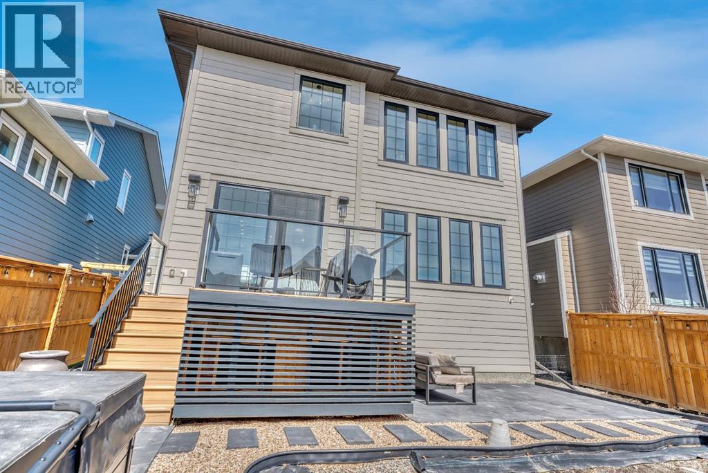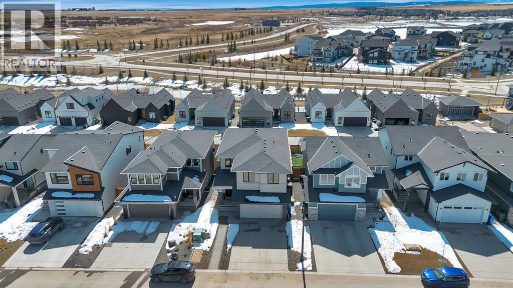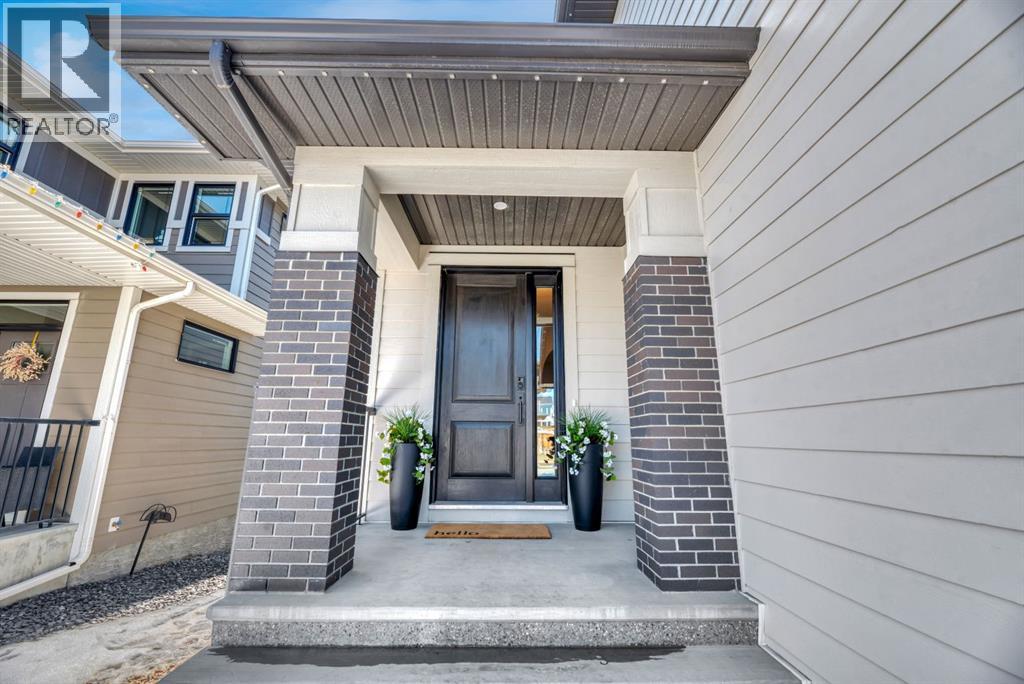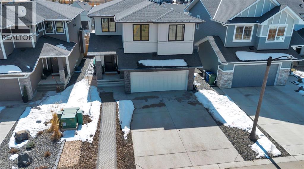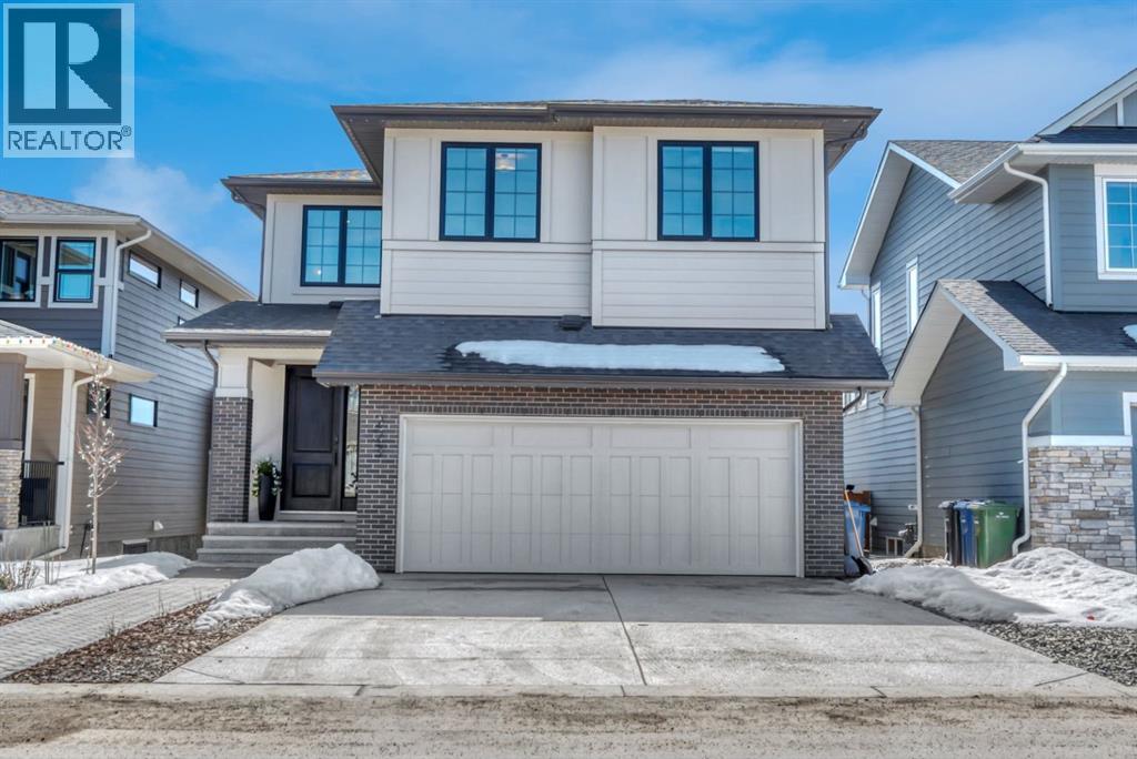 Welcome to an architecturally inspired Organic Modern residence in the award-winning lake community of Harmony—where elevated design meets an unmatched lifestyle just minutes west of Calgary. Enjoy quick access to the city, the renowned Mickelson National Golf Club, and a growing collection of amenities including the lake, beach, pathways, parks, and future village centre—offering a rare blend of recreation, convenience, and community. This modern transitional home offers over 2,700 sq ft of thoughtfully curated living space, combining clean architectural lines with warm, organic finishes. From the moment you arrive, the herringbone brick walkway, soft neutral palette, and striking black-framed windows set the tone for what’s inside. Step into a light-filled interior defined by wide plank natural white oak flooring, soaring ceilings, and custom archways that soften the modern aesthetic and create a sense of flow throughout. The main floor features a stylish front office/den, perfect for working from home, while the open-concept living space is both refined and inviting. At the heart of the home is a stunning designer kitchen that perfectly captures today’s most sought-after style—featuring marble backsplash, marble and honed quartz surfaces, panel-ready appliances, and an induction cooktop with a concealed hood fan. A thoughtfully designed coffee bar and walk-through pantry connect seamlessly to the mudroom, where custom cabinetry and chevron brick flooring elevate everyday function with designer flair. Upstairs, the home continues to impress with 4 spacious bedrooms plus a lofted bonus room with a half-vault ceiling, creating a bright and airy retreat. The primary suite is a true sanctuary, complete with custom drapery and a spa-inspired ensuite featuring floating vanities, wall-mounted faucets, a freestanding soaker tub with bath filler, and a large glass-encased marble shower. The main bathroom is ideal for family living, offering a smart layout with a separate v anity area from the water closet. Every detail has been carefully selected—from champagne bronze hardware and custom lighting to elevated millwork, trim, and finishes throughout—creating a cohesive, high-end aesthetic that feels both modern and timeless. Outdoor living is equally impressive with a composite deck (with storage below), stone patio, and hot tub, plus gas lines to the deck, patio, and garage—perfect for entertaining year-round. Additional features include hot and cold exterior taps, Gemstone permanent soffit lighting, a reverse osmosis system, and a sunshine basement filled with natural light and ready for future development. Sod will be completed as weather permits. Complete with a double attached garage and located in one of the most desirable communities in the Calgary area, this home offers a rare opportunity to own a design-forward, move-in ready property in Harmony. Modern. Warm. Effortlessly elevated. (id:63190)