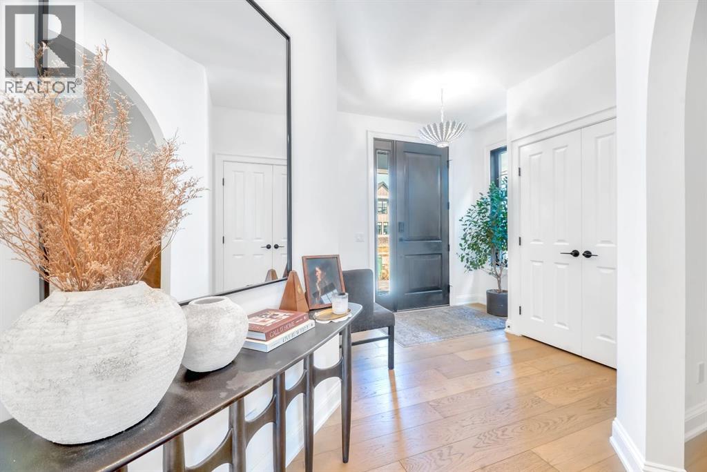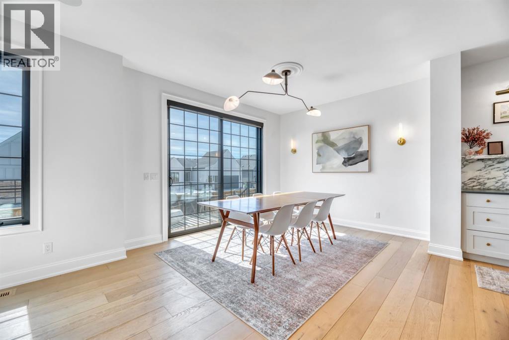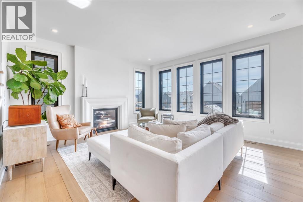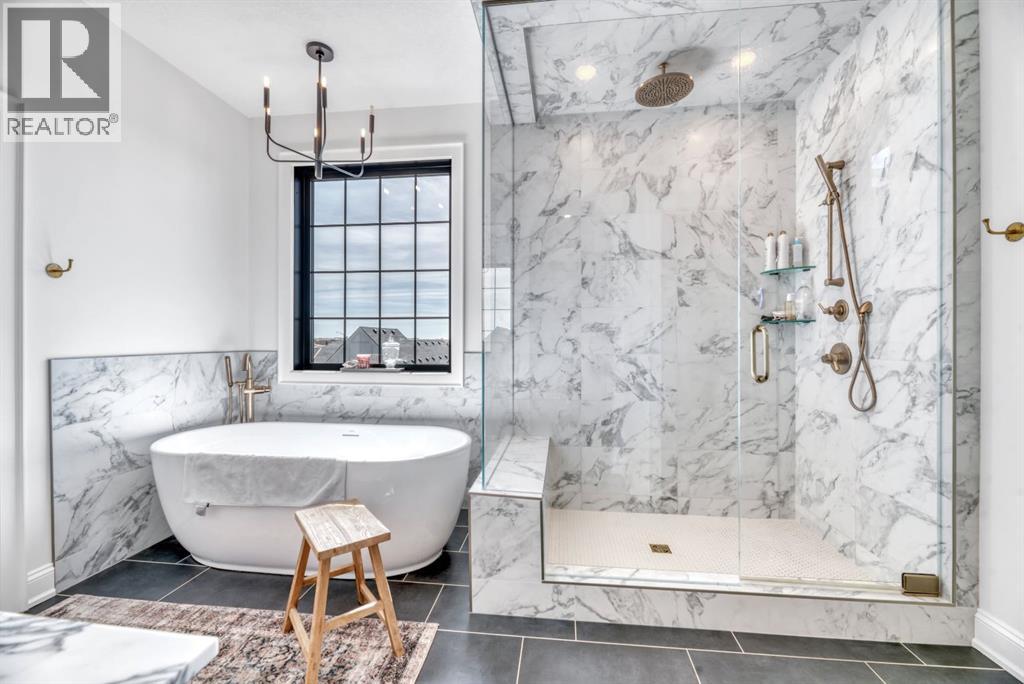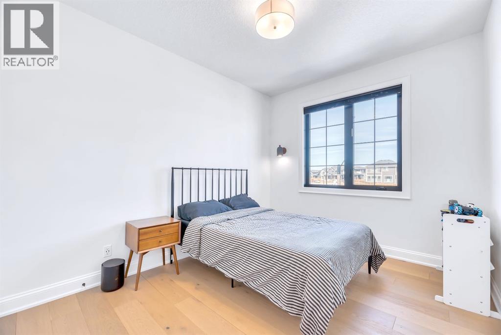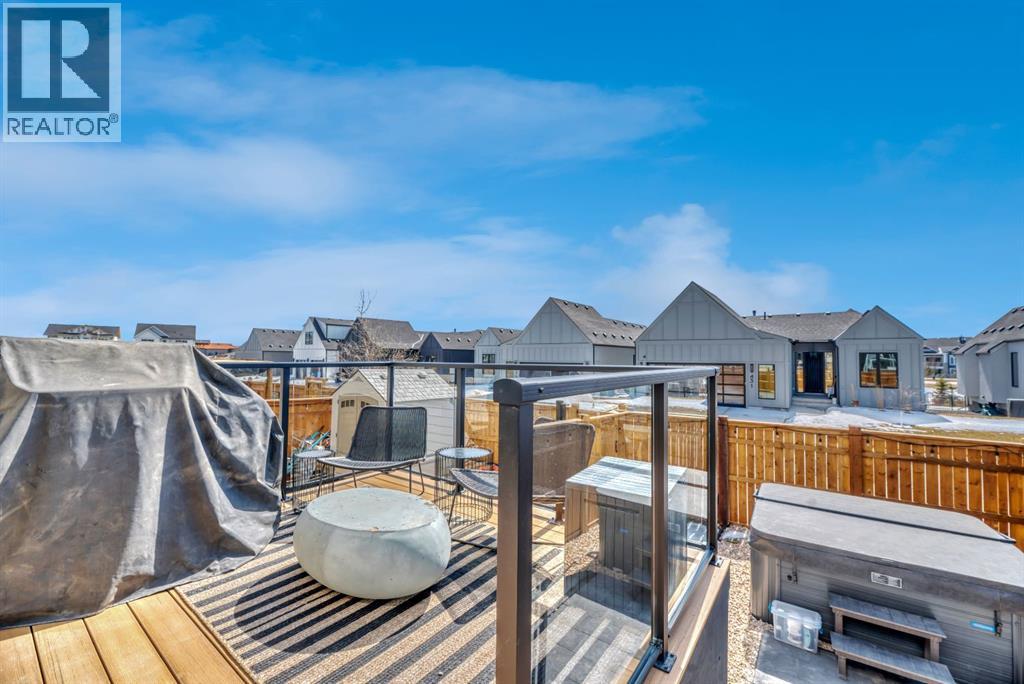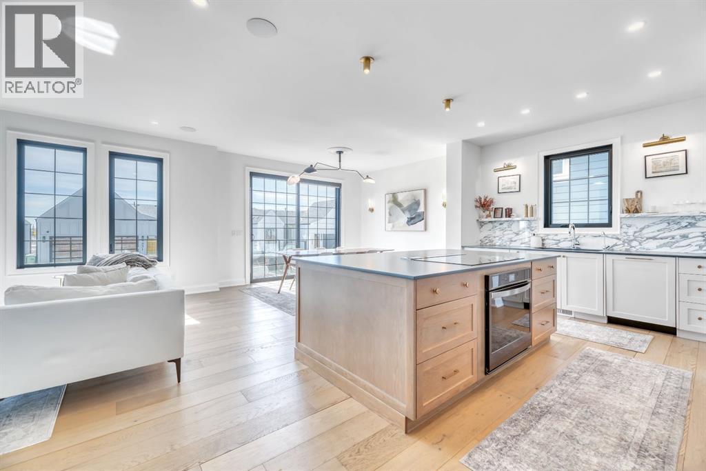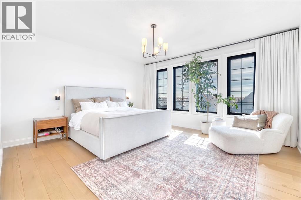 Welcome to an architecturally inspired Organic Modern residence in the award-winning lake community of Harmony—where elevated design meets an unmatched lifestyle just minutes west of Calgary. Enjoy quick access to the city, the renowned Mickelson National Golf Club, and a growing collection of amenities including the lake, beach, pathways, parks, and future village centre—offering a rare blend of recreation, convenience, and community. This modern transitional home offers over 2,700 sq ft of thoughtfully curated living space, combining clean architectural lines with warm, organic finishes. From the moment you arrive, the herringbone brick walkway, soft neutral palette, and striking black-framed windows set the tone for what’s inside. Step into a light-filled interior defined by wide plank natural white oak flooring, soaring ceilings, and custom archways that soften the modern aesthetic and create a sense of flow throughout. The main floor features a stylish front office/den, perfect for working from home, while the open-concept living space is both refined and inviting. At the heart of the home is a stunning designer kitchen that perfectly captures today’s most sought-after style—featuring marble backsplash, marble and honed quartz surfaces, panel-ready appliances, and an induction cooktop with a concealed hood fan. A thoughtfully designed coffee bar and walk-through pantry connect seamlessly to the mudroom, where custom cabinetry and chevron brick flooring elevate everyday function with designer flair. Upstairs, the home continues to impress with 4 spacious bedrooms plus a lofted bonus room with a half-vault ceiling, creating a bright and airy retreat. The primary suite is a true sanctuary, complete with custom drapery and a spa-inspired ensuite featuring floating vanities, wall-mounted faucets, a freestanding soaker tub with bath filler, and a large glass-encased marble shower. The main bathroom is ideal for family living, offering a smart layout with a separate v anity area from the water closet. Every detail has been carefully selected—from champagne bronze hardware and custom lighting to elevated millwork, trim, and finishes throughout—creating a cohesive, high-end aesthetic that feels both modern and timeless. Outdoor living is equally impressive with a composite deck (with storage below), stone patio, and hot tub, plus gas lines to the deck, patio, and garage—perfect for entertaining year-round. Additional features include hot and cold exterior taps, Gemstone permanent soffit lighting, a reverse osmosis system, and a sunshine basement filled with natural light and ready for future development. Sod will be completed as weather permits. Complete with a double attached garage and located in one of the most desirable communities in the Calgary area, this home offers a rare opportunity to own a design-forward, move-in ready property in Harmony. Modern. Warm. Effortlessly elevated. (id:63190)
