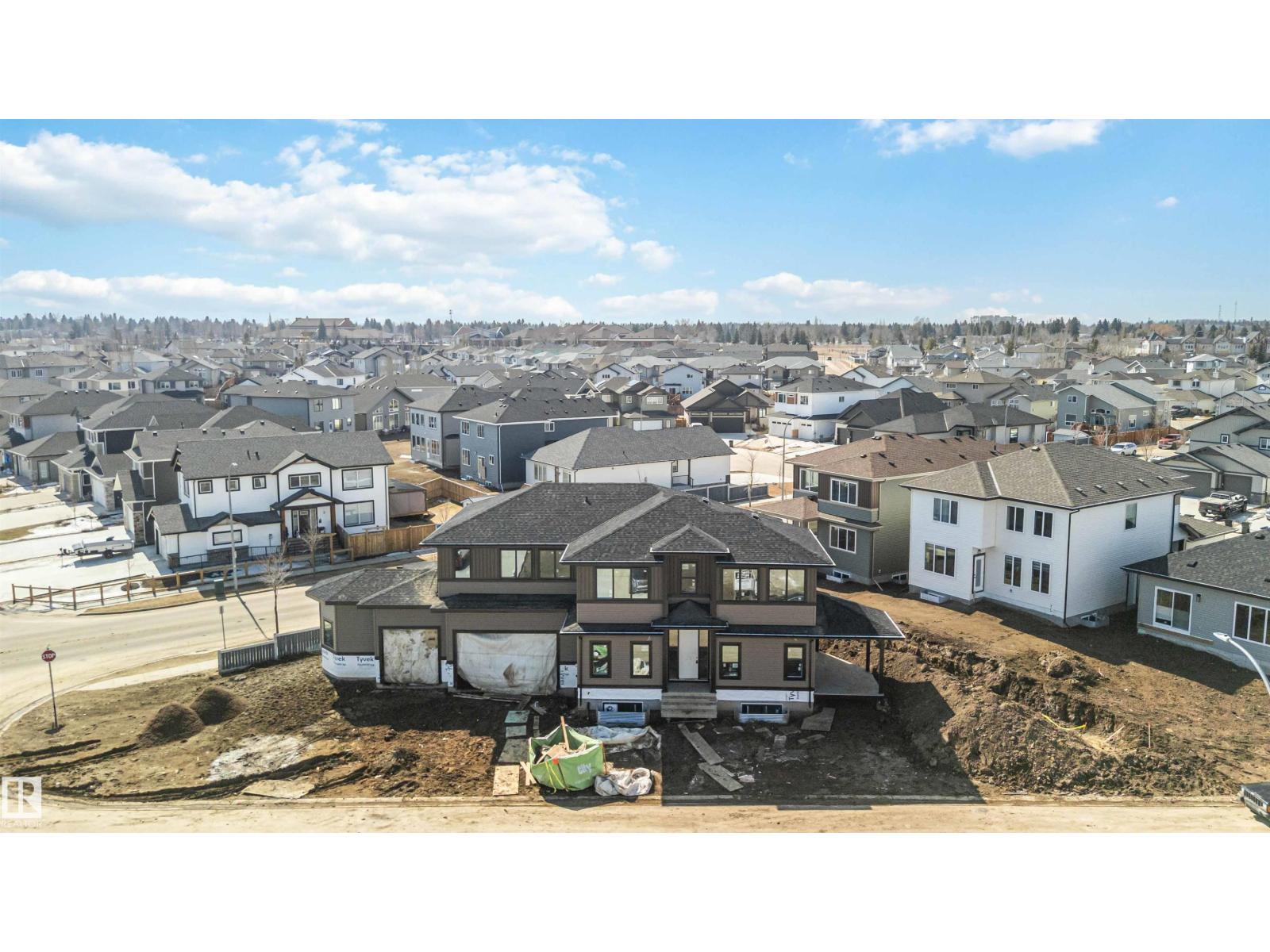 BRAND NEW! GRAND MANOR LIKE Home by local builder LCM Construction, is located on a large corner lot in Hilldowns Spruce Grove! This timeless 2,972 Sq.ft luxury 2-storey home offers presence w/ curb appeal, toasted almond & urban bronze vinyl exterior, black window & door trim, black garage doors, stamped concrete & accent stone. The 3.5 car garage has epoxy flooring, electrical panel & high ceilings for a lift. The main floor w/9 ft ceilings, LVP flooring, flex/office room, mudroom w/built-in bench, 20 ft open-to-below ballroom living room w/ feature wall & 3 sided fireplace, kitchen w/ 9.5 long quartz island, barn style sink, spice kitchen w/sink & beverage cooler, walkthrough pantry, SS built-in appliances, black fixtures & hardware. Upstairs offers an open bonus room, laundry room w/quartz countertop & sink, 3 spacious beds, & private primary bed w/ 5-piece ensuite w/ heated floor, fireplace, 7' soaker tub, enclosed toilet, & large walkthrough closet. Bonus large covered deck & separate grilling deck. (id:63190)