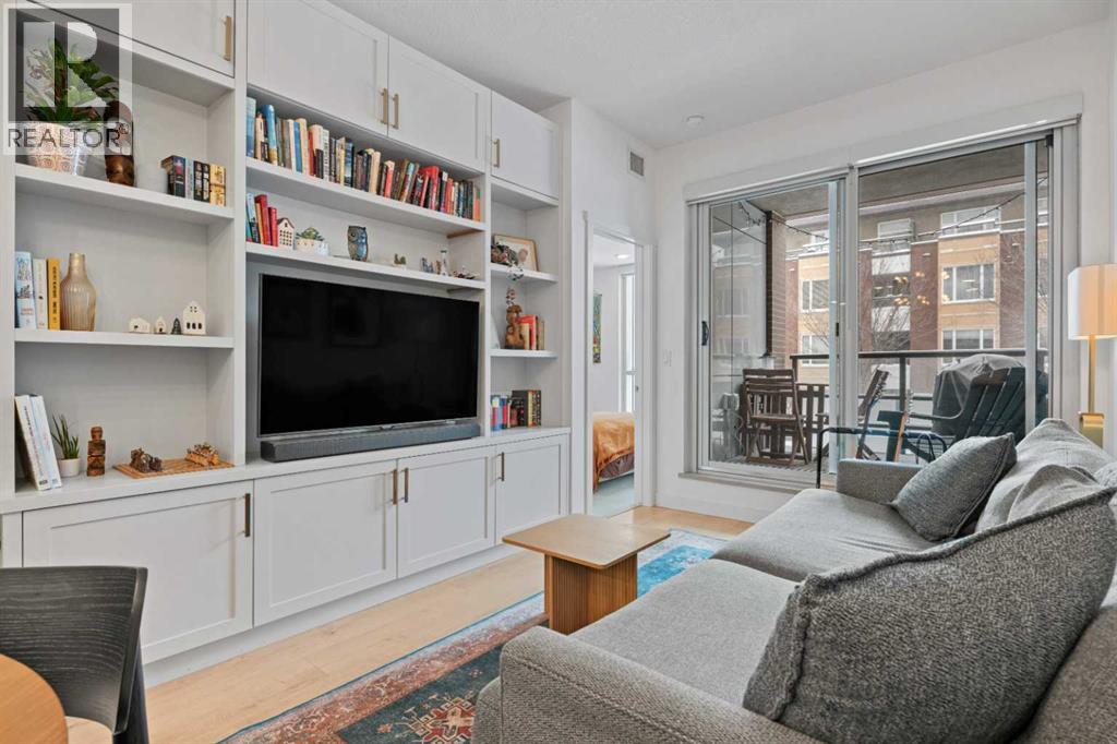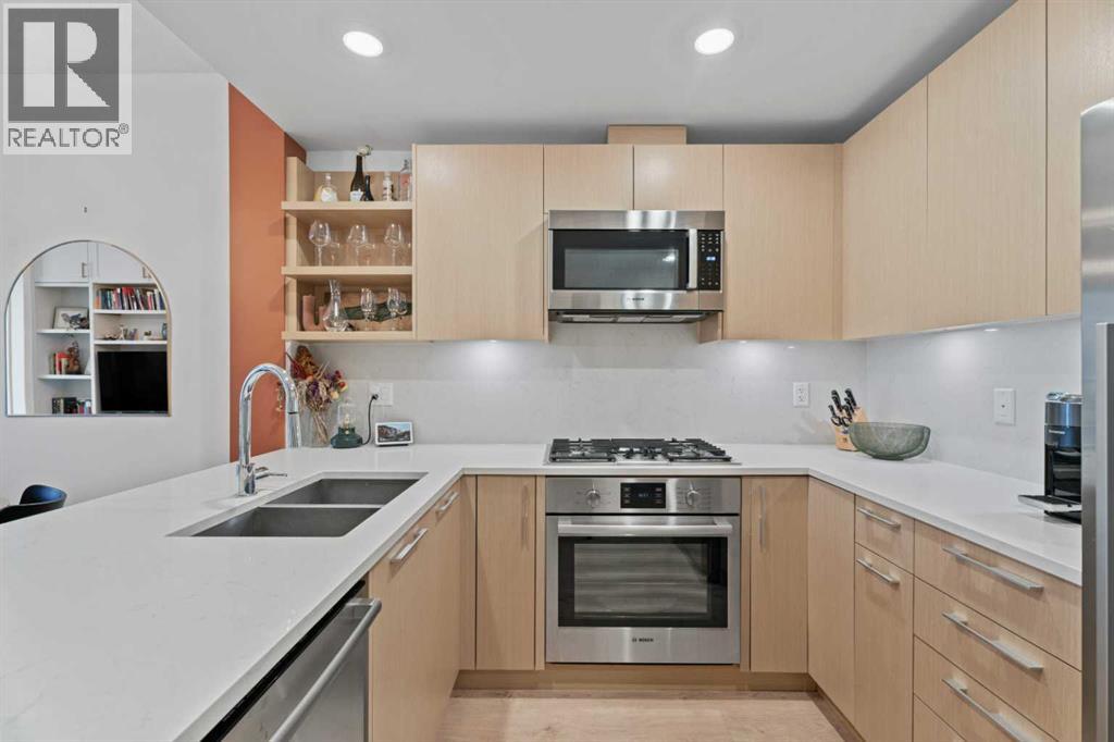 OPEN HOUSE SATURDAY APRIL 25 1-3PM - Welcome to Radius, an amenity-rich building offering something for every lifestyle, located in the desirable neighbourhood of Bridgeland. This spacious and extensively upgraded 2-bedroom, 2-bathroom unit features modern finishes and a bright, inviting atmosphere with a soft contemporary design. The well-appointed kitchen includes a built-in oven, gas range, ample counter space, and quality appliances, flowing seamlessly into the open-concept dining and living area complete with beautiful custom built-ins for storage and media. The generously sized primary bedroom offers a walk-in closet with California Closets organizers and a stylish ensuite with automatic floor lighting, a large vanity, and a walk-in shower. The versatile second bedroom is equipped with built-in storage and a Murphy bed with integrated desk attachments, making it ideal for guests or a functional home office. Additional highlights include a rare oversized in-suite storage and laundry room, along with a well-appointed 4-piece main bathroom. Residents enjoy access to exceptional building amenities including concierge and the main gym (1st floor), delivery room (2nd floor), secondary gym (3rd floor), yoga/barre room (4th floor), spin room (5th floor), rooftop patio and gardens with stunning city views (7th floor), dog wash station and bike storage (P1). This unit also comes with titled underground parking, and a dedicated storage room, offering convenience and comfort in one of Calgary’s most vibrant communities. (id:63190)