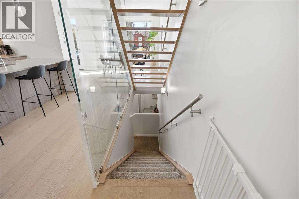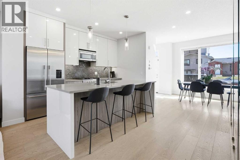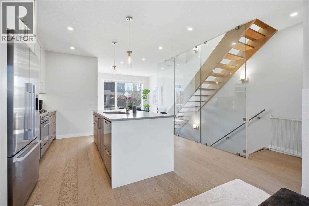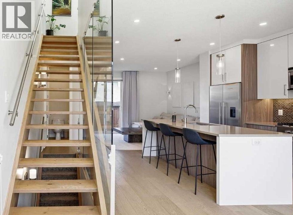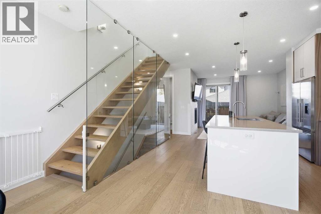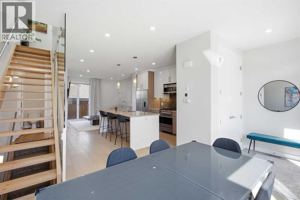 Welcome to this beautifully designed 4 bedroom, 3.5 bathroom townhouse offering 1,690 sq. ft. of total living space in the highly desirable community of Windsor Park. This spacious home features a functional layout for families and entertaining, with a bright open-concept living area and modern finishes throughout. Many up grades set this home apart, including a spectacular eye catching Open Riser Staircase with sleek glass panels, engineered Hardwood flooring, solid 8 ft doors throughout, 9 ft high ceilings, A huge Skylight, modern window coverings, and AIR CONDITIONING. The gourmet kitchen is a true highlight featuring Fisher & Paykel SS appliances, including a Gas stove, elegant neutral cabinetry, QUARTZ countertops and a large Island , all adjacent to a sun filled dining space, ideal for entertaining. The living room displays a gas fireplace so you can cozy up in the cooler months and a patio door for access to the the Private Fenced-in Patio backyard. The impressive and spacious primary suite offers soaring ceilings, a walk in closet, and a luxurious ensuite complete with dual sinks and a glass enclosed shower--truly a standout feature. Two additional bedrooms are good sized and the conveniently located Full sized Washer/Dryer add to the home's functionality. The fully developed basement features 9 ft ceilings, a comfortable Rec-room with a wet bar, a 4th bedroom and a full 4 piece bath--Ideal for guests, extended family or just entertaining. This townhouse is part of a SELF MANAGED Condo, with LOW fees of only $345.00 a month, offering an affordable option for maintenance and management. Included is a single detached garage. . Ideally located to an abundance of amenities such as: Britannia/Chinook Shopping Centers, Lina's Italian store, Stanley Park, Dog Parks, Brown's social house, Village Ice Cream, Sunterra Market, Monogram's, Schools, Public Transit, and easy access to Elbow Drive and Macleod Trail. This home has so much to offer...Location, Value a nd Affordability! Come see what Windsor has to offer ! (id:63190)