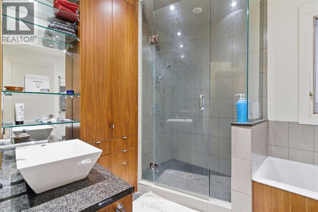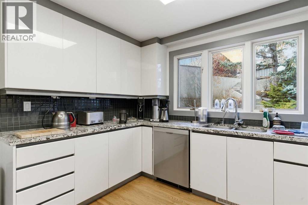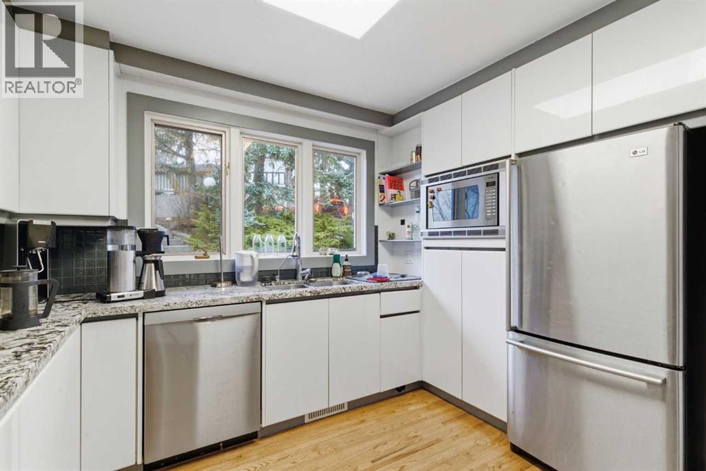 Set within one of Calgary’s most prestigious inner-city enclaves, this remarkable walkout bungalow in Upper Mount Royal offers a rare blend of tranquility, sophistication, and future potential. Nestled on an expansive 1,284 m² (±1/3 acre) lot, the property is tucked away in an exceptionally private, tree-lined setting - surrounded by mature evergreens and deciduous trees creating a peaceful, retreat-like atmosphere reminiscent of Canmore. Elevated above the street and enveloped in lush greenery, the home captures an abundance of natural light through oversized picture windows, enhancing the bright, airy feel of its approximately 2,650 sq. ft. of thoughtfully updated living space. Designed with both comfort and style in mind, the main level features expansive principal rooms ideal for everyday living and entertaining alike. A grand living room anchored by a gas fireplace showcases sweeping views. The generous dining area opens through French doors onto a sun-drenched, south-facing deck—perfect for seamless indoor-outdoor living. The contemporary kitchen is both functional and striking, appointed with high-gloss cabinetry, designer granite countertops, and premium stainless steel appliances, including a gas range. Rich finishes - solid hardwood, limestone, and slate flooring—flow throughout, adding warmth and timeless elegance. The primary retreat offers serene garden views and a spa-inspired ensuite complete with an oversized glass shower, a deep soaker tub, and refined modern finishes. A versatile den—easily converted to an additional bedroom—with direct yard access completes the main floor. The fully developed walkout lower level offers exceptional flexibility for families or guests. It features a spacious family room, three additional bedrooms, an updated three-piece bath, and a well-appointed laundry room with ample storage. Outdoors, the home continues to impress. The expansive, sun-filled backyard offers multiple private entertaining areas, complemented by a st riking curved concrete staircase leading to the rear lane with additional parking. An oversized detached garage with a rooftop deck further enhances the property’s unique appeal. Whether you are a growing family, a professional couple seeking an inner-city sanctuary, or a discerning downsizer, this home delivers an unparalleled lifestyle defined by privacy, space, and proximity to Calgary’s finest amenities. For developers and investors, the elevated positioning and substantial lot size present a truly exceptional opportunity to create a landmark residence in one of the city’s most coveted neighborhoods. Experience a property where privacy, prestige, and development potential. (id:63190)