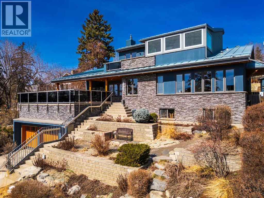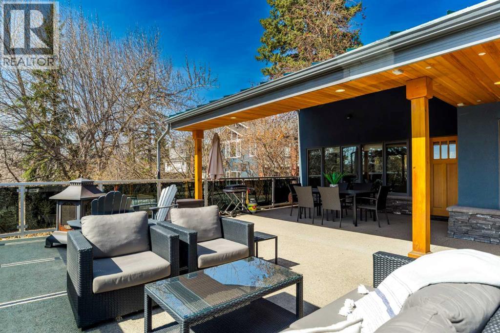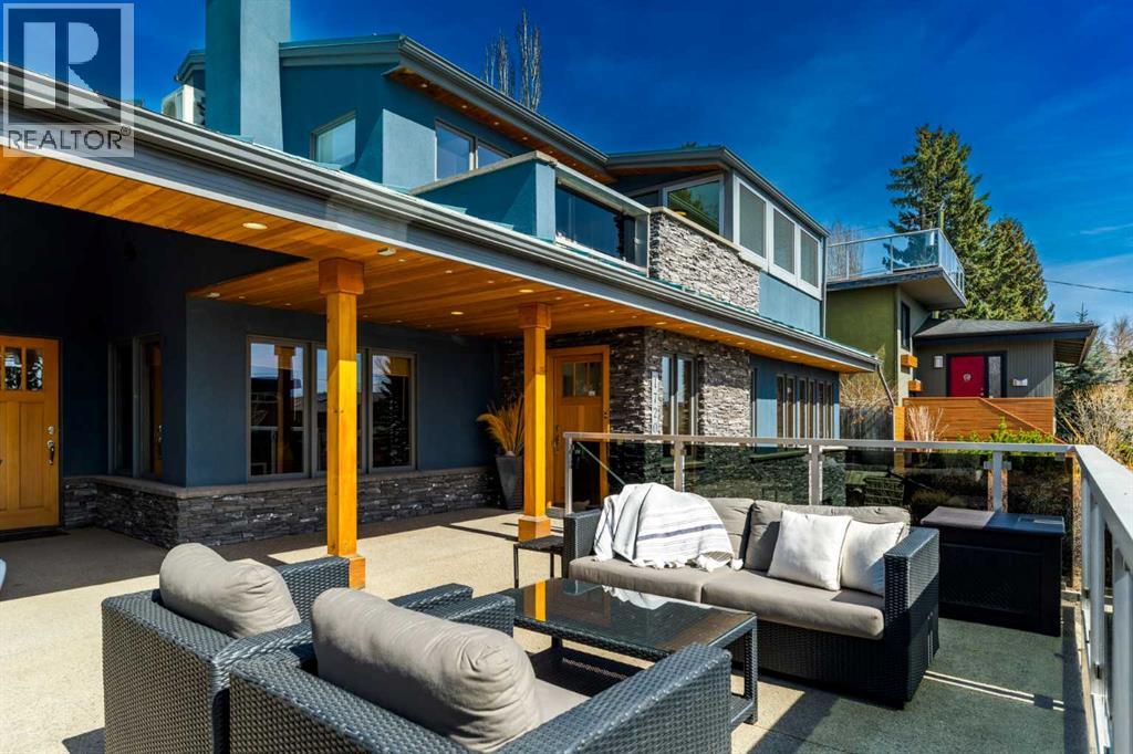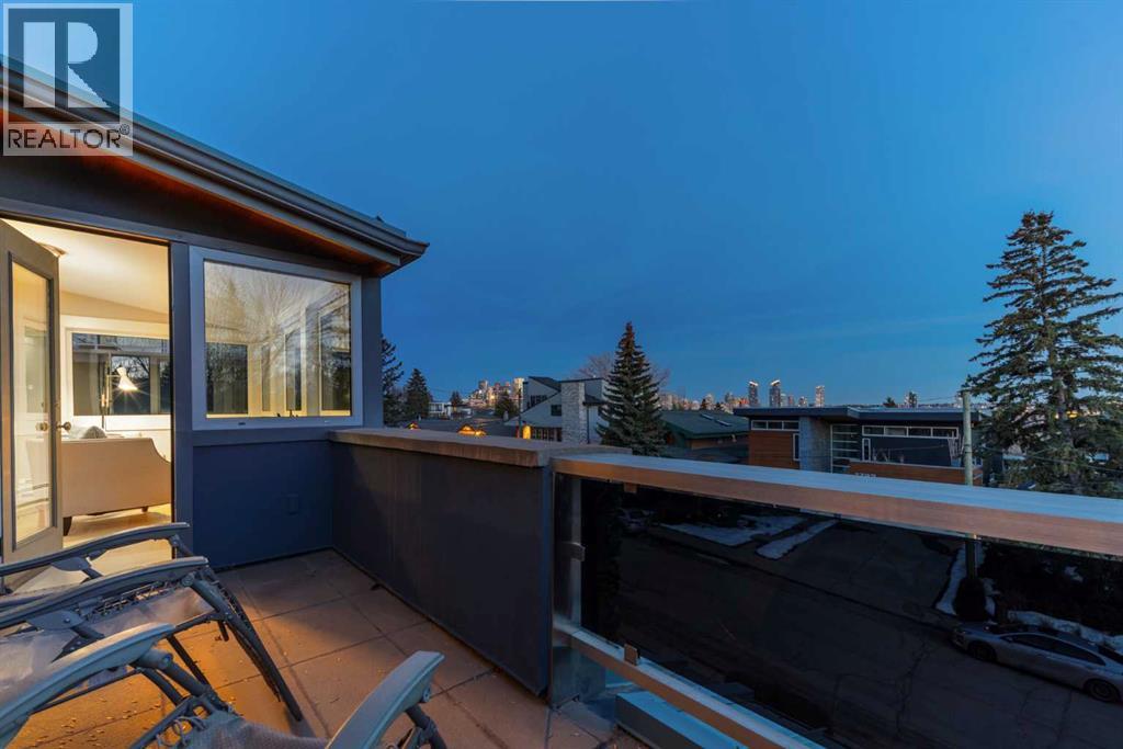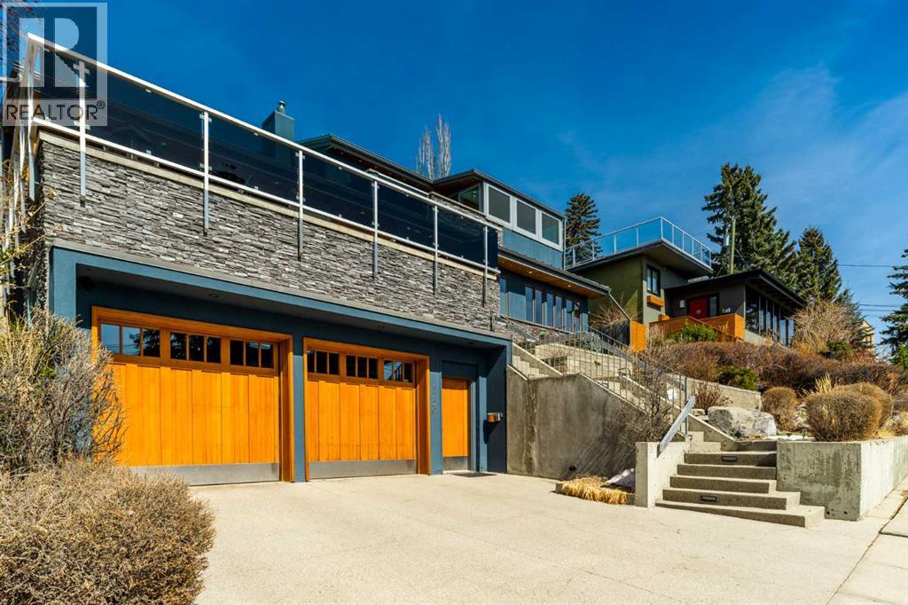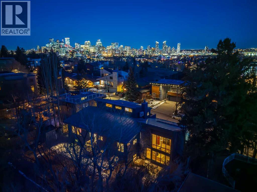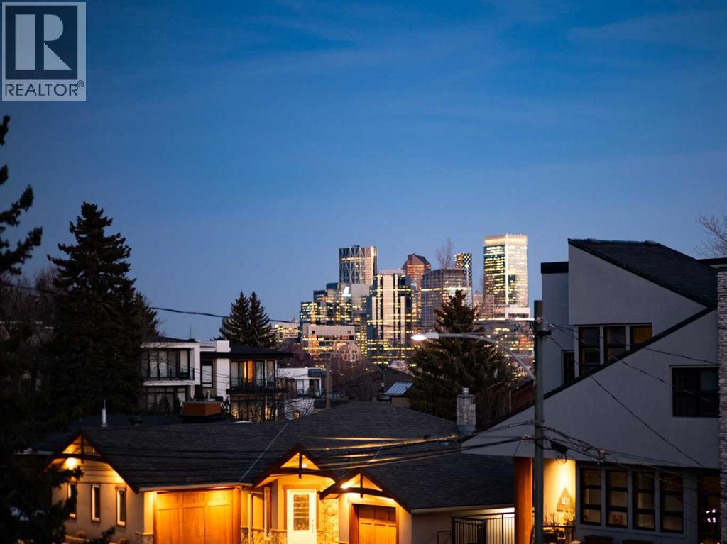 In an era of generic luxury, this striking home, with architectural lines redefined by Architect Richard Davignon, is an elevated sanctuary for the active, executive family. Sprawling over 4,000 square feet of developed living space on a generous 75’ wide lot, this residence perfectly bridges a vibrant inner-city lifestyle with seamless access to the mountains. William Blake Homes was enlisted to execute the dramatic primary suite, while Marvel Kitchens designed the heart of the home, a sophisticated culinary hub focused on performance. It features a massive quartz island with glimpses of the downtown skyline, high-end appliances, clever cabinetry, and a dedicated coffee bar area. Adjacent, the Davignon designed studio, built over the garage space, is an exercise in intentional, architectural detail; defined by soaring ceilings and an expansive gas fireplace, this light-filled space offers independent front and back exterior access, serving effortlessly as a professional home office option or the home's primary gathering hub. Ascend to the primary suite, a masterwork by William Blake Homes. The private balcony offers cinematic, dual-directional views of both the city skyline and the Rocky Mountains. A study in quiet luxury, the suite features 12ft vaulted ceilings, a sunroom, and a meticulous 5-piece ensuite where heated floors extend even into the shower, complemented by a deep soaker tub and heated towel rack. The remainder of the upper level houses 2 additional generously-sized bedrooms with substantial closets, and a large family bath, all positioned at the rear of the home for ultimate privacy. The lower levels are equally purposeful: the north side offers a self-contained retreat with a family room, bedroom, bath, kitchenette type space, and laundry, ideal for teens, nannies, or generational living. The south side transitions into the ultimate active base, featuring a home gym (or 5th bedroom) and a dedicated gear room for ski tuning, bike maintenance or stora ge, complete with a cold room for wine. This leads to the attached triple garage, a core feature for the collector, redefined with over-height ceilings to accommodate a car lift and an innovative tandem bay. Outdoor living is prioritized through a series of defined spaces, beginning with a partially covered, south-facing patio off the entrance that facilitates effortless alfresco dining or a glass of wine while taking in the views. The private, tiered backyard is an entertainment retreat featuring multi-level decking, a hot tub, elevated flat space to play, and a double parking pad off the back lane. The front yard presents a sophisticated, climate-conscious xeriscape for a low-maintenance lifestyle. Located within walking distance to amenities and offering rapid access to the Children’s and Foothills Hospitals, the U of C, The Calgary Winter Club and downtown, the home is finished with enduring materials, including a 50-yr blue metal roof, upgraded insulation, and an efficient multi-zoned heating system. (id:63190)
