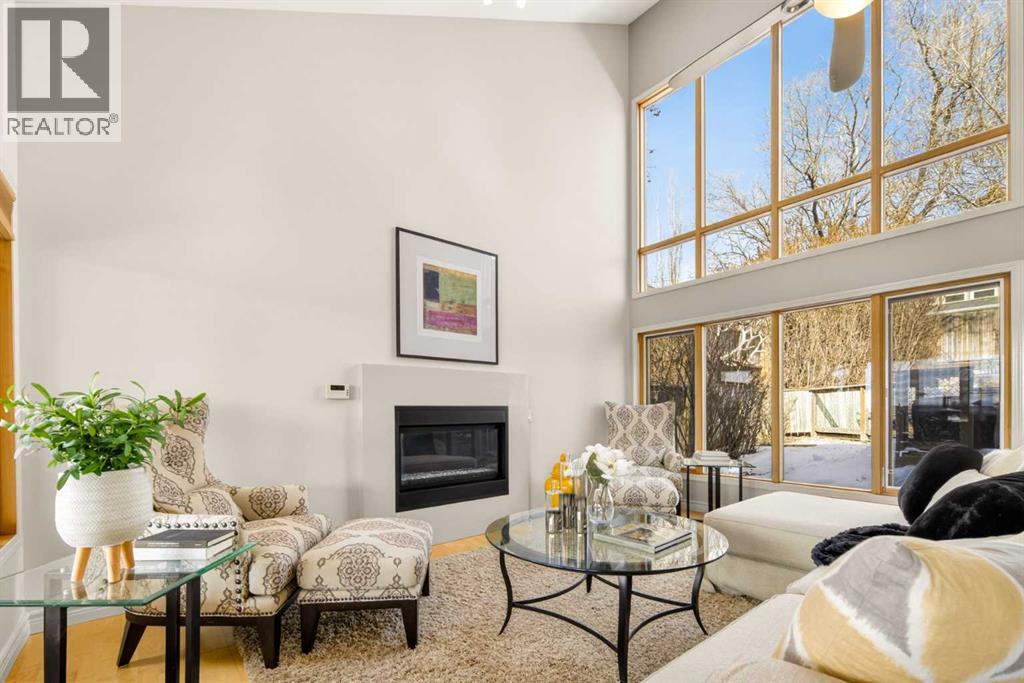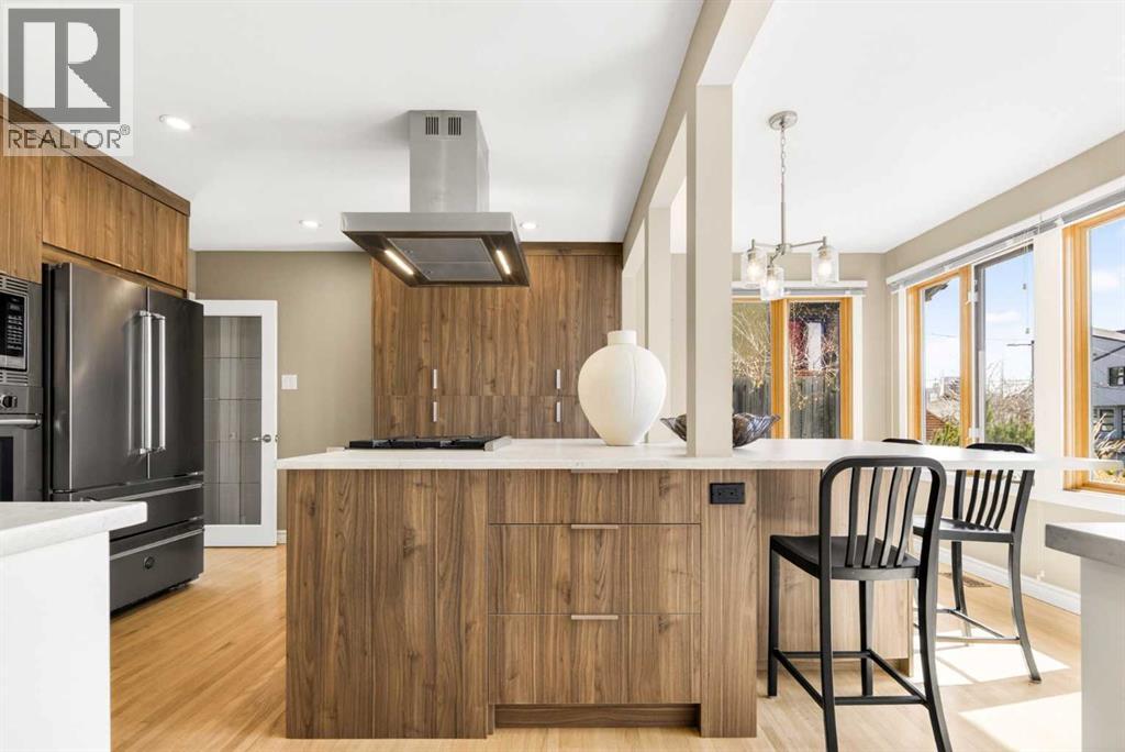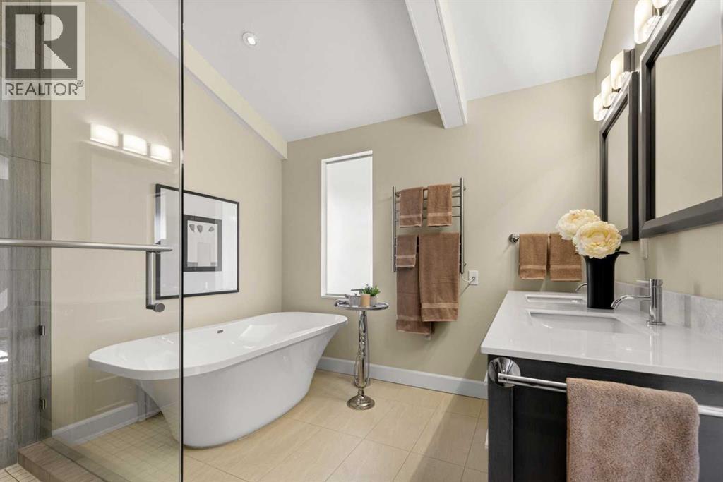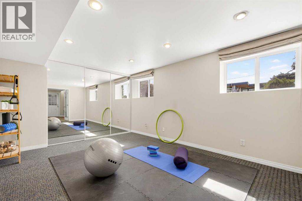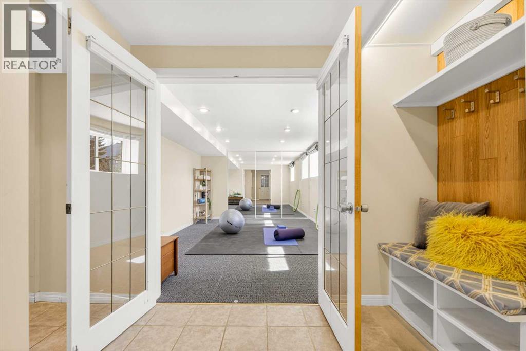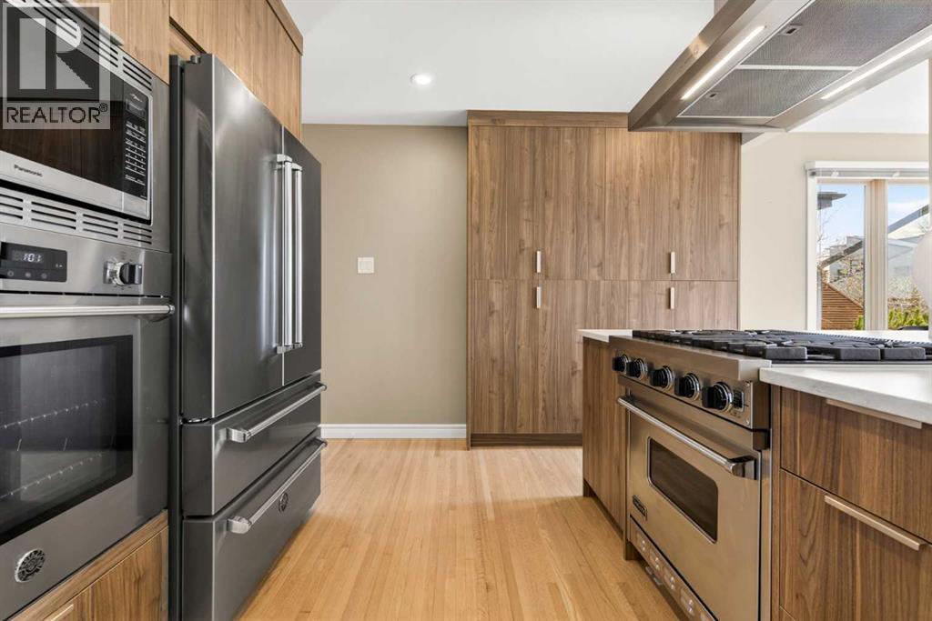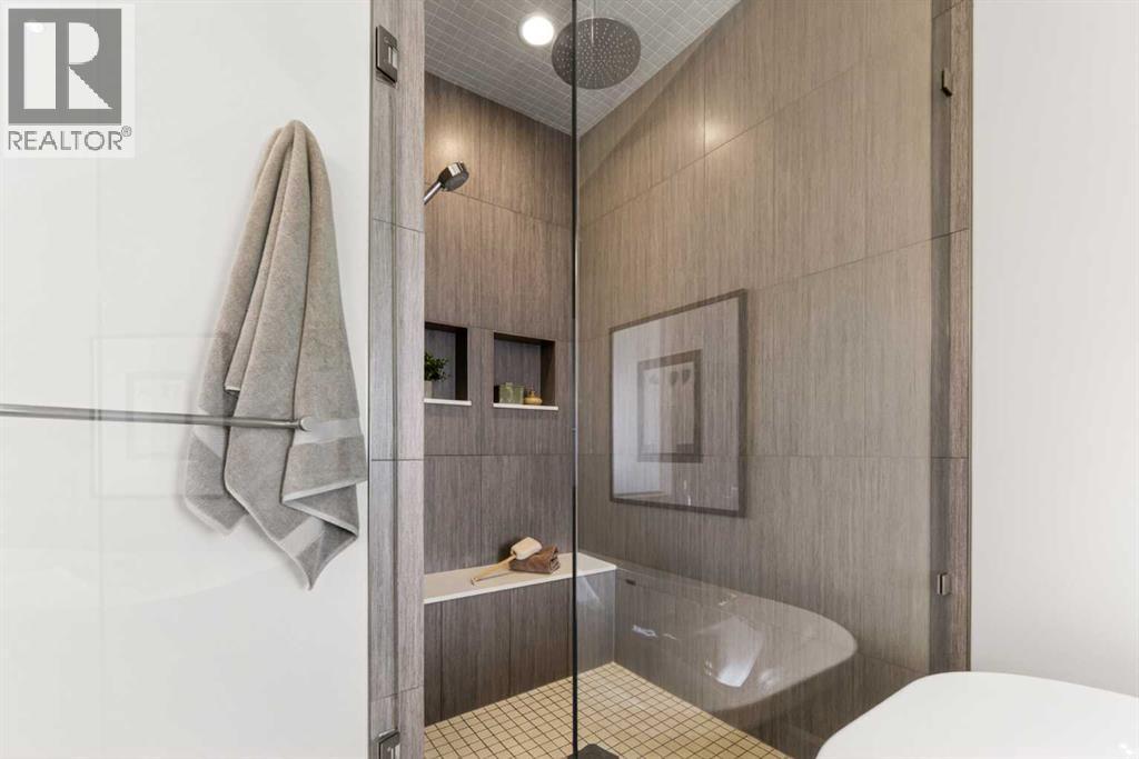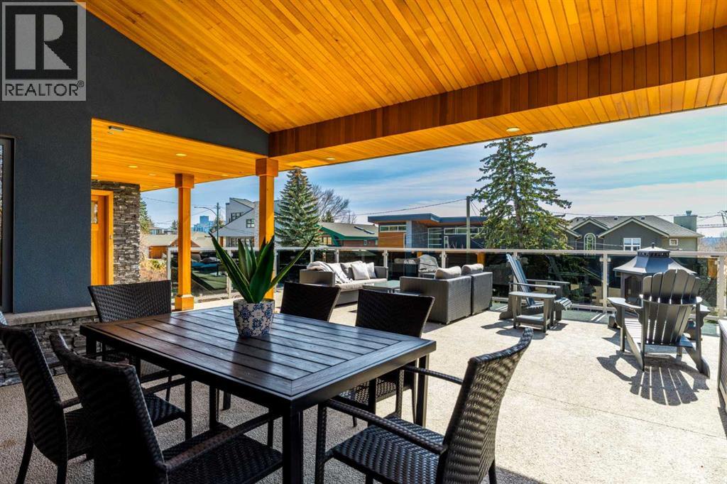 In an era of generic luxury, this striking home, with architectural lines redefined by Architect Richard Davignon, is an elevated sanctuary for the active, executive family. Sprawling over 4,000 square feet of developed living space on a generous 75’ wide lot, this residence perfectly bridges a vibrant inner-city lifestyle with seamless access to the mountains. William Blake Homes was enlisted to execute the dramatic primary suite, while Marvel Kitchens designed the heart of the home, a sophisticated culinary hub focused on performance. It features a massive quartz island with glimpses of the downtown skyline, high-end appliances, clever cabinetry, and a dedicated coffee bar area. Adjacent, the Davignon designed studio, built over the garage space, is an exercise in intentional, architectural detail; defined by soaring ceilings and an expansive gas fireplace, this light-filled space offers independent front and back exterior access, serving effortlessly as a professional home office option or the home's primary gathering hub. Ascend to the primary suite, a masterwork by William Blake Homes. The private balcony offers cinematic, dual-directional views of both the city skyline and the Rocky Mountains. A study in quiet luxury, the suite features 12ft vaulted ceilings, a sunroom, and a meticulous 5-piece ensuite where heated floors extend even into the shower, complemented by a deep soaker tub and heated towel rack. The remainder of the upper level houses 2 additional generously-sized bedrooms with substantial closets, and a large family bath, all positioned at the rear of the home for ultimate privacy. The lower levels are equally purposeful: the north side offers a self-contained retreat with a family room, bedroom, bath, kitchenette type space, and laundry, ideal for teens, nannies, or generational living. The south side transitions into the ultimate active base, featuring a home gym (or 5th bedroom) and a dedicated gear room for ski tuning, bike maintenance or stora ge, complete with a cold room for wine. This leads to the attached triple garage, a core feature for the collector, redefined with over-height ceilings to accommodate a car lift and an innovative tandem bay. Outdoor living is prioritized through a series of defined spaces, beginning with a partially covered, south-facing patio off the entrance that facilitates effortless alfresco dining or a glass of wine while taking in the views. The private, tiered backyard is an entertainment retreat featuring multi-level decking, a hot tub, elevated flat space to play, and a double parking pad off the back lane. The front yard presents a sophisticated, climate-conscious xeriscape for a low-maintenance lifestyle. Located within walking distance to amenities and offering rapid access to the Children’s and Foothills Hospitals, the U of C, The Calgary Winter Club and downtown, the home is finished with enduring materials, including a 50-yr blue metal roof, upgraded insulation, and an efficient multi-zoned heating system. (id:63190)