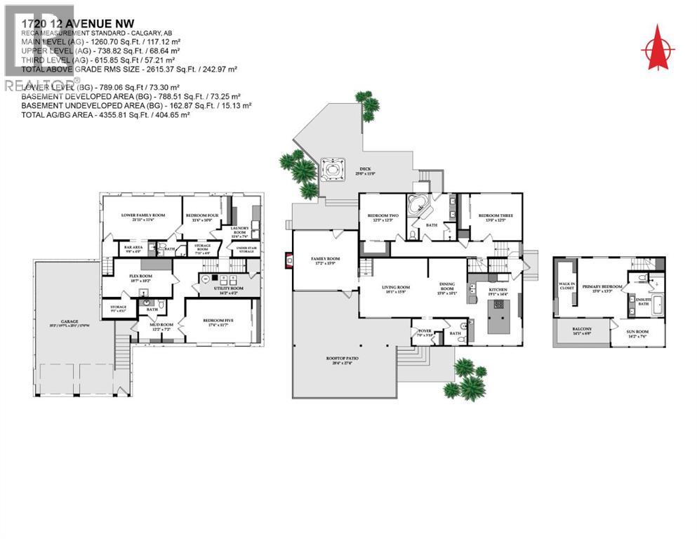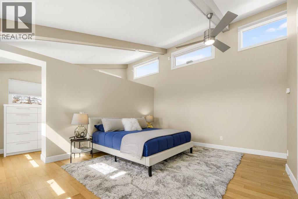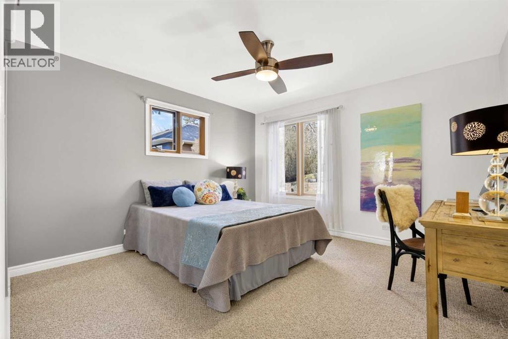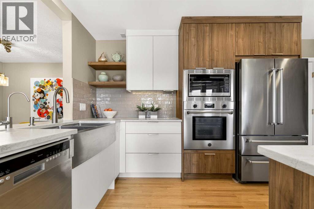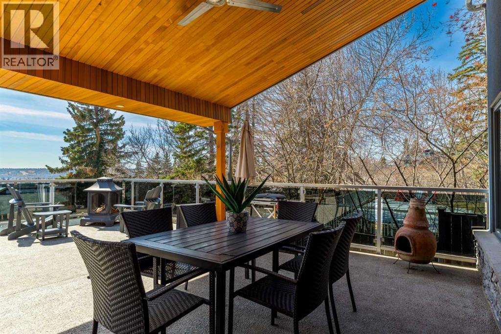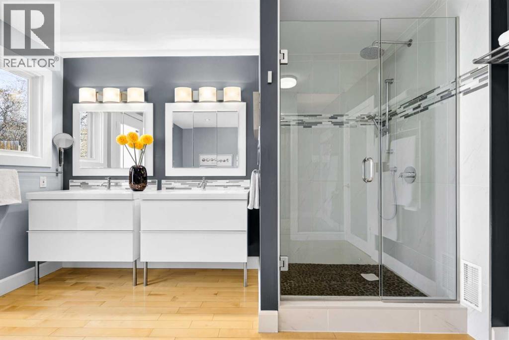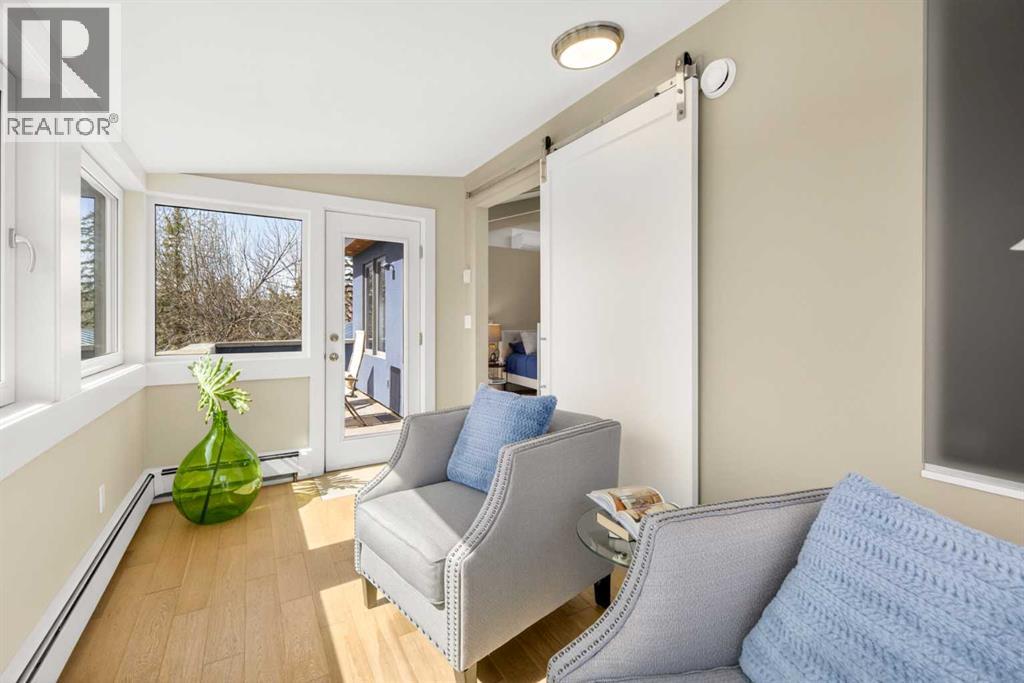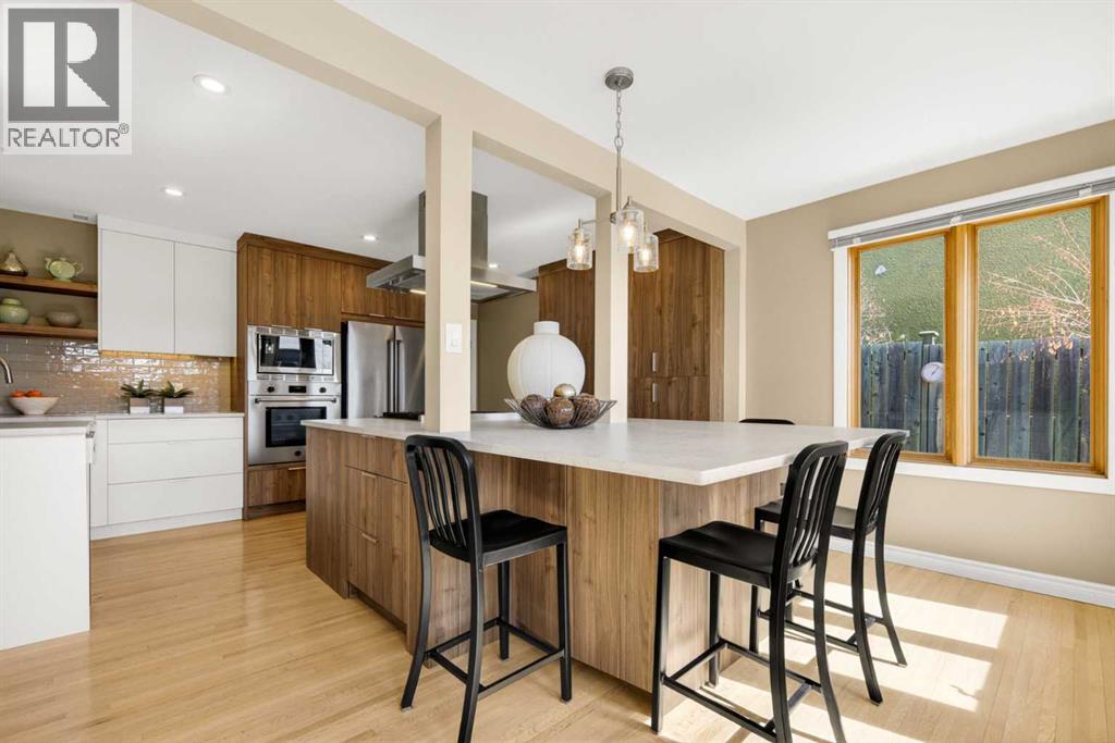 In an era of generic luxury, this striking home, with architectural lines redefined by Architect Richard Davignon, is an elevated sanctuary for the active, executive family. Sprawling over 4,000 square feet of developed living space on a generous 75’ wide lot, this residence perfectly bridges a vibrant inner-city lifestyle with seamless access to the mountains. William Blake Homes was enlisted to execute the dramatic primary suite, while Marvel Kitchens designed the heart of the home, a sophisticated culinary hub focused on performance. It features a massive quartz island with glimpses of the downtown skyline, high-end appliances, clever cabinetry, and a dedicated coffee bar area. Adjacent, the Davignon designed studio, built over the garage space, is an exercise in intentional, architectural detail; defined by soaring ceilings and an expansive gas fireplace, this light-filled space offers independent front and back exterior access, serving effortlessly as a professional home office option or the home's primary gathering hub. Ascend to the primary suite, a masterwork by William Blake Homes. The private balcony offers cinematic, dual-directional views of both the city skyline and the Rocky Mountains. A study in quiet luxury, the suite features 12ft vaulted ceilings, a sunroom, and a meticulous 5-piece ensuite where heated floors extend even into the shower, complemented by a deep soaker tub and heated towel rack. The remainder of the upper level houses 2 additional generously-sized bedrooms with substantial closets, and a large family bath, all positioned at the rear of the home for ultimate privacy. The lower levels are equally purposeful: the north side offers a self-contained retreat with a family room, bedroom, bath, kitchenette type space, and laundry, ideal for teens, nannies, or generational living. The south side transitions into the ultimate active base, featuring a home gym (or 5th bedroom) and a dedicated gear room for ski tuning, bike maintenance or stora ge, complete with a cold room for wine. This leads to the attached triple garage, a core feature for the collector, redefined with over-height ceilings to accommodate a car lift and an innovative tandem bay. Outdoor living is prioritized through a series of defined spaces, beginning with a partially covered, south-facing patio off the entrance that facilitates effortless alfresco dining or a glass of wine while taking in the views. The private, tiered backyard is an entertainment retreat featuring multi-level decking, a hot tub, elevated flat space to play, and a double parking pad off the back lane. The front yard presents a sophisticated, climate-conscious xeriscape for a low-maintenance lifestyle. Located within walking distance to amenities and offering rapid access to the Children’s and Foothills Hospitals, the U of C, The Calgary Winter Club and downtown, the home is finished with enduring materials, including a 50-yr blue metal roof, upgraded insulation, and an efficient multi-zoned heating system. (id:63190)