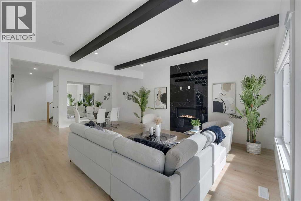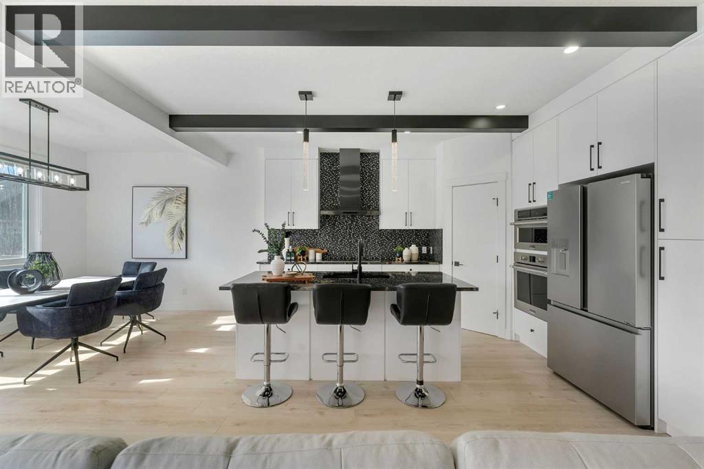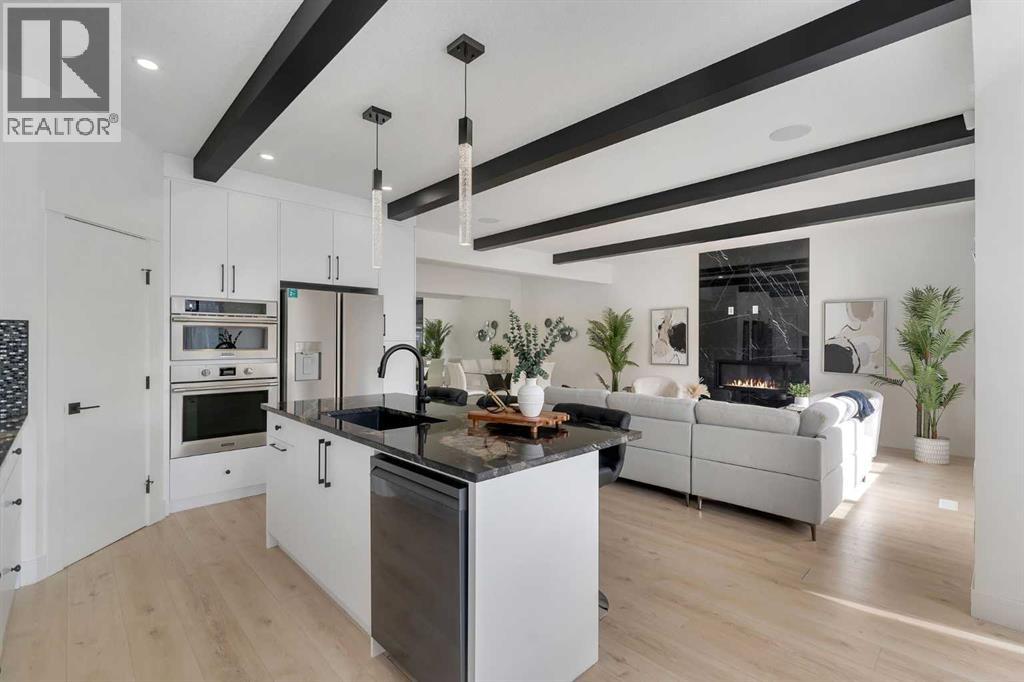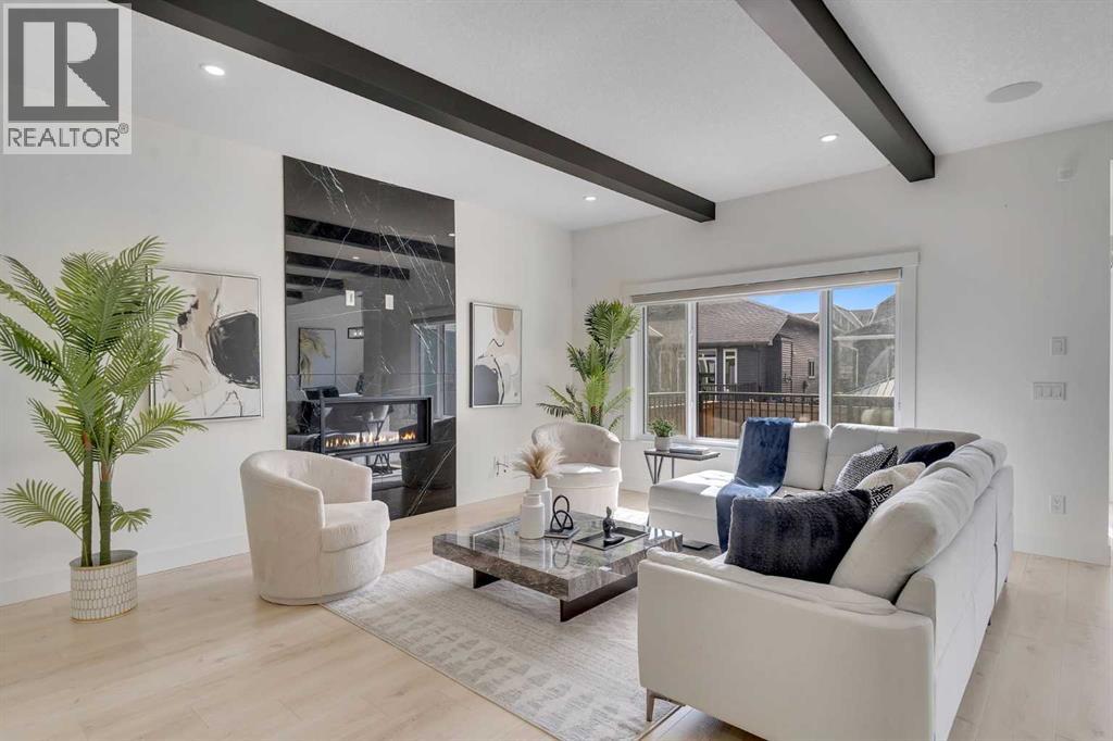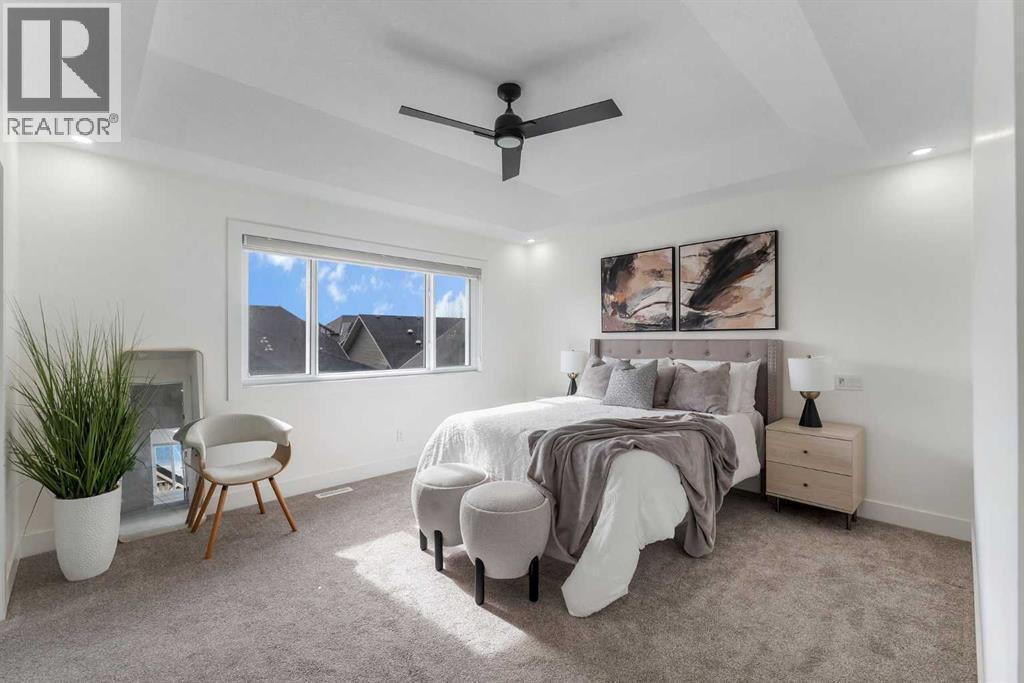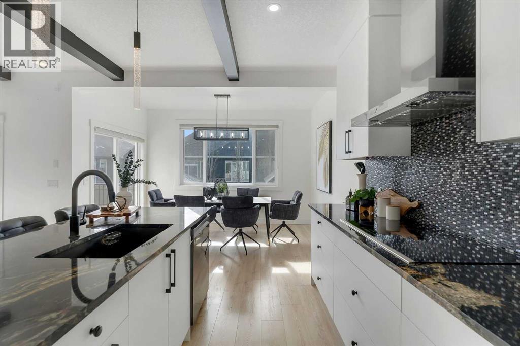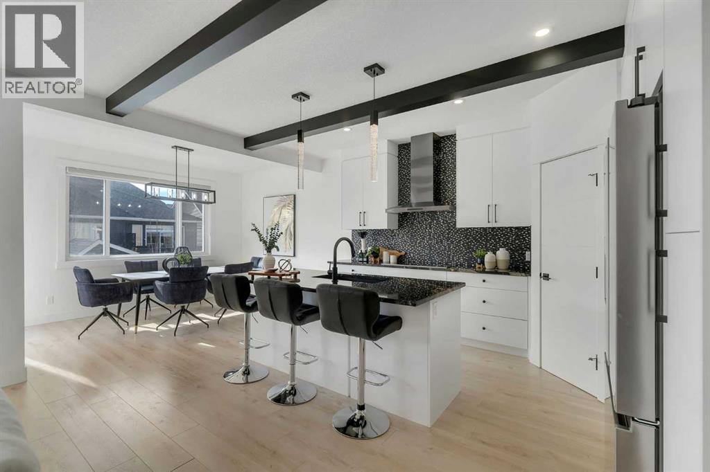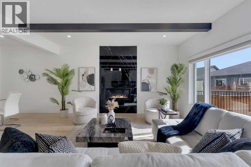 Welcome to this stunning luxury home located in the highly sought-after community of Coopers Crossing. Offering approximately 2,637 sq. ft. of thoughtfully designed living space, this elegant two-storey residence perfectly combines modern upgrades with timeless style.This home features 5 spacious bedrooms and 4 full bathrooms, ideal for growing families or multi-generational living. The main floor boasts a bright and open layout, complete with two dining areas, a full bedroom, and a 3-piece bathroom with a standing shower. The grand double-door entrance creates a welcoming first impression.The chef-inspired kitchen is beautifully upgraded with built-in appliances, a chimney-style hood fan, ceiling-height cabinetry, and sleek black hardware throughout. The living room showcases a striking feature fireplace with bold black tile detailing, adding warmth and sophistication. Large windows across the main floor allow for an abundance of natural light, while the elegant spindle railing enhances the overall design.Upstairs, you will find 4 generously sized bedrooms and 3 full bathrooms, along with a spacious bonus/family room featuring a vaulted ceiling—perfect for relaxation or entertainment. The primary bedroom offers a tray ceiling, a luxurious 5-piece ensuite with a jetted tub, separate glass shower, and a large walk-in closet.The upper-level laundry room is equipped with a sink and additional storage for convenience. All secondary bedrooms are well-proportioned, with access to two additional full bathrooms.Step outside to enjoy a large rear deck and fully fenced backyard—ideal for outdoor living. A side entrance to the basement provides excellent potential for future development.The home is further enhanced with durable and premium James Hardie (Hardie Board) exterior siding and features a Double wide car garage, offering extended parking space or additional storage flexibility.Conveniently located close to schools, parks, playgrounds, and shopping plaza s, this home delivers exceptional value in one of Airdrie’s most prestigious neighbourhoods.Don’t miss this incredible opportunity to own a premium home in Coopers Crossing. (id:63190)