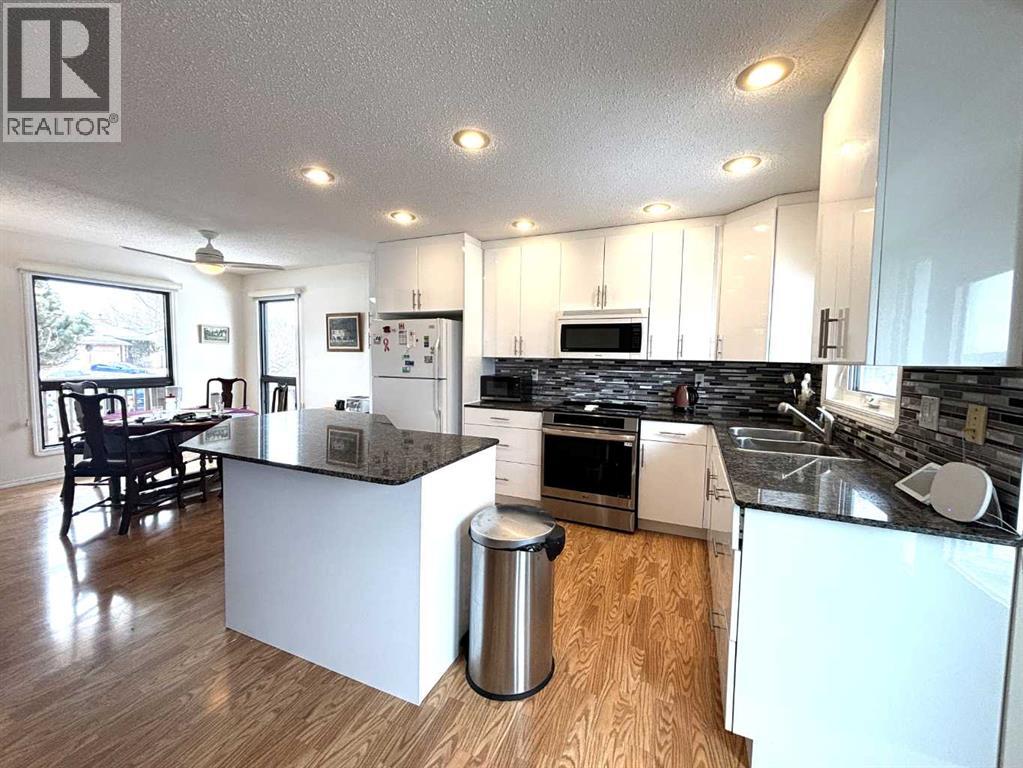 "SAME OWNERS- 40 YEARS - UPGRADED BUNGALOW -DOUBLE GARAGE- OVERLOOK THE GOLF COURSE !!!" This updated bungalow and double garage sits on a massive 11069 sq.ft. fenced lot and offers a front driveway, back alley access and has nobody behind you . These long term owners of 40 years have beautifully transformed this large fenced lot into a nature's paradise offering plum trees, saskatoons, honeysuckles, apple trees, red currents, cherry trees, raspberries, rhubarb , lilacs, tons of perennial flowers and raised vegetable boxes. There are concrete walkways and a large back decorative block deck to sit and enjoy the back yard.. This bungalow has had all windows replaced, with triple pane windows on the north side of the home, and double pane windows on the south side. The kitchen was replaced with soft closing drawers, tile backsplash and granite countertops. There's a large kitchen island as well. Other improvements include new shingles on the home within the last 5 years, new metal roof on the garage in 2024, newer recessed lighting, added insulation in the attic and added hot water on demand. All interior doors up and down have also been replaced . This bungalow also has convenient main floor laundry. The main floor has an open concept and has a nice sitting room/bedroom as well as a living room. and a full bathroom. The primary bedroom has a full 4-piece ensuite by itself There is also a second 3-piece bathroom on the main level. The basement is finished with 2 more bedrooms and another full 4-piece bathroom. The basement also has a large family room , office space and has a potential perfect setup for a second kitchen with the original kitchen cabinets and sink installed already for extra family members if desired. All appliances and shed are staying with this rare opportunity to own a home that has lovingly been owned and upgraded by the same owners for 40 years !!! (id:63190)