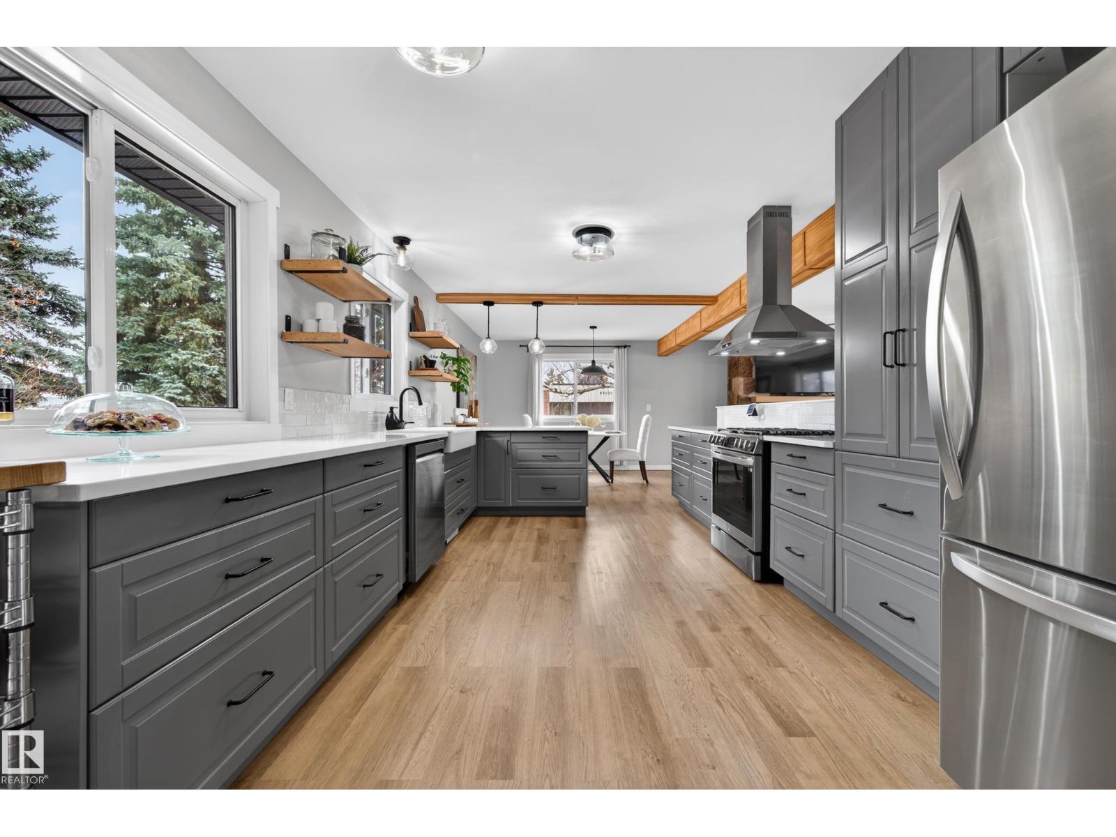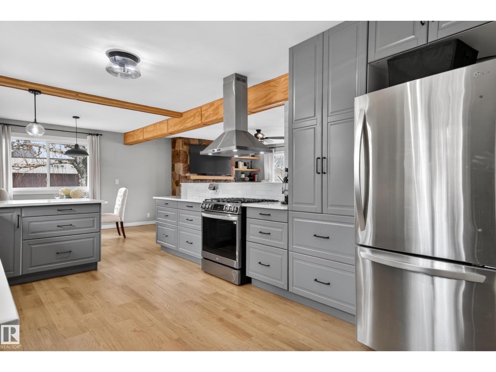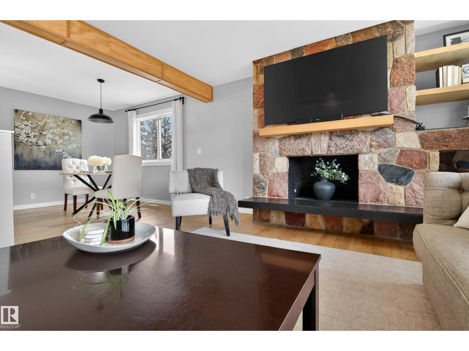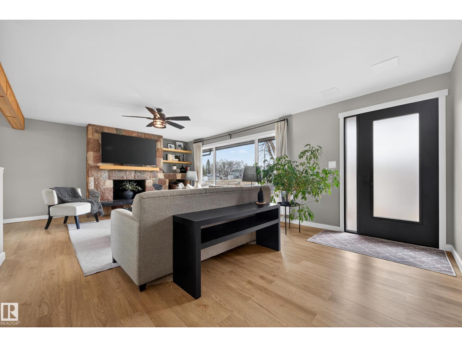 This UNIQUE 6 Beds + 3 Baths A/C HOME has 3650.25 Sq Ft of Development w/HEATED TRIPLE GARAGE on a MASSIVE .52 ACRE CORNER LOT (on 3 titles) in BRUDERHEIM! Entering you see the BUILT-IN bookcase, LVP flooring, WOODEN Ceiling Beams + NEUTRAL colour tones throughout. The Wood Fireplace is SHOWCASED by the BEAUTIFUL STONEWORK w/Wooden MANTLE + Bookcases in the Living room. There is the Dining room + SLEEK Kitchen has Modern Cabinetry, SS Appliances incl/GAS Stove, QUARTZ Countertops w/Breakfast Bar, a Tile Backsplash + the door leading to the North Backyard incl/Deck. A 4 pc Bath, 4 Beds, the Primary Bed, a 5 pc EN-SUITE Bath + a WALK-IN Closet. The Mudroom & Laundry room lead to Garage. The Reno'd Basement has the 6th Bed, Flex room, a 3 pc Bath, a HUGE Rec room w/WOOD Fireplace, + Utility room. The Backyard has RV Parking, so much room to use! More Upgrades: Roof/H2O/Furnace in 2022, Windows/Doors/Basement in 2025. This BEAUTIFUL HOME is VALUE for the $$$, ENJOY! (id:63190)