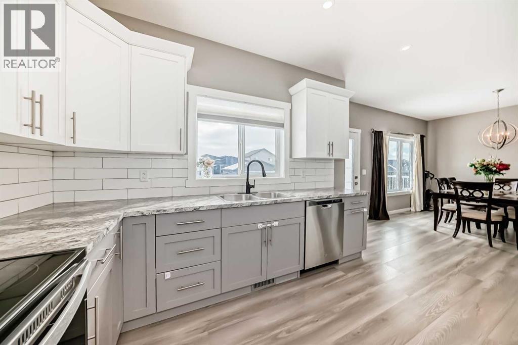 Welcome to this beautifully maintained 2022-built home offering modern design, quality finishes, and exceptional value. Showcasing a bright open-concept layout, the main floor features a spacious living room with a coffered ceiling, textured detail, large windows, durable laminate plank flooring, and a stylish gas fireplace.The kitchen is both functional and elegant, complete with abundant cabinetry with crown moulding, a full tile backsplash, stainless steel appliances, and a full-size pantry. The adjoining dining area provides access to a sunny, south-facing deck and a large backyard—perfect for entertaining.The primary bedroom offers a private retreat with a four-piece ensuite and dual closets. Two additional front-facing bedrooms are well sized and filled with natural light.The fully fenced yard features a high-quality vinyl fence, and the lawn has been professionally landscaped and meticulously maintained.The unfinished basement boasts high ceilings and in-floor heating roughed in, offering excellent potential for future development.Additional features include a high-efficiency furnace and heat recovery ventilation system.Located in the desirable Laredo community, close to shopping and amenities, this home combines style, comfort, and future potential. Move-in ready and a must-see! (id:63190)