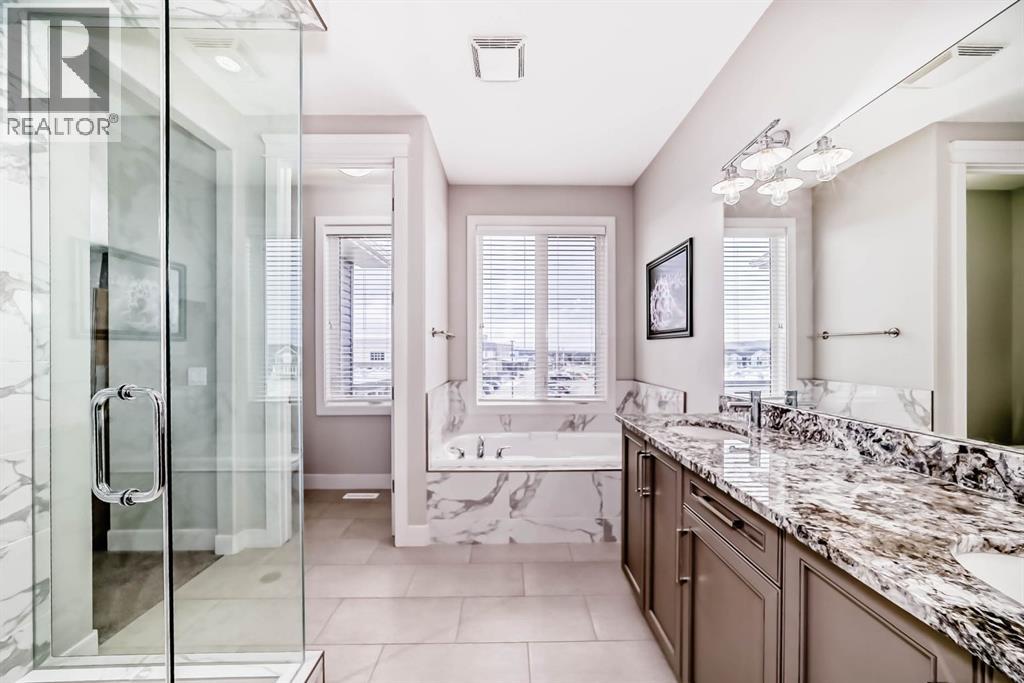 This home is a true 10/10—pride of ownership is evident throughout and BEST VALUE in Fireside!Originally a Janssen Showhome and still with the original owners, this impeccably maintained property has it all! Step into the spacious foyer and immediately notice the soaring 9-foot ceilings and impressive 8-foot doors on both the main and upper levels. Rich hardwood flooring flows seamlessly into the open-concept living and kitchen areas. The kitchen features custom wood cabinetry with under-cabinet lighting, a brand-new stainless steel appliance package including a gas stove, and a stunning granite waterfall island. The large dining nook leads out to a beautifully landscaped backyard. Enjoy outdoor living with a new composite deck, privacy fencing, a stamped concrete patio, and a hot tub—perfect for entertaining or relaxing. A 6-foot wooden fence provides exceptional privacy all around. Back inside, the walk-through pantry conveniently connects to the oversized, heated garage, which offers ample storage options. Upstairs, the central bonus room—with peak-a-boo mountain views—creates a great separation between two spacious front bedrooms, a 4-piece bathroom, a 3rd bedroom currently used as a home office, and the impressive primary retreat at the rear. The luxurious 5-piece ensuite includes a glass-enclosed, heated shower and a walk-in closet outfitted with custom built-ins.The fully finished lower level offers a 5th bedroom, another full 4-piece bath, and a spacious family room with additional flex space—perfect for a home gym, media room, or play area.Additional upgrades and features include: Gemstone exterior lighting, Central A/C, Full irrigation system (front & back), Extended driveway, Custom Hunter Douglas blinds throughoutThis home is move-in ready with nothing left to do—just unpack and enjoy! (id:63190)