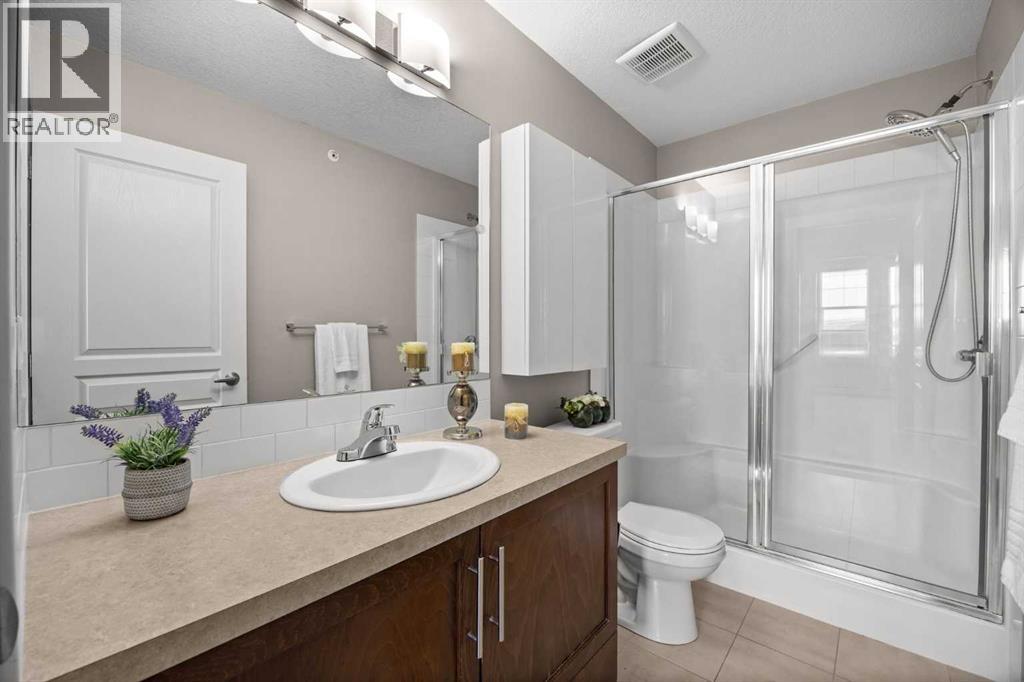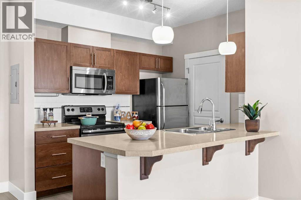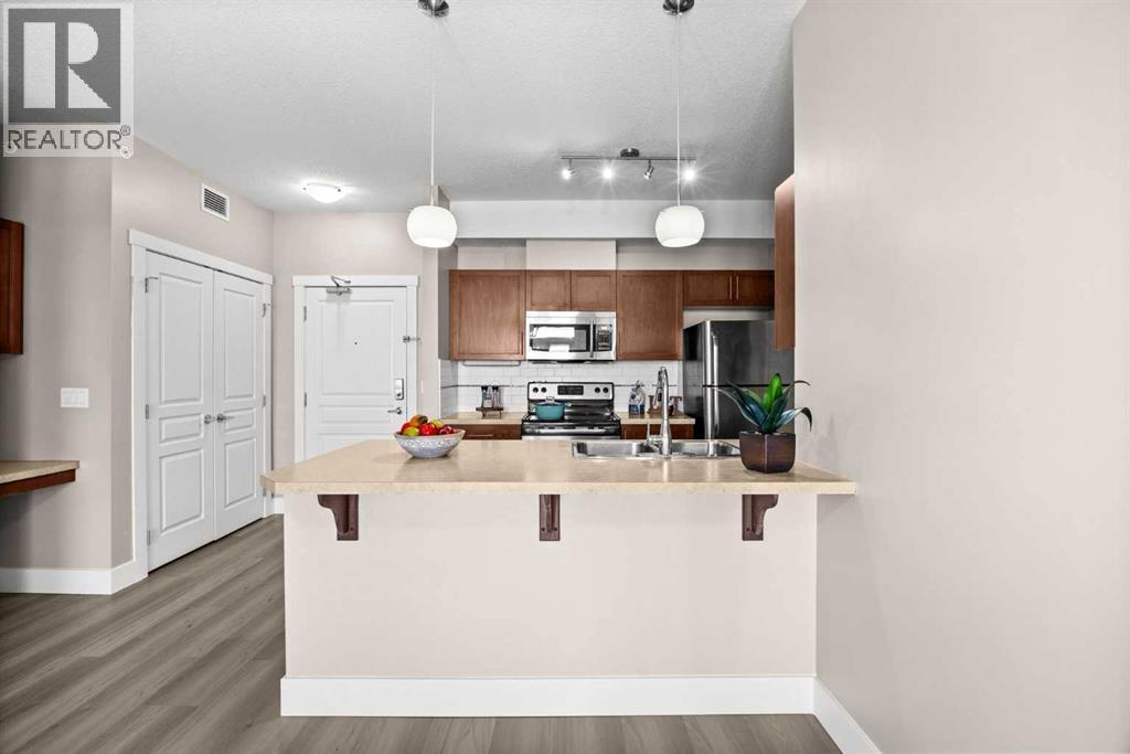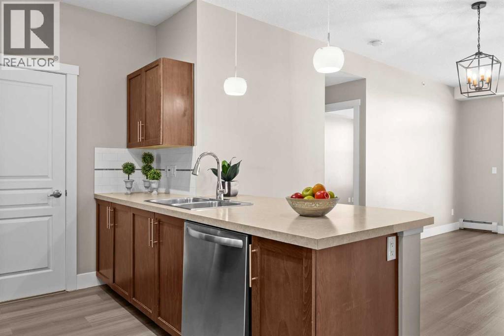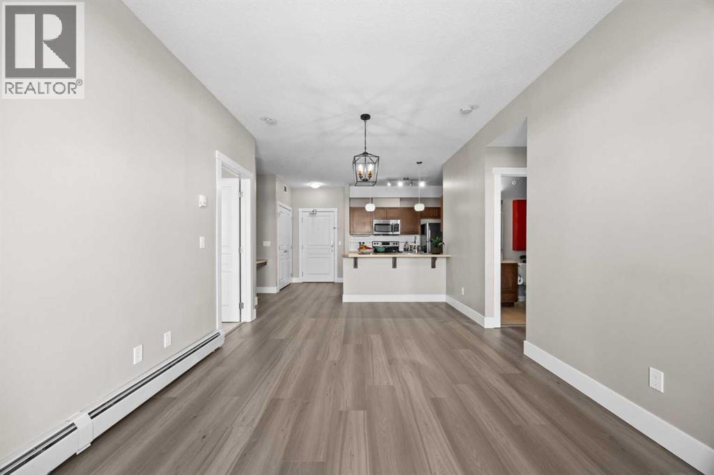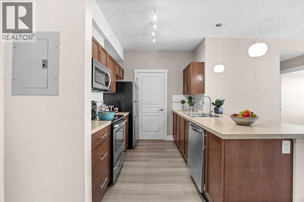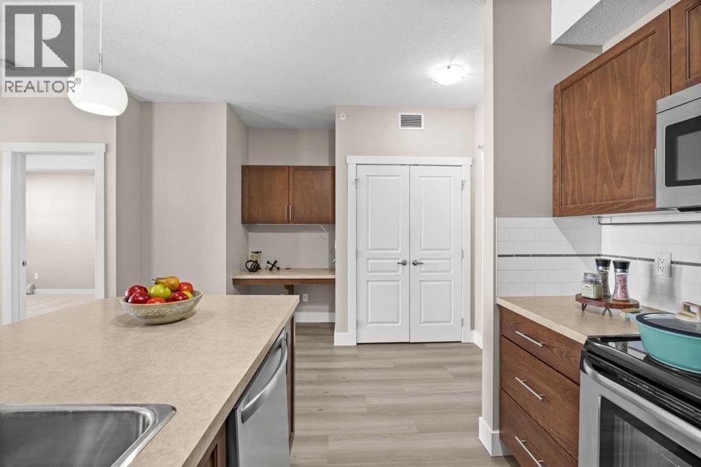 Welcome to this beautifully updated 2-bedroom, 2-bathroom apartment in the desirable community of Evanston. Situated on the TOP FLOOR, this unit offers a bright, functional layout with enhanced privacy and thoughtful upgrades throughout. The home features BRAND-NEW vinyl plank flooring in the main living areas and BRAND-NEW carpet in both bedrooms. The open-concept kitchen is equipped with stainless steel appliances and flows seamlessly into the living and dining spaces—perfect for both everyday living and entertaining. The primary bedroom includes a walk-in closet and a private ensuite bathroom. The second bedroom is generously sized and ideal for guests, family, or a home office. A built-in desk adds excellent functionality for working or studying from home. Step out onto your private top-floor balcony to enjoy morning coffee or unwind in the evening with open views and added privacy. Additional highlights include: UNDERGROUND TITLED PARKING stall, in-suite laundry, with the laundry room doubling as a spacious storage area and an assigned external storage unit, providing even more storage space. The location is unbeatable—just minutes from Creekside and Sage Hill Crossing shopping centres, offering major retailers such as Walmart, T&T Supermarket, banks, and a wide variety of amenities. With easy access to Stoney Trail and Shaganappi Trail, commuting across the city is quick and convenient. This well-maintained condo offers the perfect balance of comfort, convenience, and value, making it an excellent opportunity for homeowners and investors alike. Come, visit, and make this your new place to call home. (id:63190)