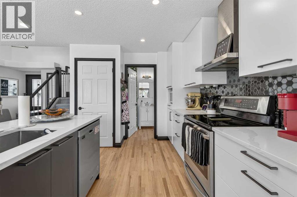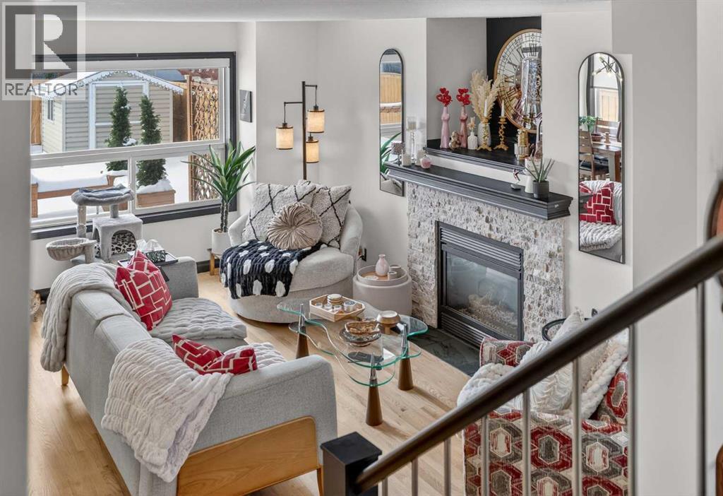 This beautifully warm and inviting home features a unique and thoughtfully designed layout, offering the perfect blend of comfort, functionality, and investment potential. Tucked away in a very quiet part of the neighbourhood, this bright and sunny property is ideally located near the airport, major roadways, and within walking distance to schools.A modern cubism-inspired chandelier welcomes you at the front entry, complemented by a stunning new front door. The main floor features an open-concept layout with a fully updated kitchen (2019), complete with newer cabinetry, quartz countertops, a stylish backsplash, updated appliances, and LED pot lighting—creating a bright and inviting space. A beautifully executed gas fireplace in the living room, along with refinished original hardwood flooring, adds to the home’s warm and homely feel.Heading upstairs via the unique split staircase, you’ll find a well-designed layout with a generous primary bedroom complete with an ensuite, while two additional bedrooms are thoughtfully positioned on the opposite side with their own full bathroom. All bathrooms have been upgraded with newer Toto toilets.This home has seen numerous upgrades, including a new concrete side walkway, refrigerator (2023), washer and dryer (2022), central A/C (2022), and a roof replacement approximately in 2020. Additional improvements include a newer fence, updated blinds, refinished hardwood flooring, LVP flooring on the upper level, and freshly painted interior walls, doors, and frames.The stunning south-facing backyard is a true highlight, offering abundant natural light and a private outdoor space that is simply priceless.A fantastic opportunity to own a well-maintained home in a desirable and convenient location. (id:63190)