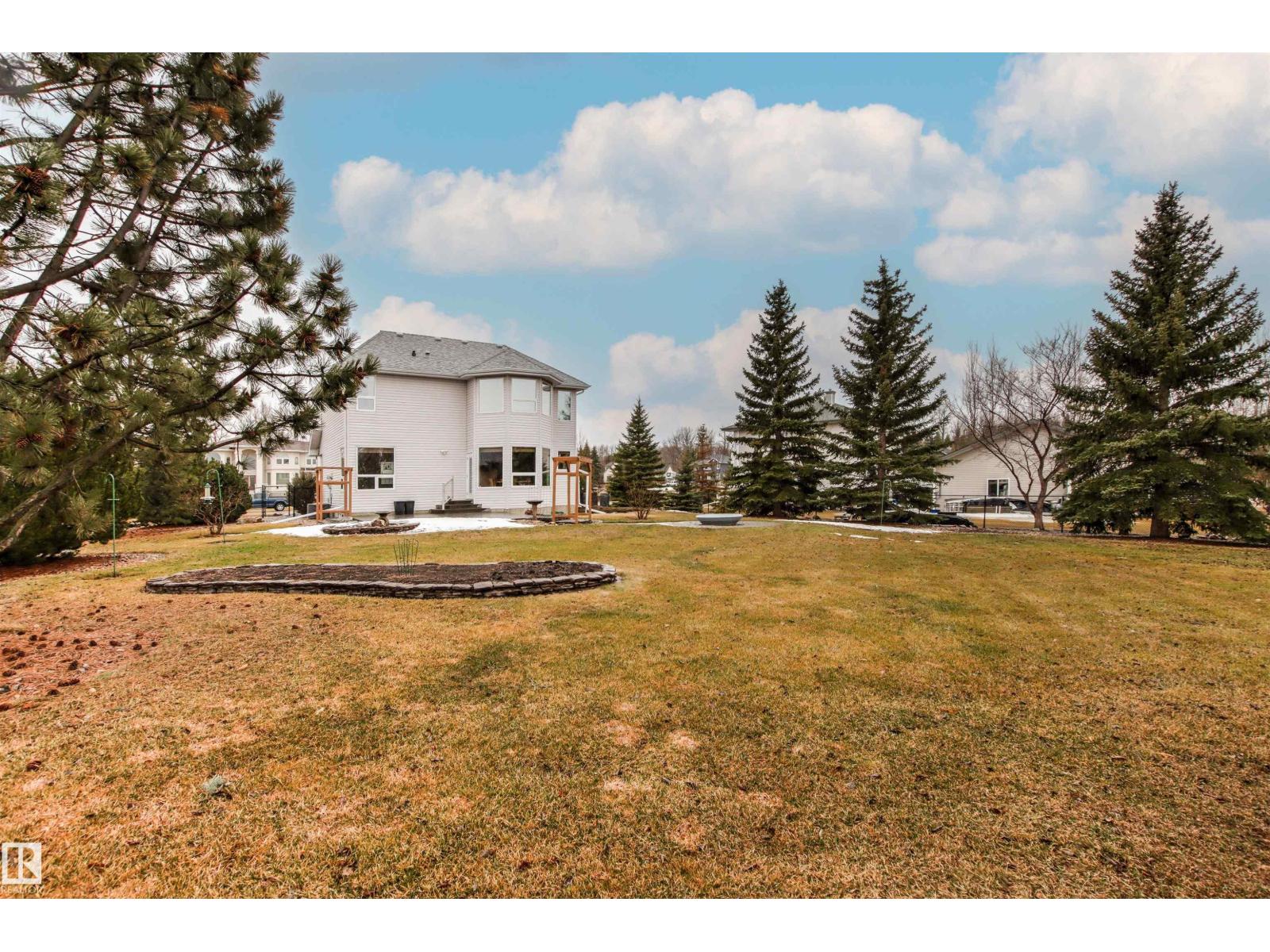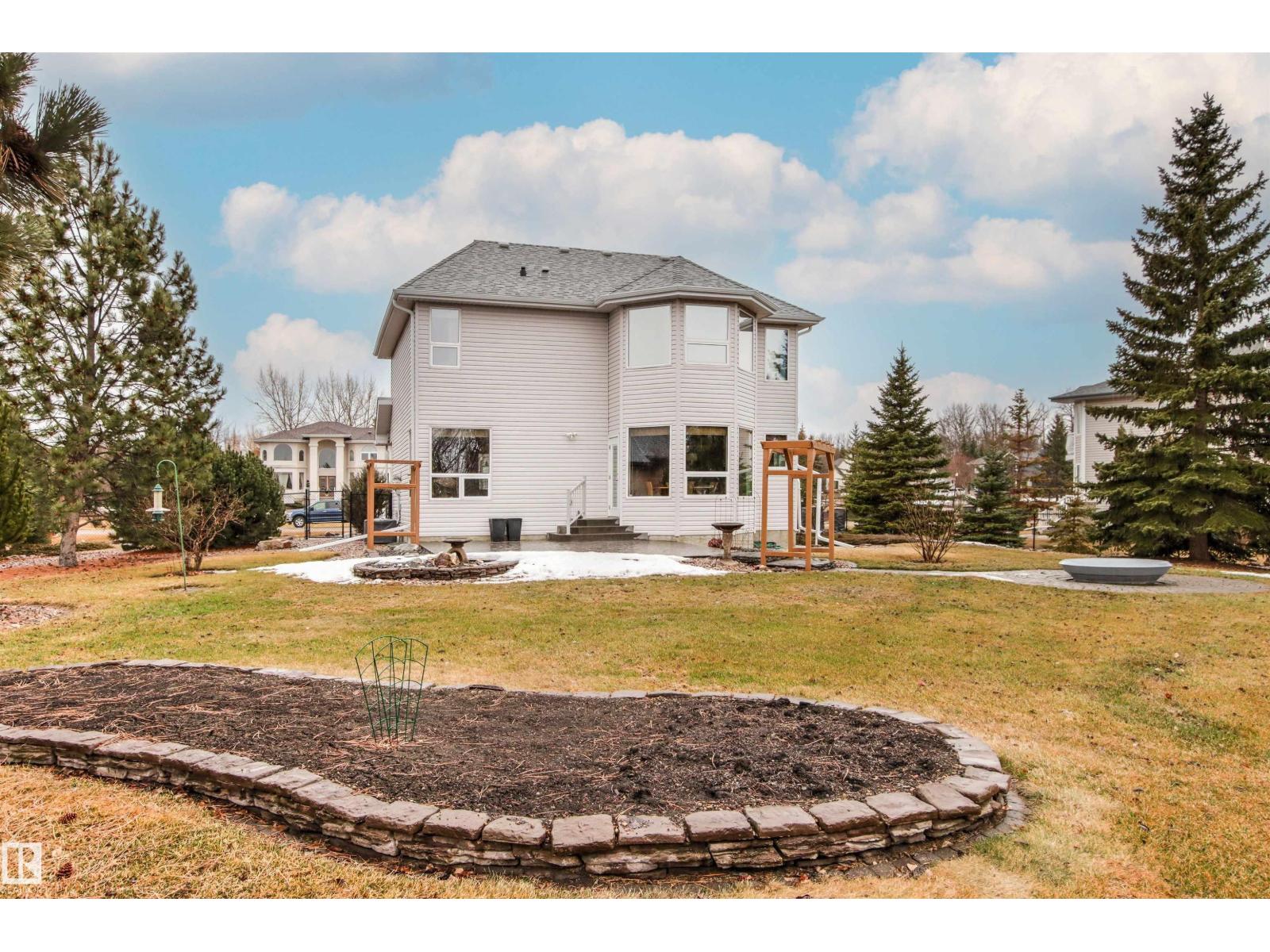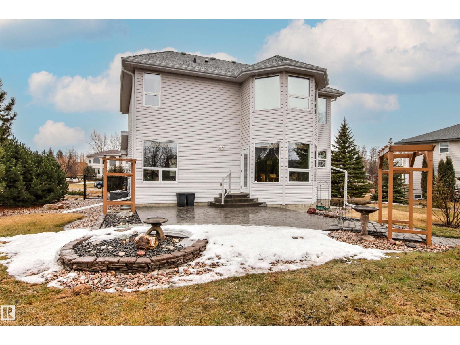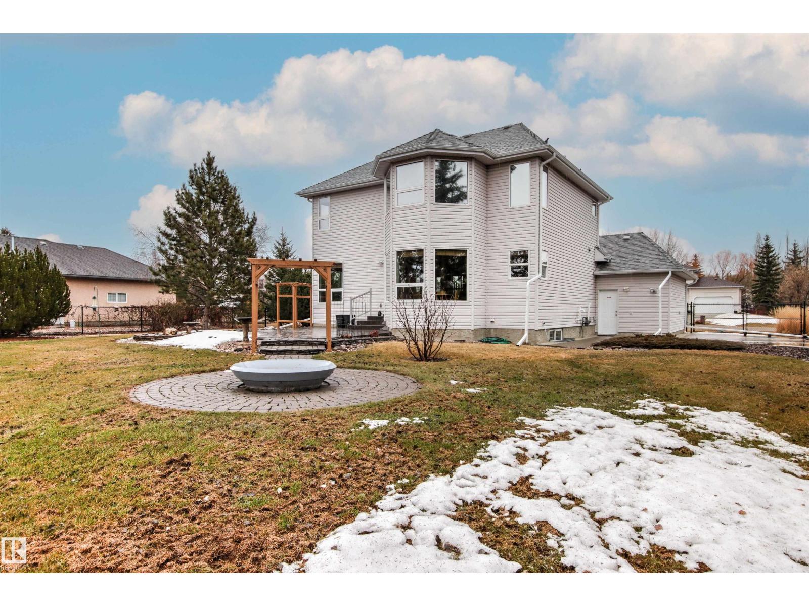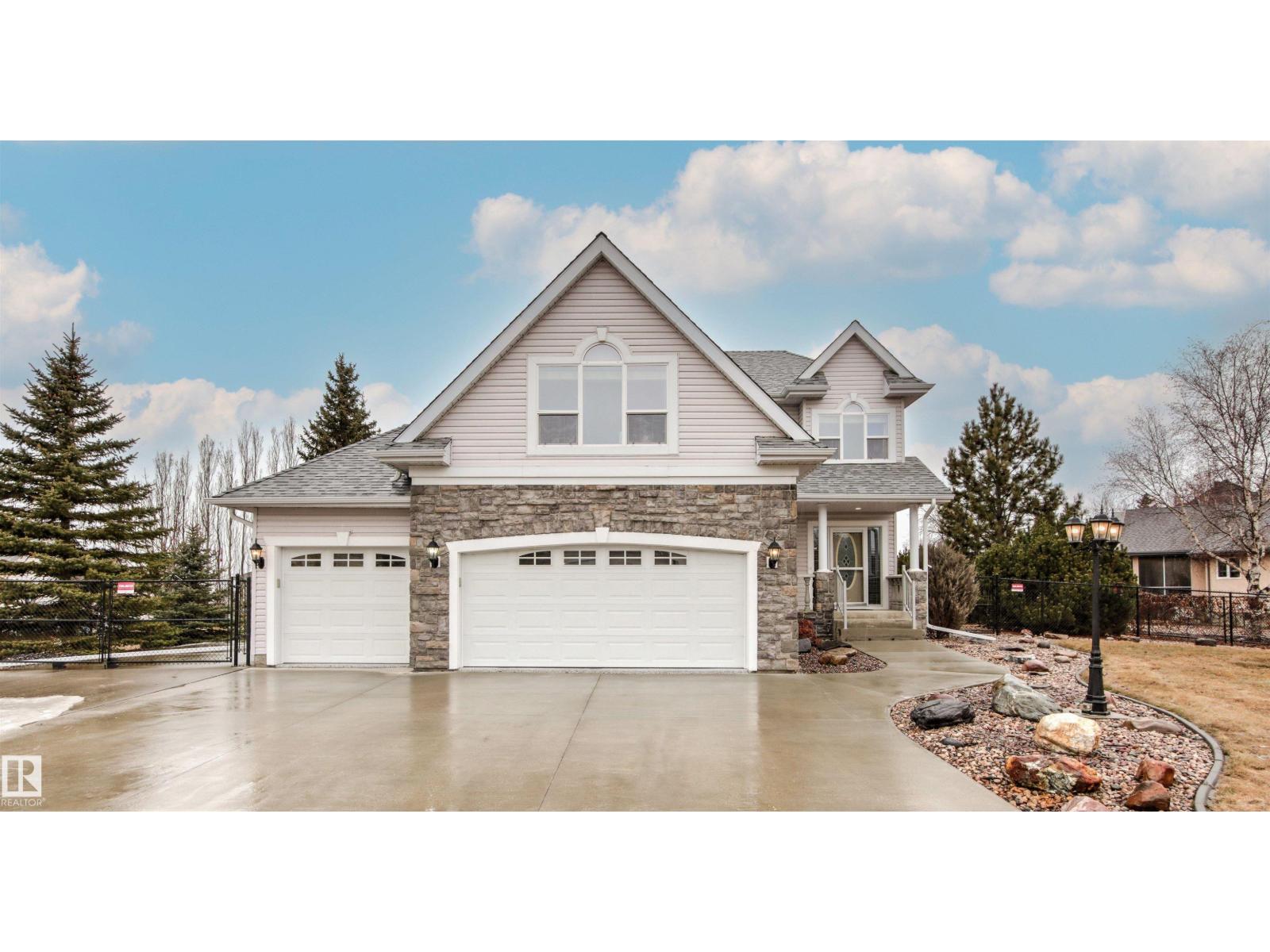 Prestige, privacy, and timeless quality meet in sought-after Lakeshore Estates, just minutes from Edmonton! Set on an impressive 1/2 acre lot, this exceptional 2-storey home offers refined acreage living with modern comforts throughout. Rich maple hardwood and custom cabinetry add warmth & elegance, while the chef-inspired kitchen features granite counters, large island with bar seating, and an open layout perfect for entertaining. Dining area offers beautiful views of rear yard and seats 6-8 + triple pane windows for natural light and efficiency. Enjoy year-round comfort with Central A/C, two gas fireplaces, and the added peace of mind of an interior sprinkler system. Upper level offers 3 spacious bedrooms plus a BONUS ROOM, including a stunning primary retreat with luxurious 5 pc ensuite. Outside, enjoy beautifully landscaped grounds with stamped concrete patio, fire pit, RV parking, storage shed, and room to roam. Triple attached heated garage with 240V wiring completes this rare offering. A MUST SEE! (id:63190)