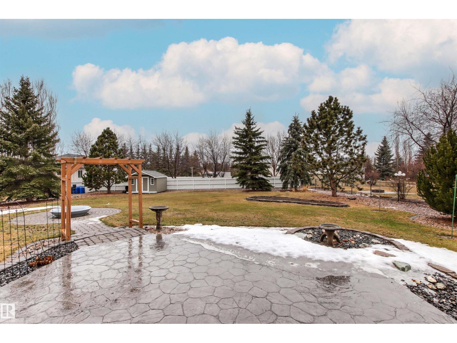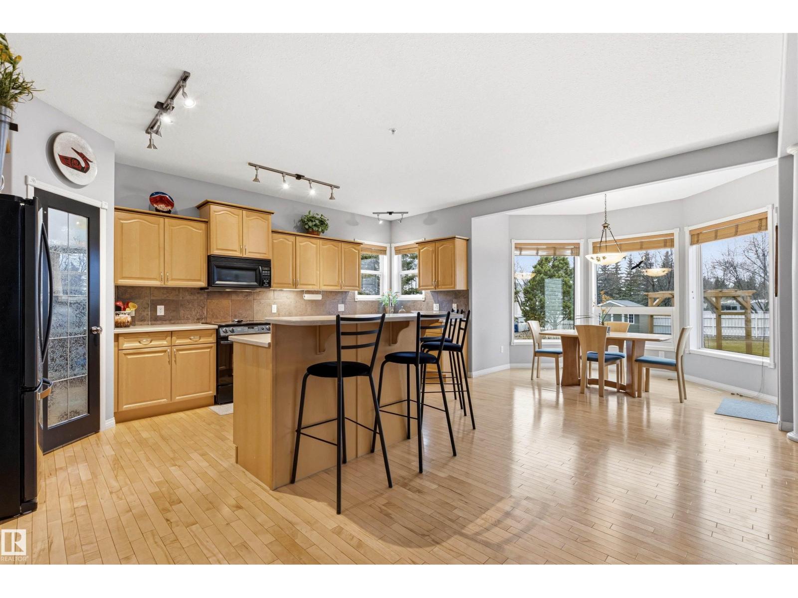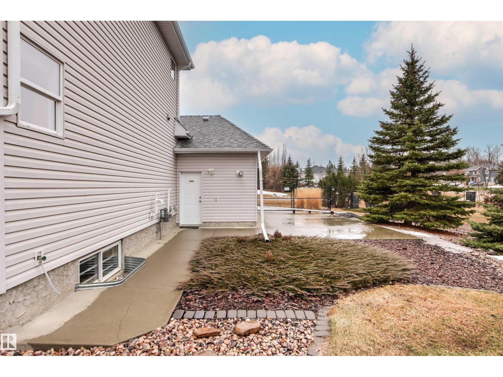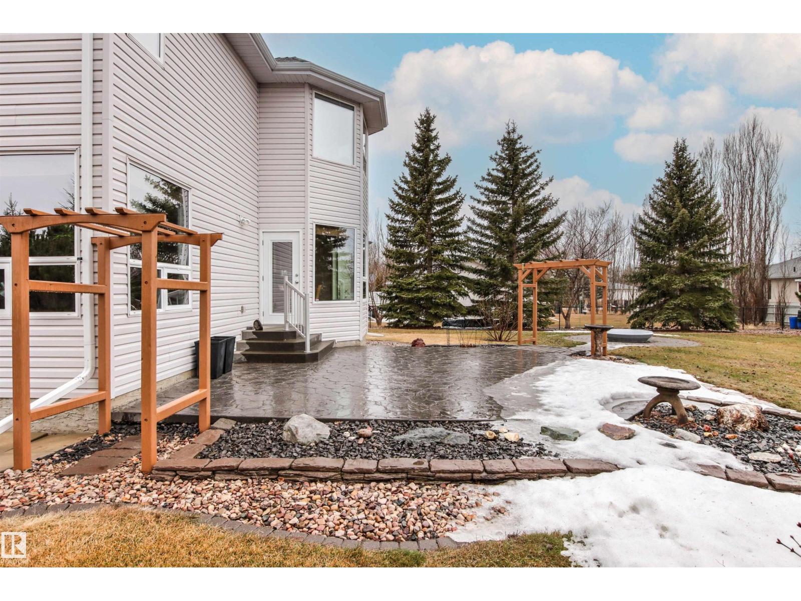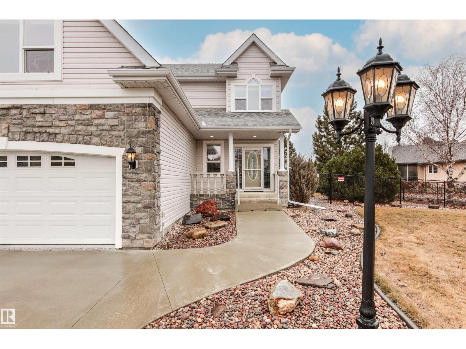 Prestige, privacy, and timeless quality meet in sought-after Lakeshore Estates, just minutes from Edmonton! Set on an impressive 1/2 acre lot, this exceptional 2-storey home offers refined acreage living with modern comforts throughout. Rich maple hardwood and custom cabinetry add warmth & elegance, while the chef-inspired kitchen features granite counters, large island with bar seating, and an open layout perfect for entertaining. Dining area offers beautiful views of rear yard and seats 6-8 + triple pane windows for natural light and efficiency. Enjoy year-round comfort with Central A/C, two gas fireplaces, and the added peace of mind of an interior sprinkler system. Upper level offers 3 spacious bedrooms plus a BONUS ROOM, including a stunning primary retreat with luxurious 5 pc ensuite. Outside, enjoy beautifully landscaped grounds with stamped concrete patio, fire pit, RV parking, storage shed, and room to roam. Triple attached heated garage with 240V wiring completes this rare offering. A MUST SEE! (id:63190)