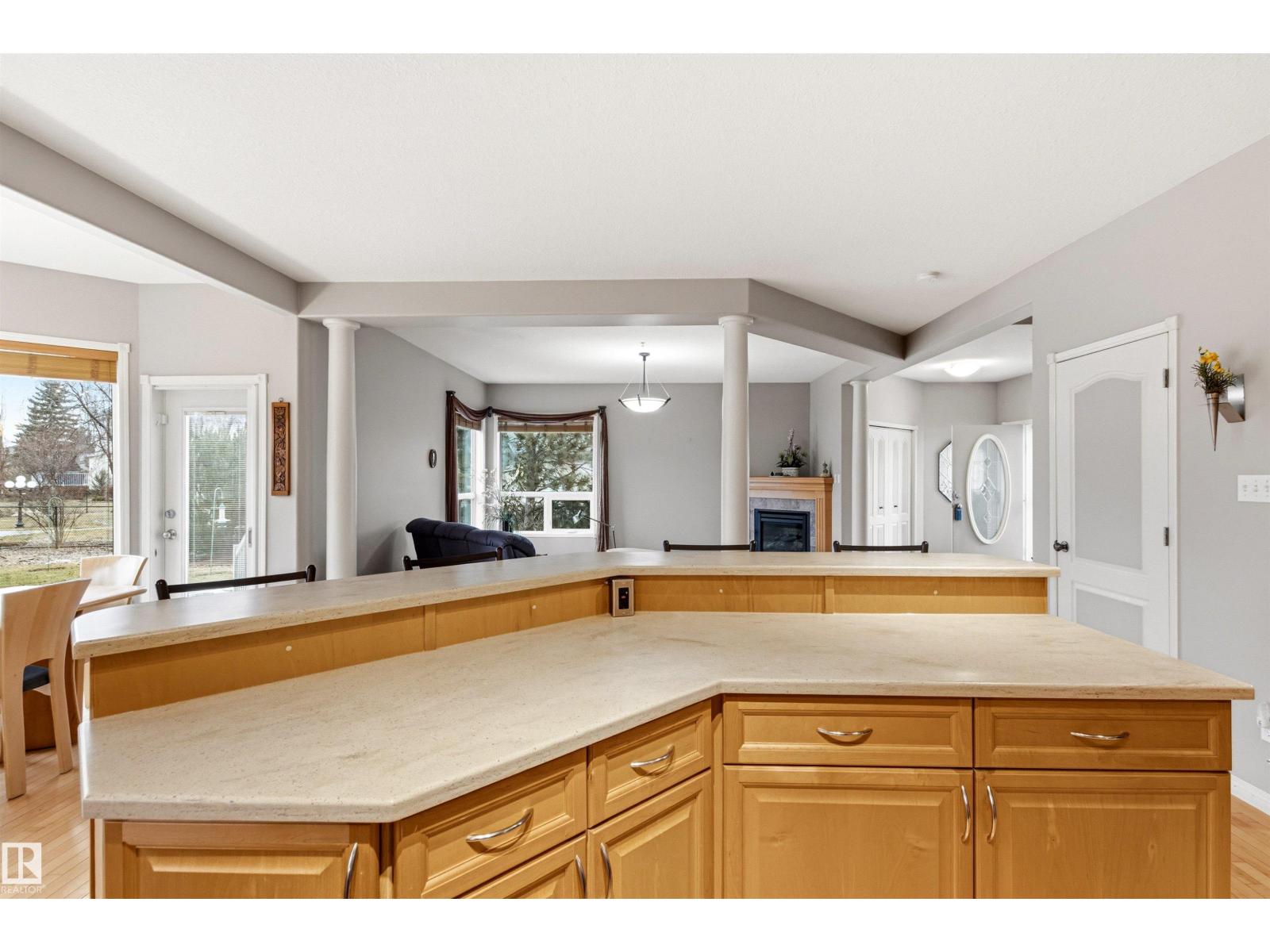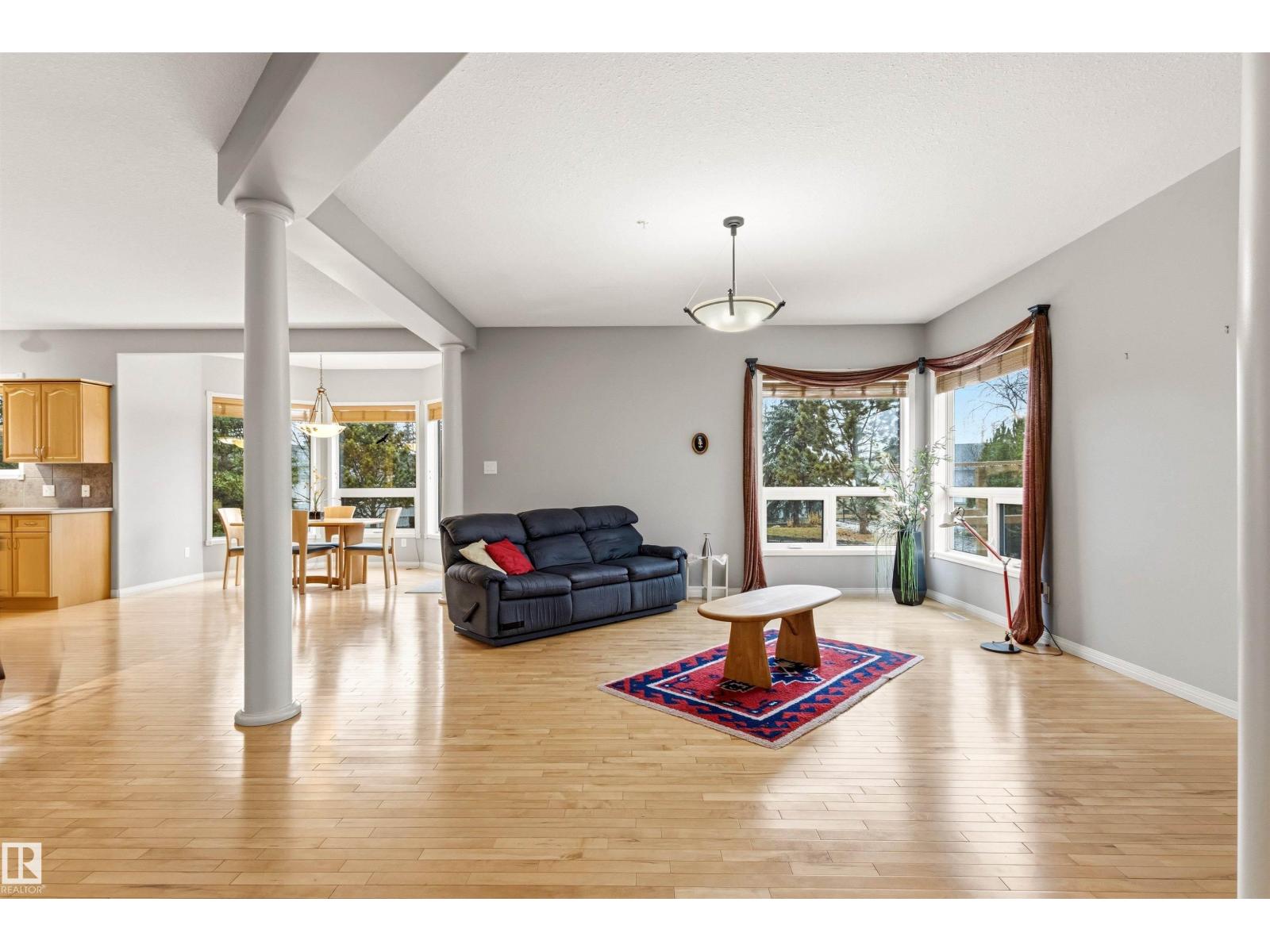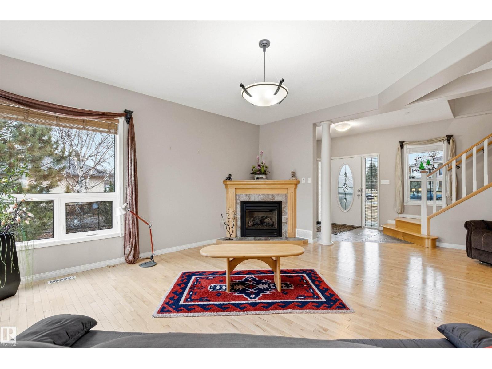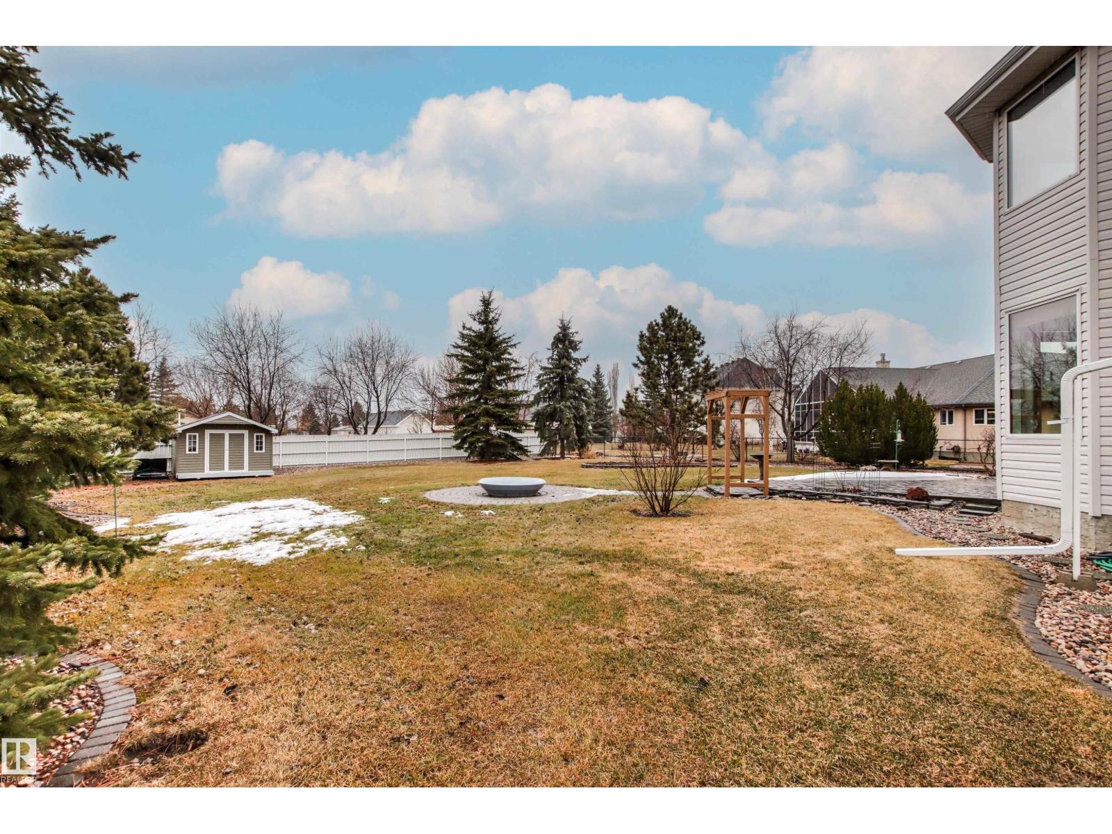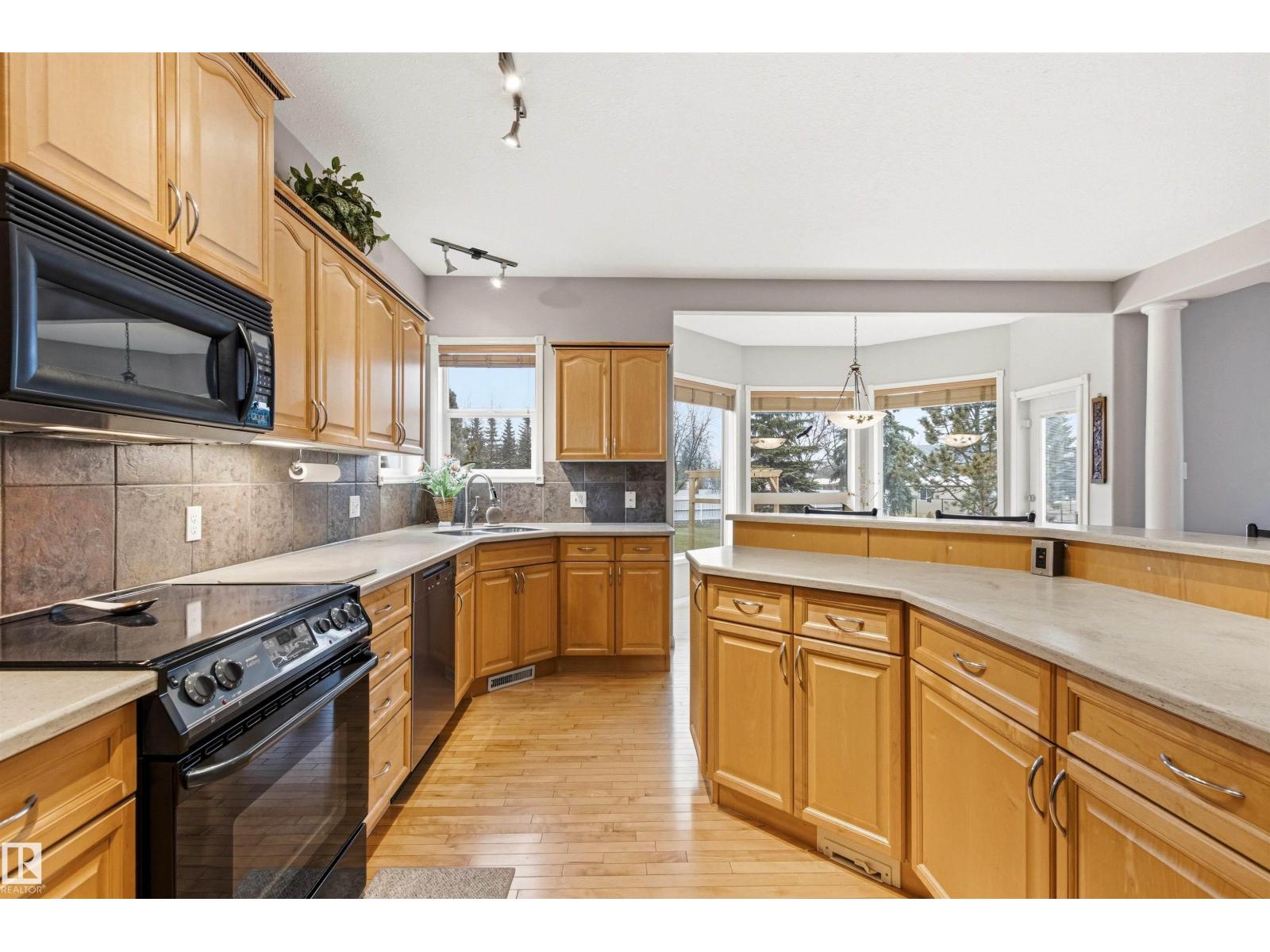 Prestige, privacy, and timeless quality meet in sought-after Lakeshore Estates, just minutes from Edmonton! Set on an impressive 1/2 acre lot, this exceptional 2-storey home offers refined acreage living with modern comforts throughout. Rich maple hardwood and custom cabinetry add warmth & elegance, while the chef-inspired kitchen features granite counters, large island with bar seating, and an open layout perfect for entertaining. Dining area offers beautiful views of rear yard and seats 6-8 + triple pane windows for natural light and efficiency. Enjoy year-round comfort with Central A/C, two gas fireplaces, and the added peace of mind of an interior sprinkler system. Upper level offers 3 spacious bedrooms plus a BONUS ROOM, including a stunning primary retreat with luxurious 5 pc ensuite. Outside, enjoy beautifully landscaped grounds with stamped concrete patio, fire pit, RV parking, storage shed, and room to roam. Triple attached heated garage with 240V wiring completes this rare offering. A MUST SEE! (id:63190)