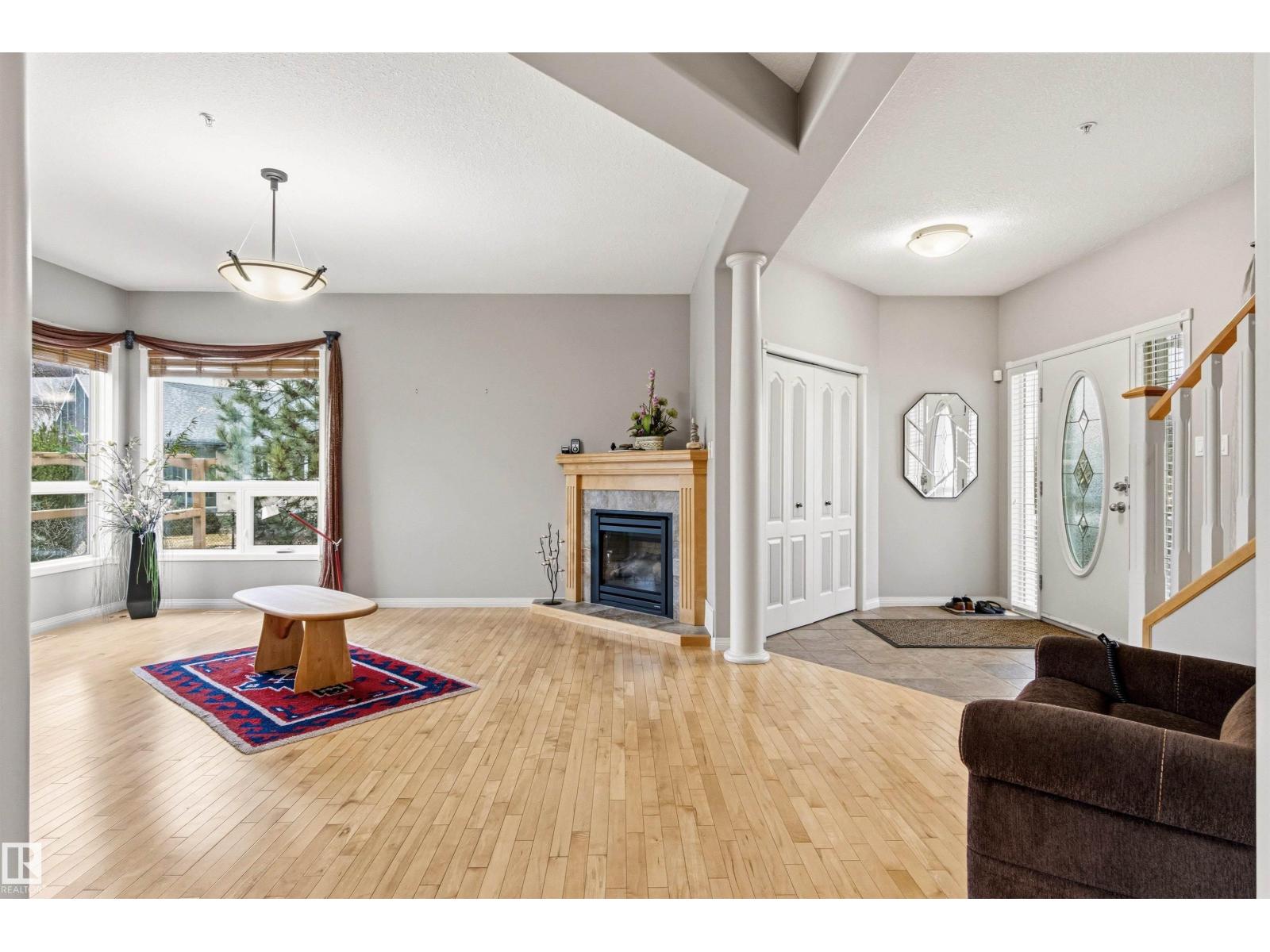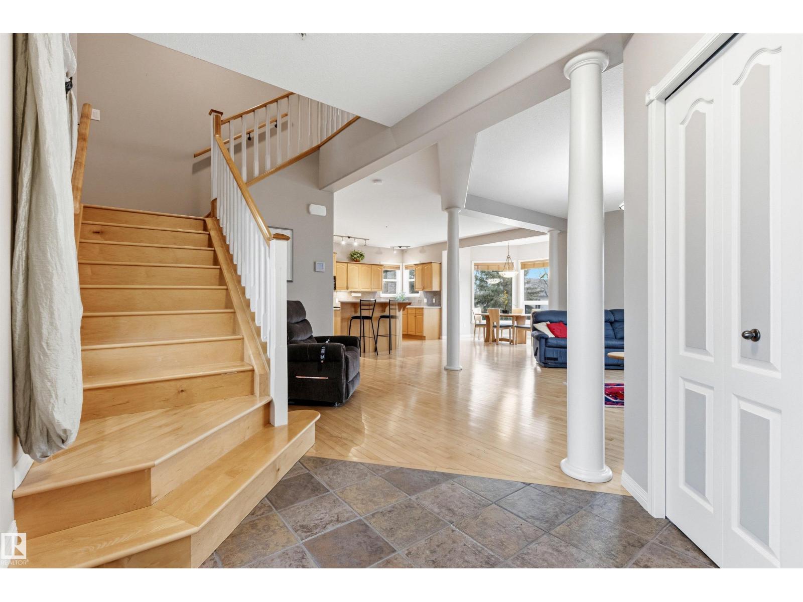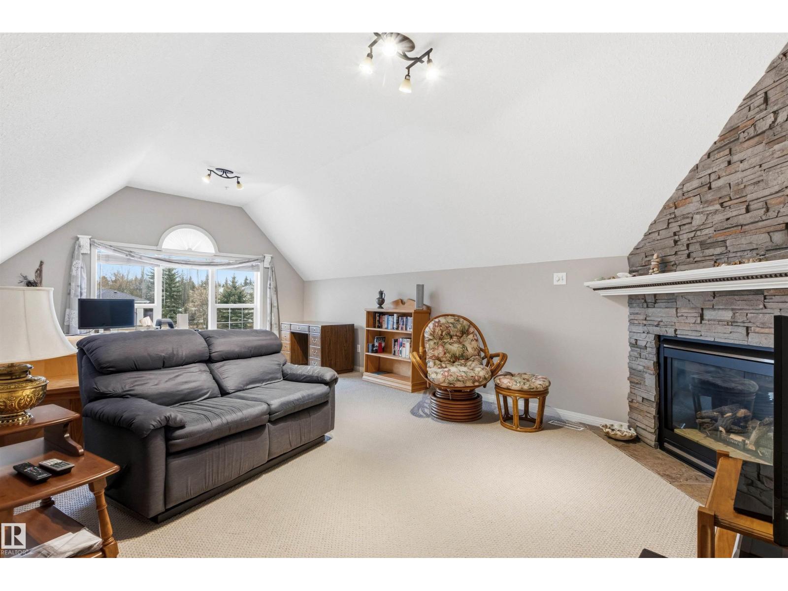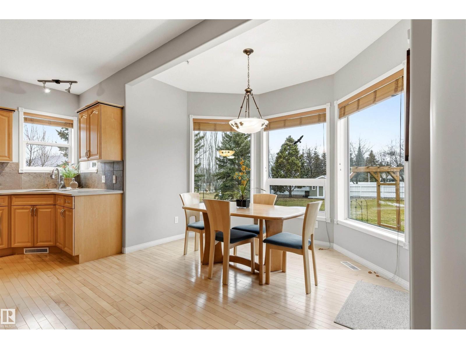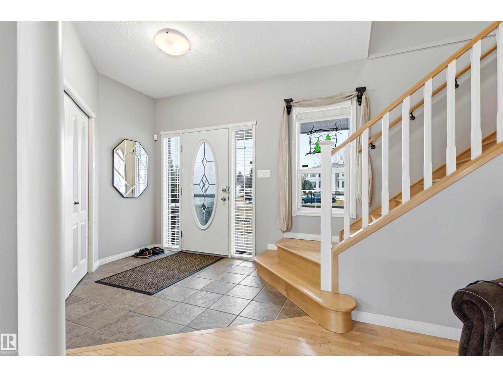 Prestige, privacy, and timeless quality meet in sought-after Lakeshore Estates, just minutes from Edmonton! Set on an impressive 1/2 acre lot, this exceptional 2-storey home offers refined acreage living with modern comforts throughout. Rich maple hardwood and custom cabinetry add warmth & elegance, while the chef-inspired kitchen features granite counters, large island with bar seating, and an open layout perfect for entertaining. Dining area offers beautiful views of rear yard and seats 6-8 + triple pane windows for natural light and efficiency. Enjoy year-round comfort with Central A/C, two gas fireplaces, and the added peace of mind of an interior sprinkler system. Upper level offers 3 spacious bedrooms plus a BONUS ROOM, including a stunning primary retreat with luxurious 5 pc ensuite. Outside, enjoy beautifully landscaped grounds with stamped concrete patio, fire pit, RV parking, storage shed, and room to roam. Triple attached heated garage with 240V wiring completes this rare offering. A MUST SEE! (id:63190)