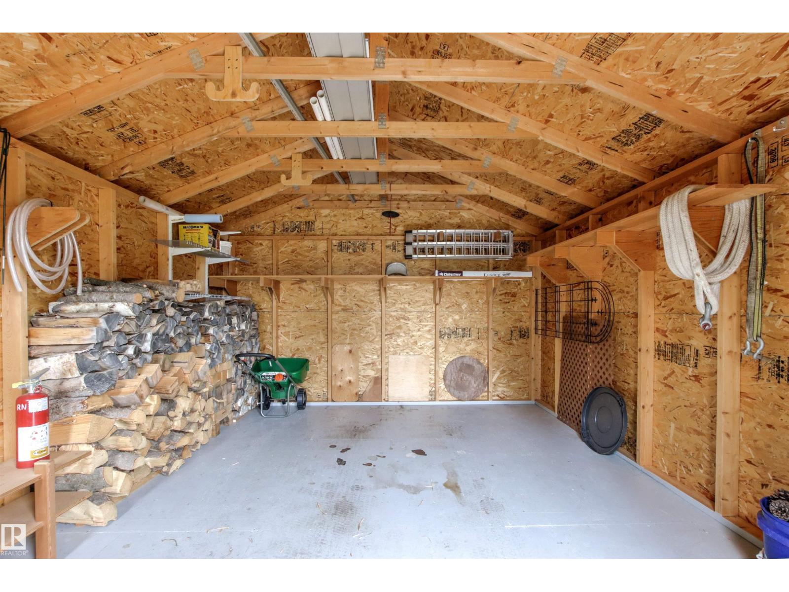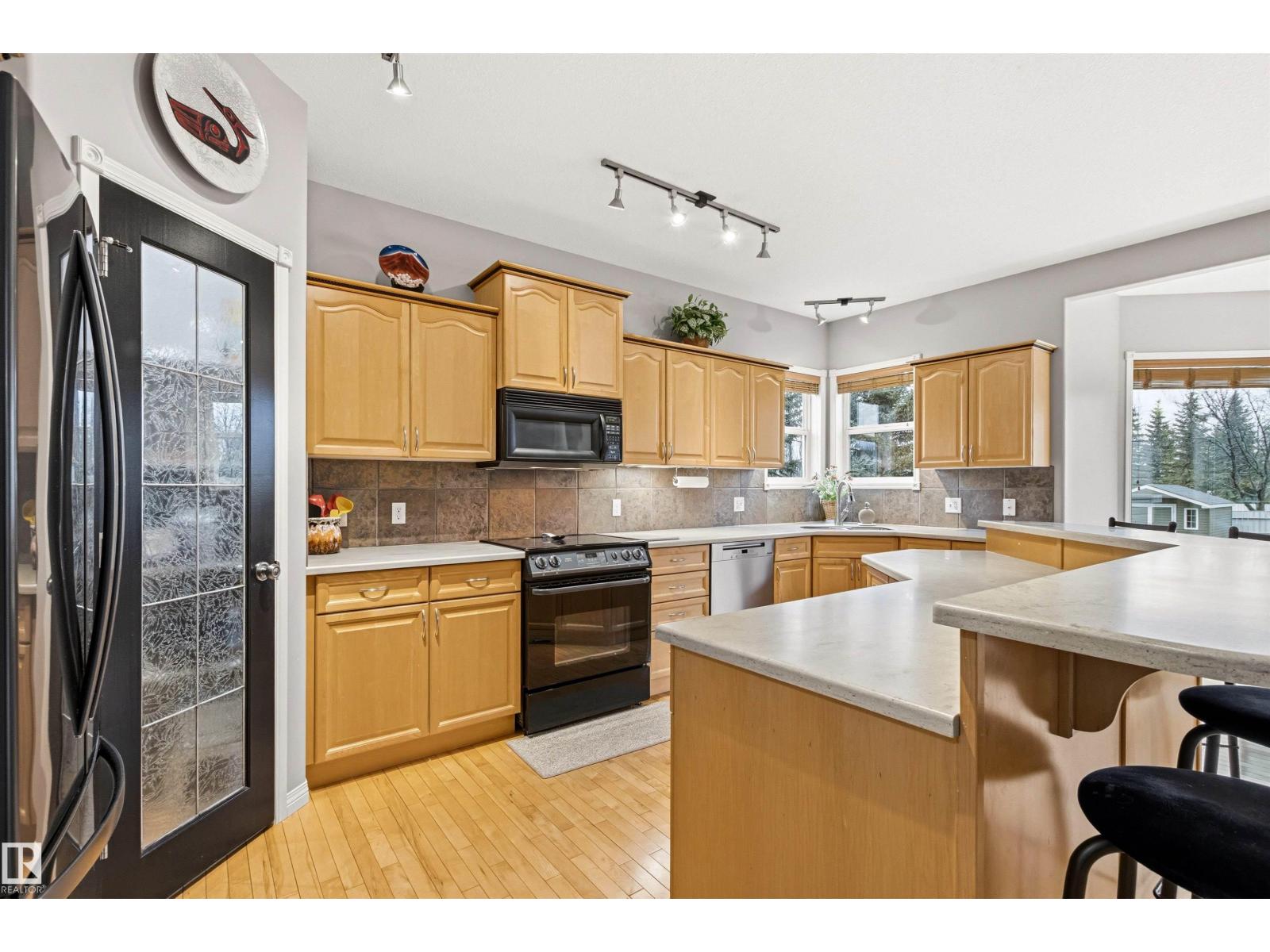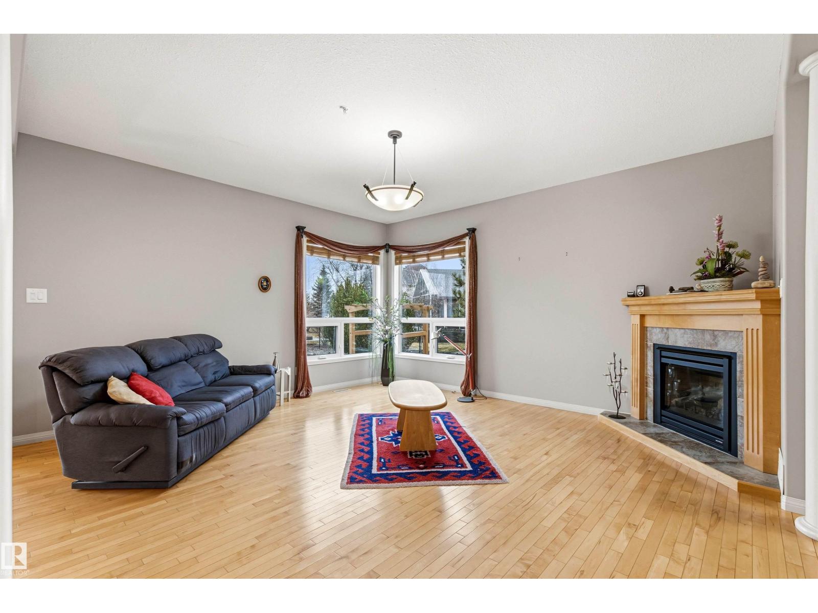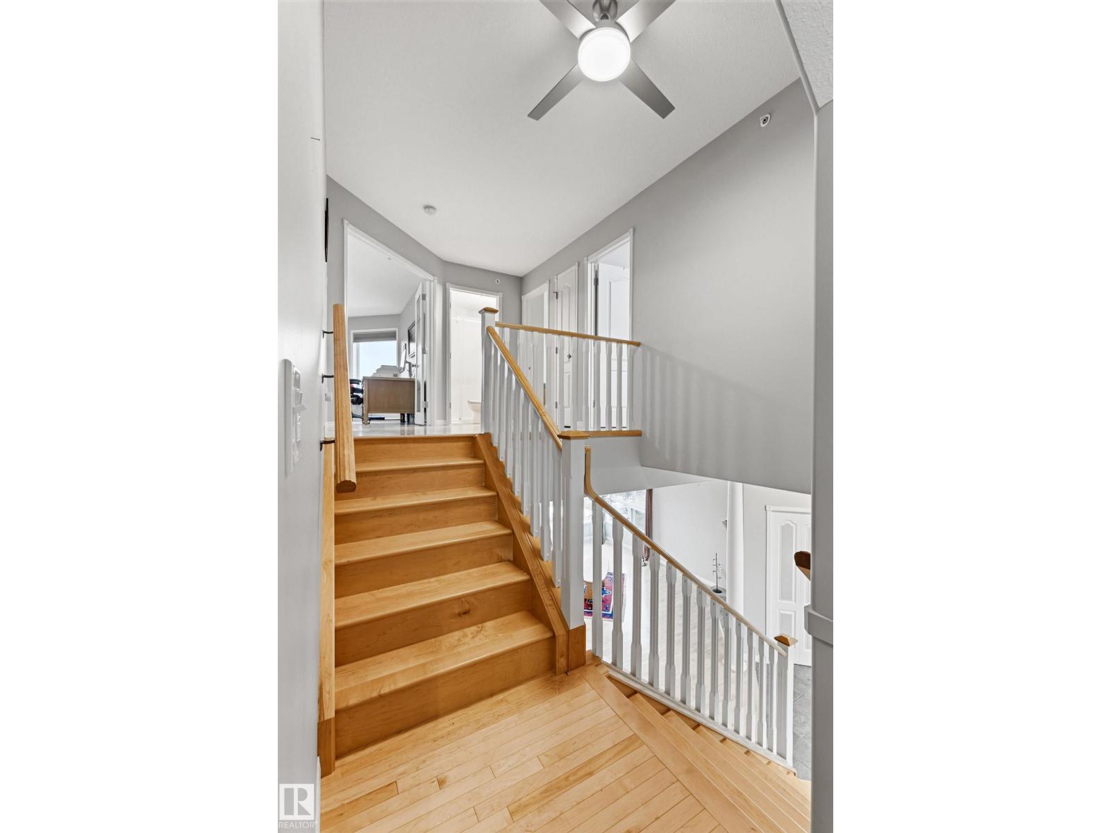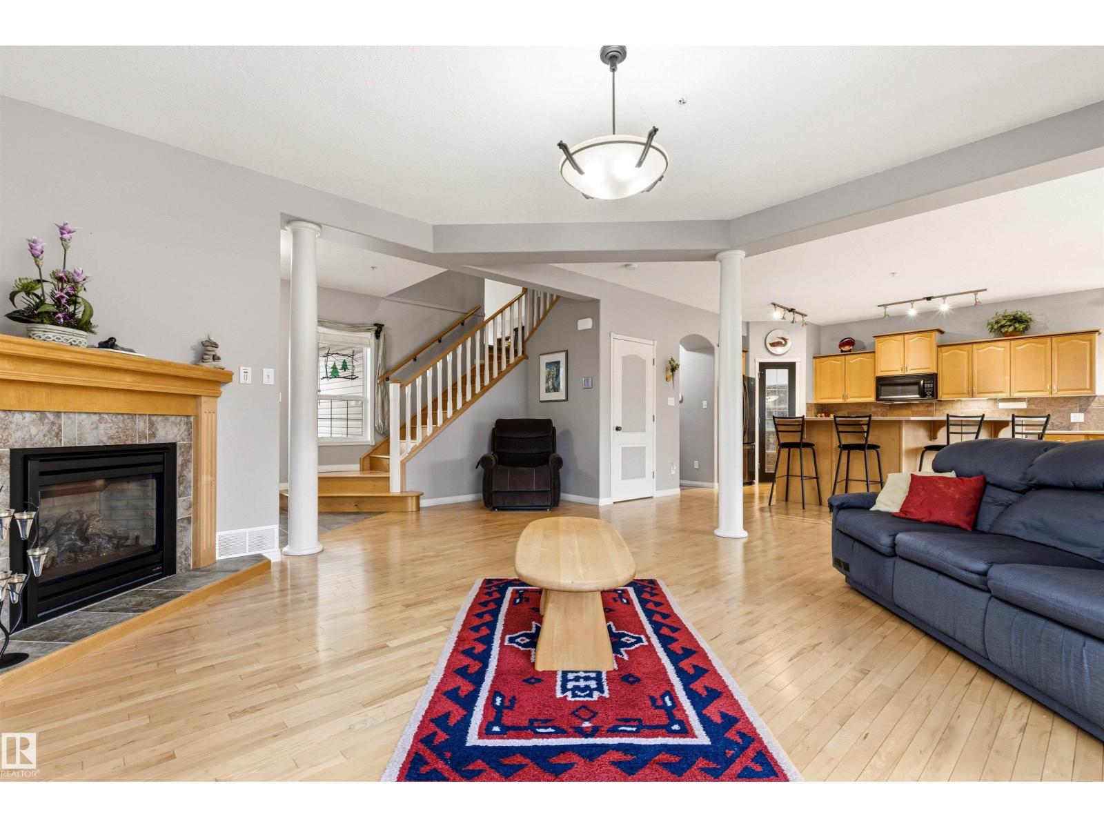 Prestige, privacy, and timeless quality meet in sought-after Lakeshore Estates, just minutes from Edmonton! Set on an impressive 1/2 acre lot, this exceptional 2-storey home offers refined acreage living with modern comforts throughout. Rich maple hardwood and custom cabinetry add warmth & elegance, while the chef-inspired kitchen features granite counters, large island with bar seating, and an open layout perfect for entertaining. Dining area offers beautiful views of rear yard and seats 6-8 + triple pane windows for natural light and efficiency. Enjoy year-round comfort with Central A/C, two gas fireplaces, and the added peace of mind of an interior sprinkler system. Upper level offers 3 spacious bedrooms plus a BONUS ROOM, including a stunning primary retreat with luxurious 5 pc ensuite. Outside, enjoy beautifully landscaped grounds with stamped concrete patio, fire pit, RV parking, storage shed, and room to roam. Triple attached heated garage with 240V wiring completes this rare offering. A MUST SEE! (id:63190)