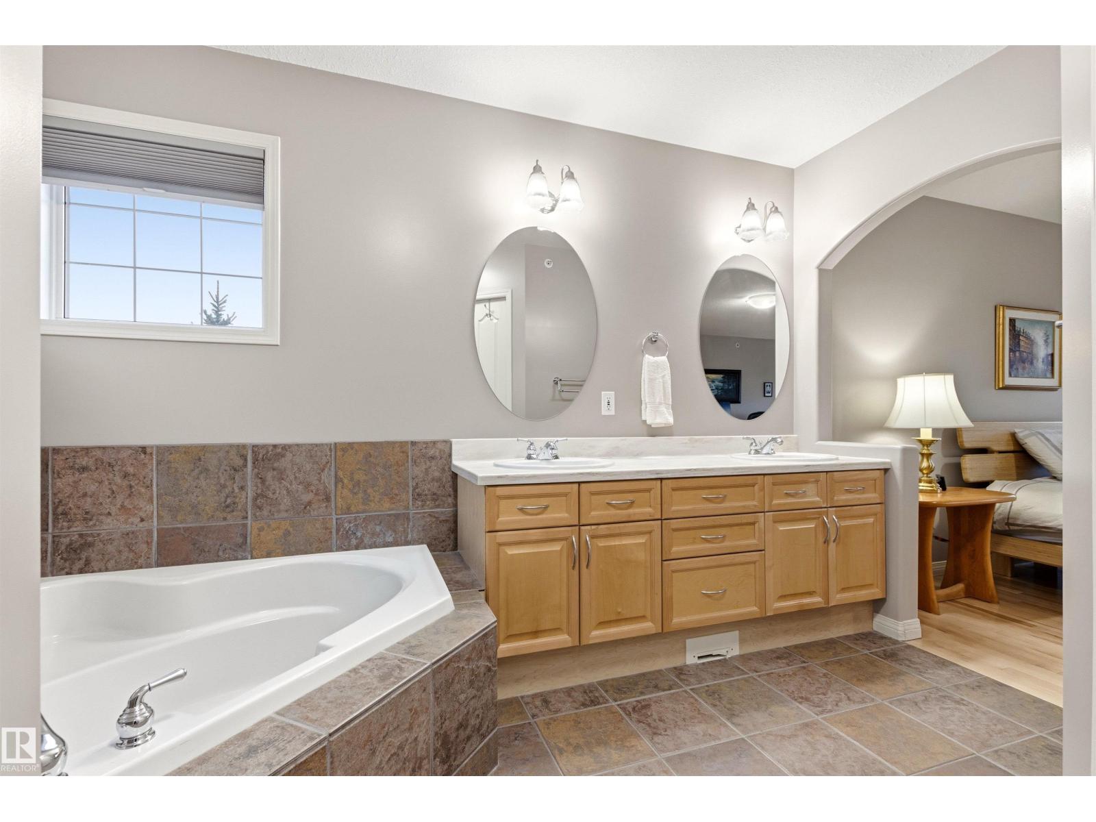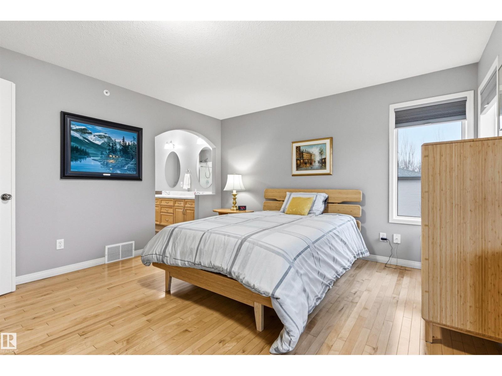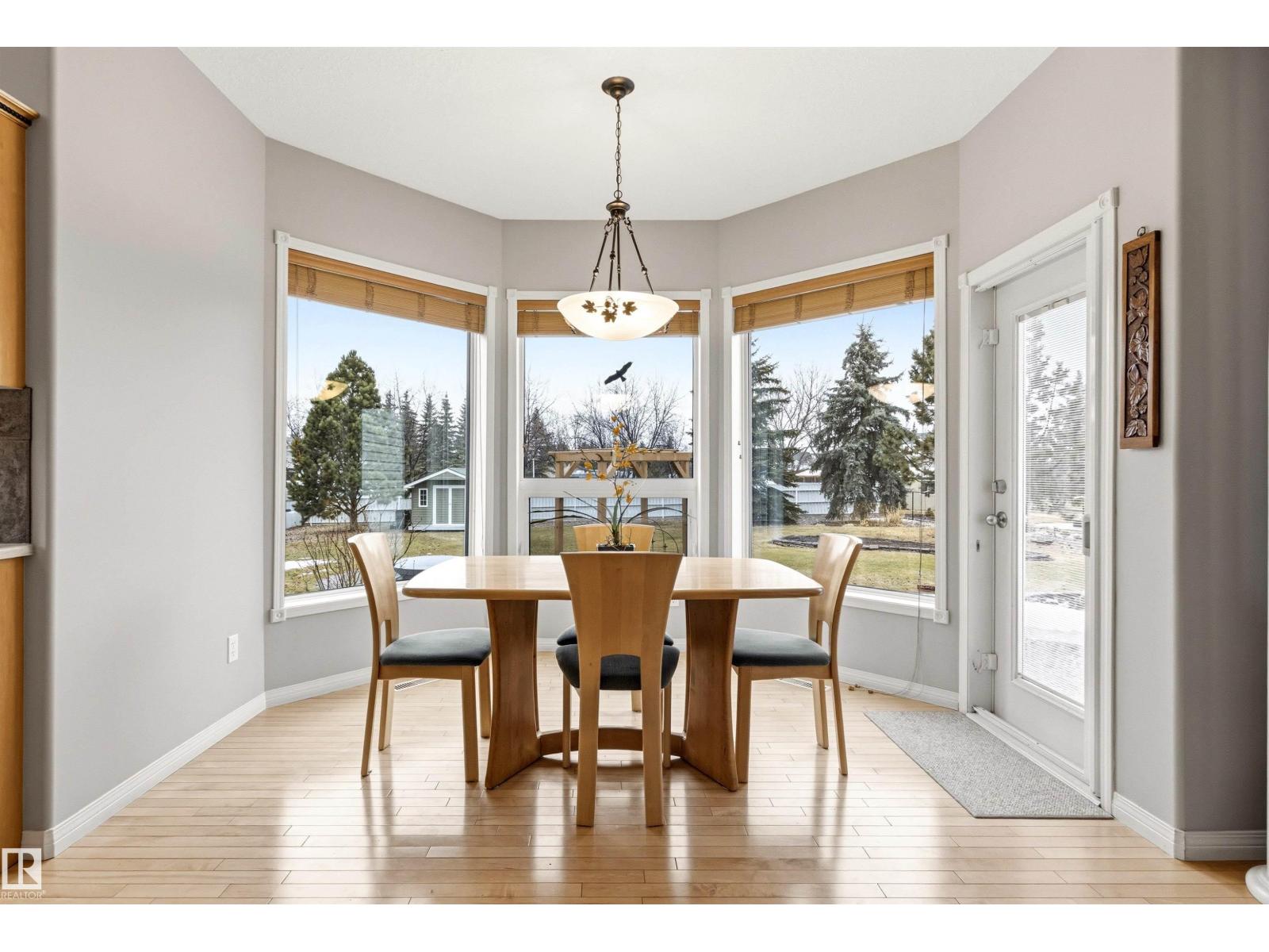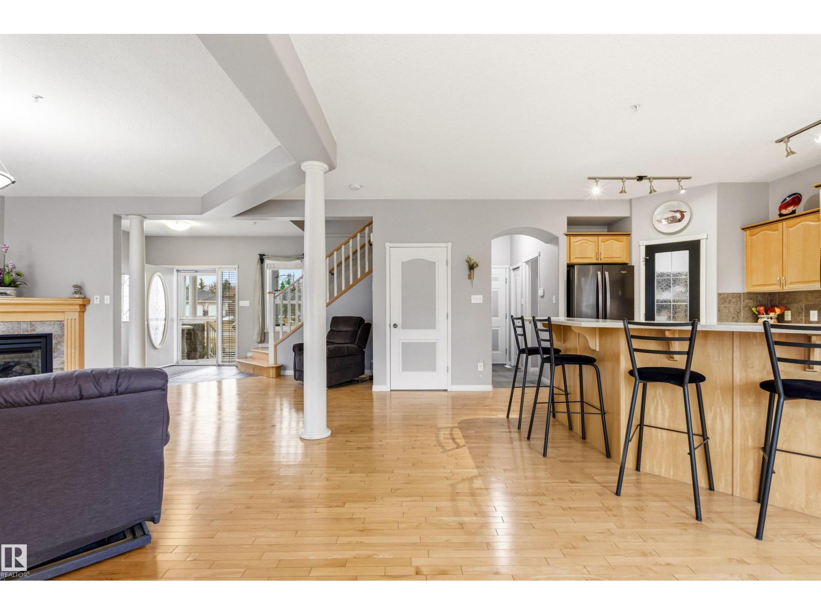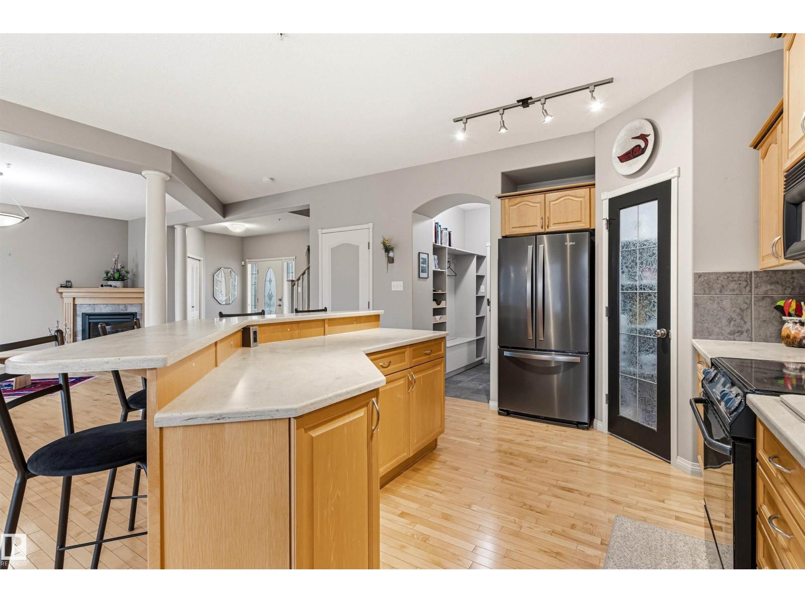 Prestige, privacy, and timeless quality meet in sought-after Lakeshore Estates, just minutes from Edmonton! Set on an impressive 1/2 acre lot, this exceptional 2-storey home offers refined acreage living with modern comforts throughout. Rich maple hardwood and custom cabinetry add warmth & elegance, while the chef-inspired kitchen features granite counters, large island with bar seating, and an open layout perfect for entertaining. Dining area offers beautiful views of rear yard and seats 6-8 + triple pane windows for natural light and efficiency. Enjoy year-round comfort with Central A/C, two gas fireplaces, and the added peace of mind of an interior sprinkler system. Upper level offers 3 spacious bedrooms plus a BONUS ROOM, including a stunning primary retreat with luxurious 5 pc ensuite. Outside, enjoy beautifully landscaped grounds with stamped concrete patio, fire pit, RV parking, storage shed, and room to roam. Triple attached heated garage with 240V wiring completes this rare offering. A MUST SEE! (id:63190)