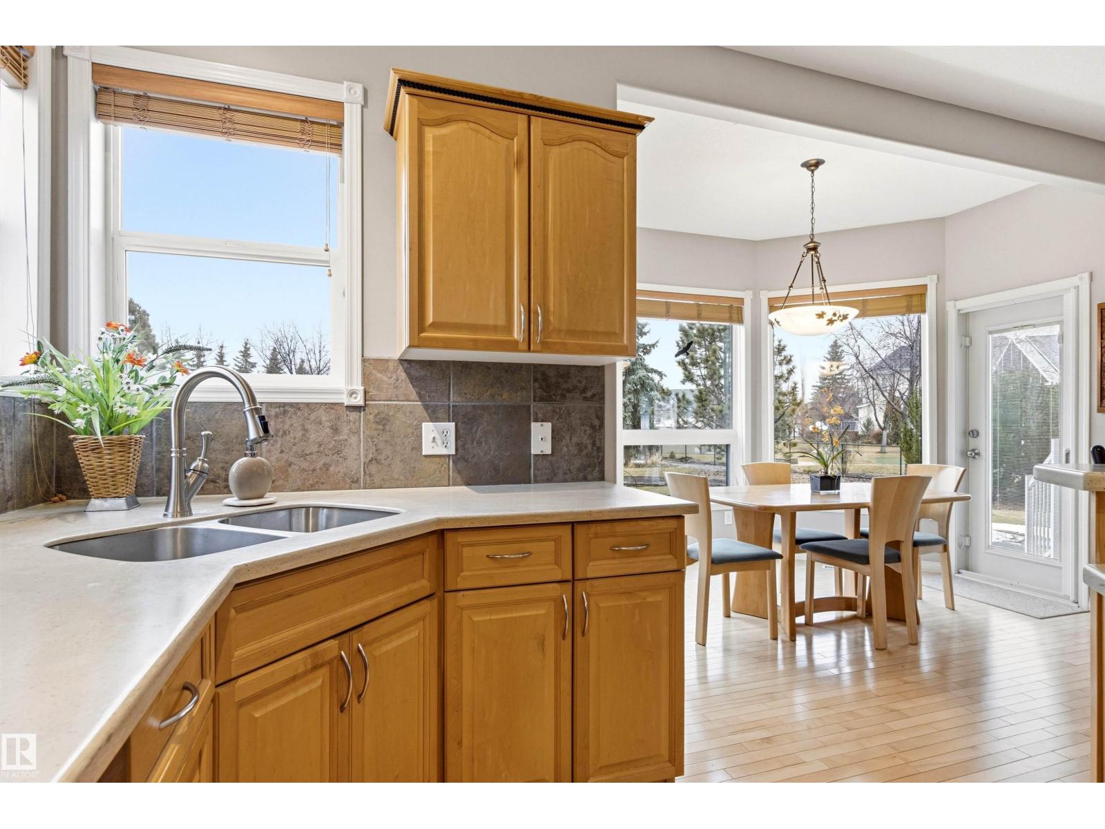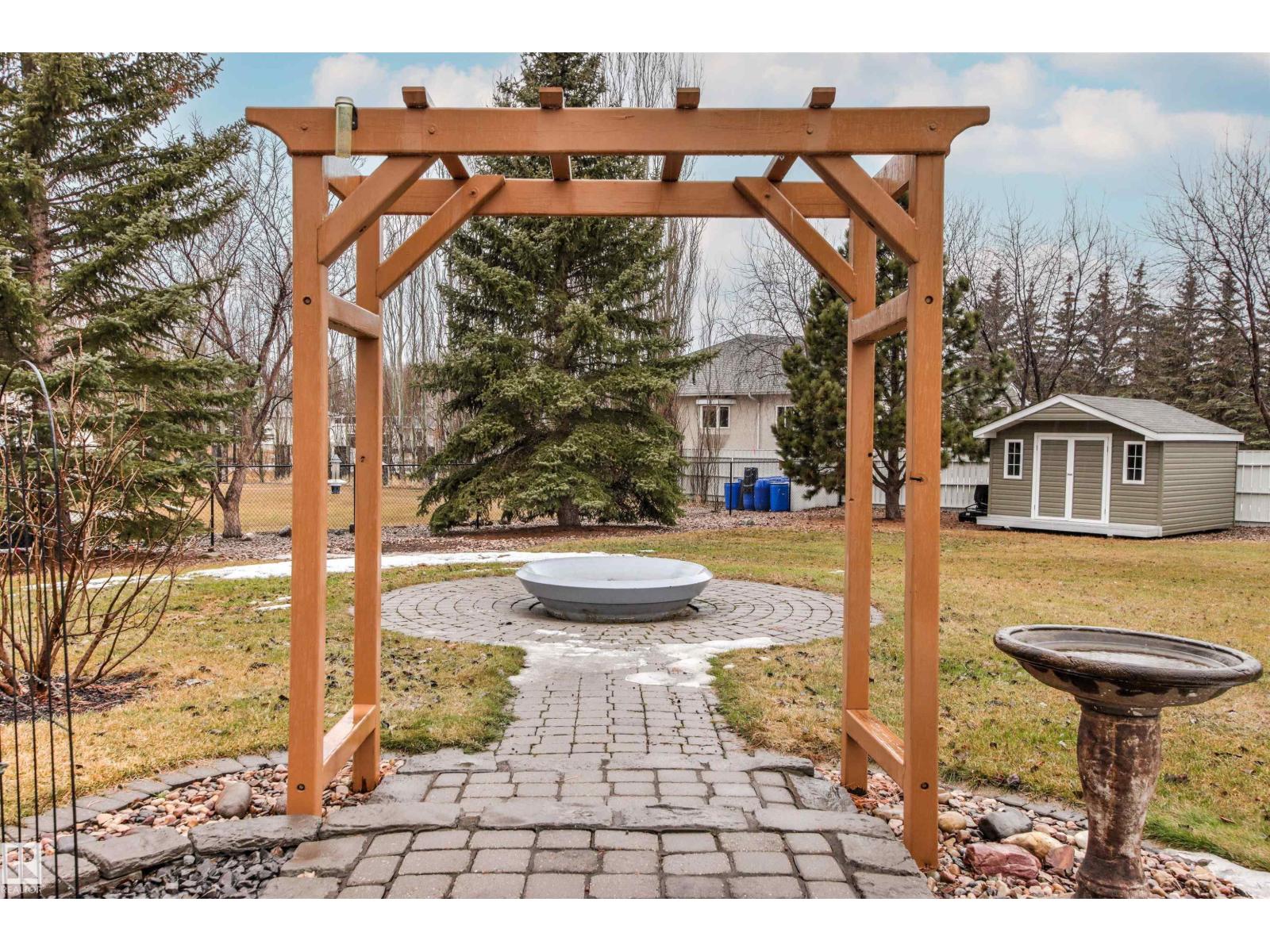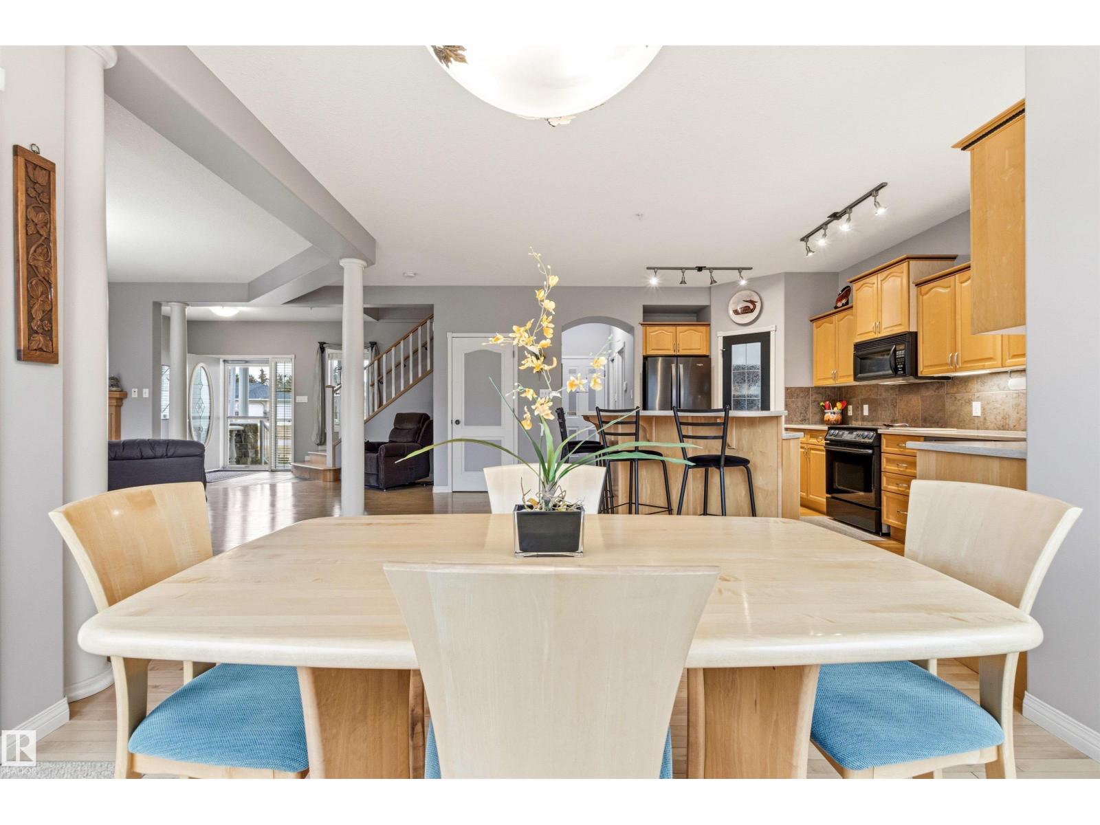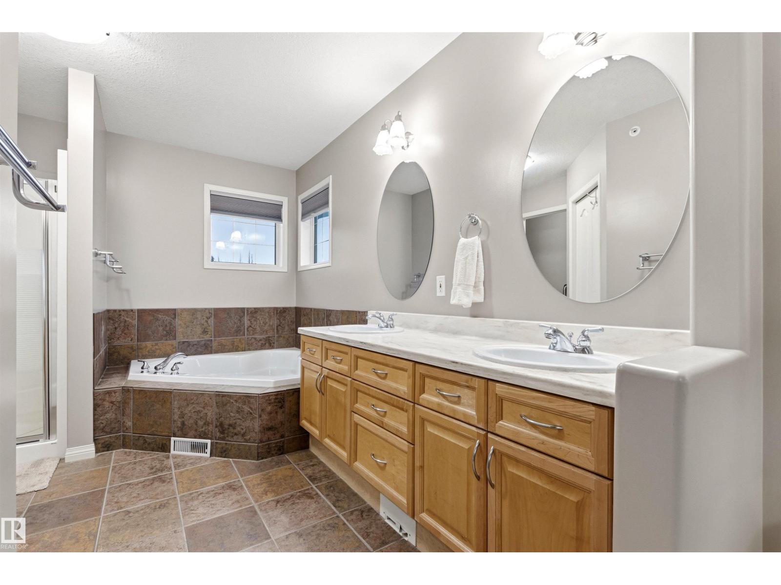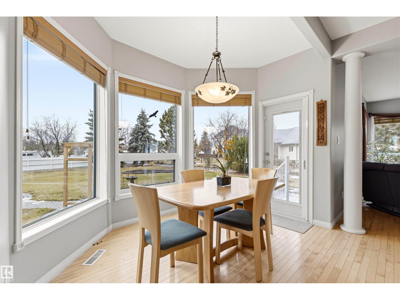 Prestige, privacy, and timeless quality meet in sought-after Lakeshore Estates, just minutes from Edmonton! Set on an impressive 1/2 acre lot, this exceptional 2-storey home offers refined acreage living with modern comforts throughout. Rich maple hardwood and custom cabinetry add warmth & elegance, while the chef-inspired kitchen features granite counters, large island with bar seating, and an open layout perfect for entertaining. Dining area offers beautiful views of rear yard and seats 6-8 + triple pane windows for natural light and efficiency. Enjoy year-round comfort with Central A/C, two gas fireplaces, and the added peace of mind of an interior sprinkler system. Upper level offers 3 spacious bedrooms plus a BONUS ROOM, including a stunning primary retreat with luxurious 5 pc ensuite. Outside, enjoy beautifully landscaped grounds with stamped concrete patio, fire pit, RV parking, storage shed, and room to roam. Triple attached heated garage with 240V wiring completes this rare offering. A MUST SEE! (id:63190)