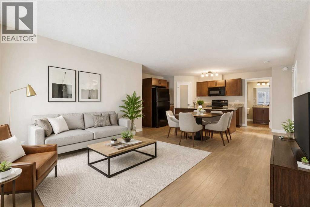 This charming 811 sq/ft two-bedroom townhouse offers a spacious open concept floor plan knockdown ceilings, a kitchen featuring granite countertops, a large island, and a corner pantry for ample storage. Both bedrooms are bright, sunny, and generously sized with cozy carpeting. Additional highlights include a 4-piece bathroom, a convenient laundry room, and extra storage space. Enjoy warm summer evenings on your west facing patio at the private front entrance. Located in the family-friendly community of Prairie Springs, residents have access to schools, playgrounds, sports facilities, and paved pathways, with shopping just a short 7-minute drive away. With plenty of parking and green spaces for the kids, this townhouse is the perfect first home. Call now to schedule a viewing! (id:63190)