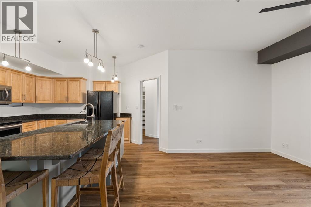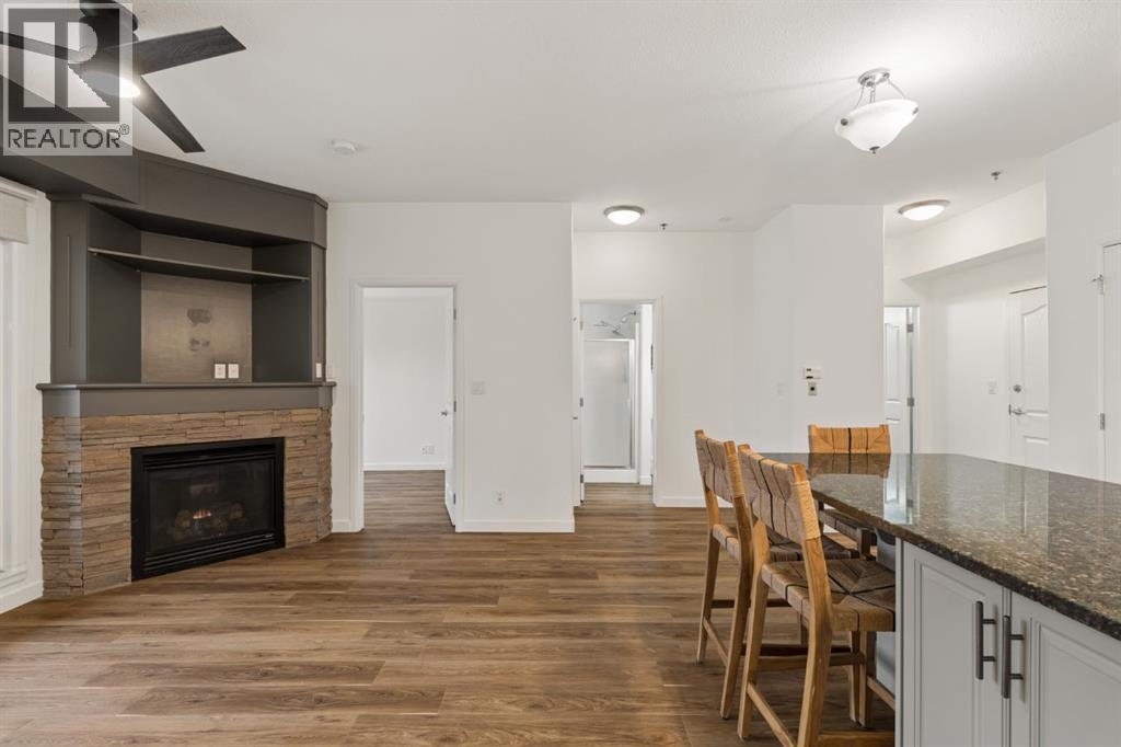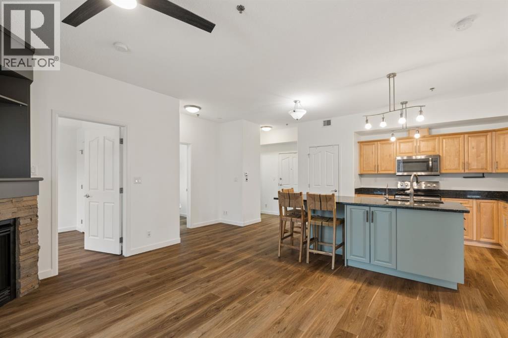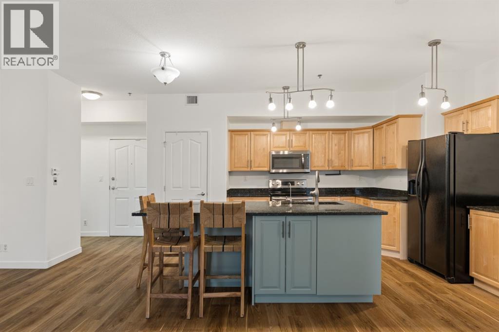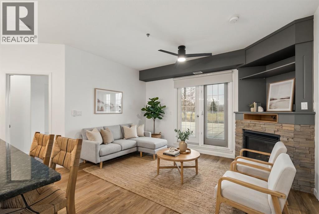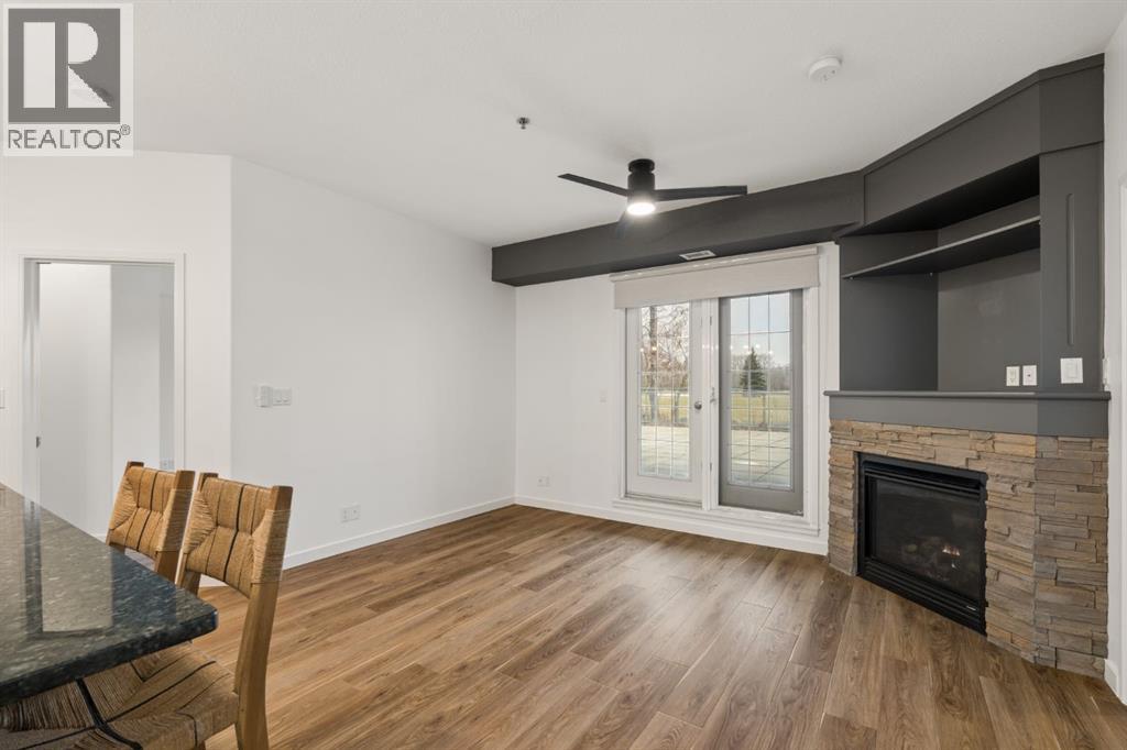 Welcome to this beautifully maintained ground-level unit backing directly onto the golf course, offering an unbeatable combination of privacy, views, and outdoor living. Featuring 2 bedrooms and 2 full bathrooms, this home is thoughtfully laid out with an open-concept design that creates a bright and inviting living space. The kitchen has been upgraded with a larger island and flows seamlessly into the dining and living areas, making it perfect for both everyday living and entertaining. Luxury vinyl plank flooring runs throughout, adding a modern touch while being both durable and easy to maintain. The unit is in immaculate condition, showing true pride of ownership. One of the standout features is the massive ground-level patio, where you can step outside and enjoy direct access to green space with peaceful golf course views—perfect for morning coffee or evening relaxation. The primary bedroom includes a full ensuite, while the second bedroom and bathroom are well-positioned for guests or additional living space. Additional conveniences include in-suite laundry and designated parking. The building features luxury amenities such as a theatre room, gym, sauna and hot tub, library and games room, party room, and car wash and ocated in a highly desirable community close to walking paths, the lake, golf course, and local amenities. This unit offers a rare opportunity to enjoy low-maintenance living with exceptional outdoor space and views. (id:63190)