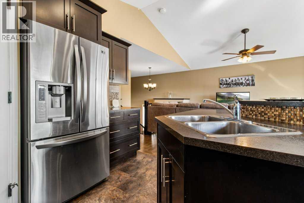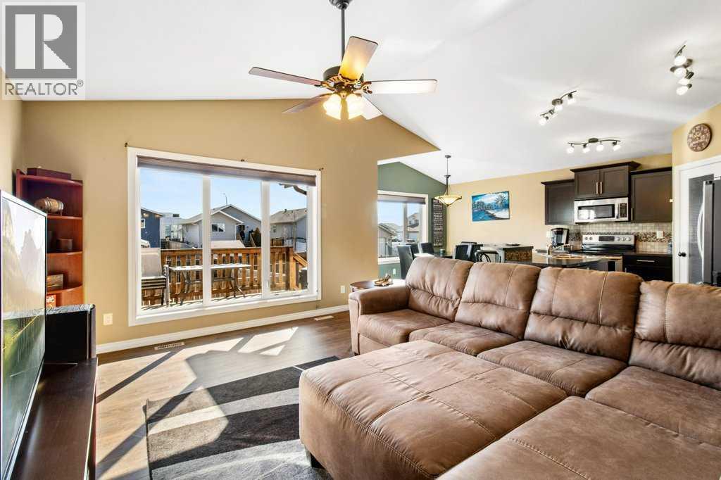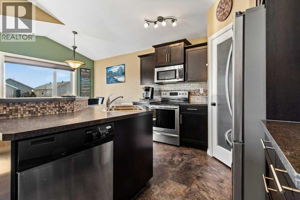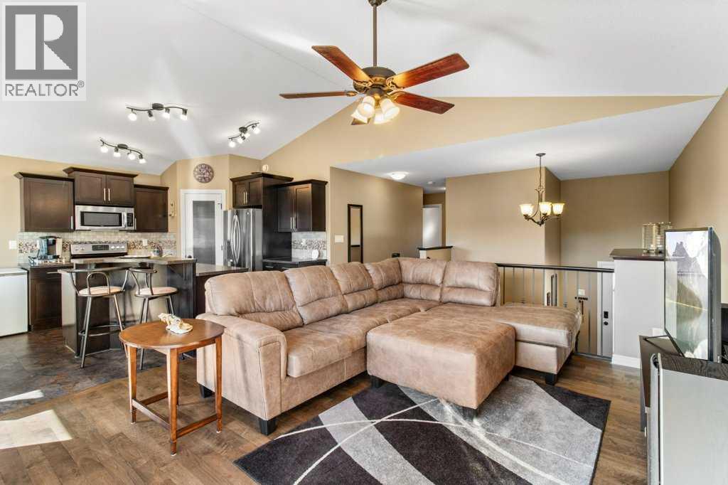Welcome to this well maintained and original owner home in a fantastic Blackfalds location! Situated on a quiet, family-oriented street, this lovely bi-level offers convenient access to schools, parks, and all town amenities. The home features alley access, a fully fenced yard, and a large deck. Step inside to a spacious entryway with ample storage, leading up to the bright and open main floor. Here you’ll find three well appointed bedrooms, two bathrooms, and a generous living space that flows effortlessly into the kitchen and out onto the deck. High vaulted ceilings and large windows enhance the sense of space and natural light throughout. This is a wonderful opportunity to own a comfortable, functional home in a great community! (id:63190)