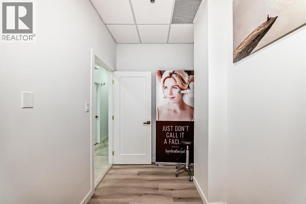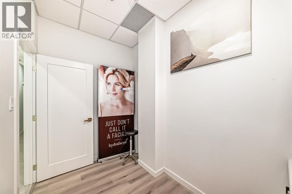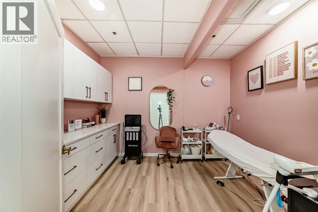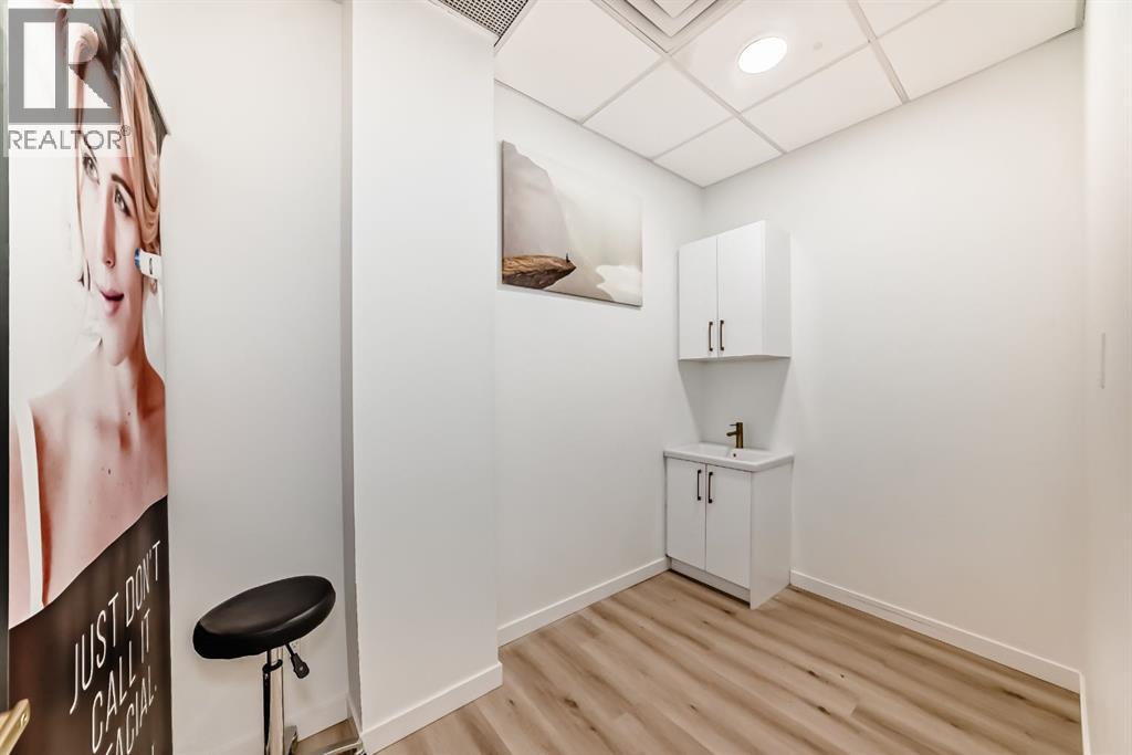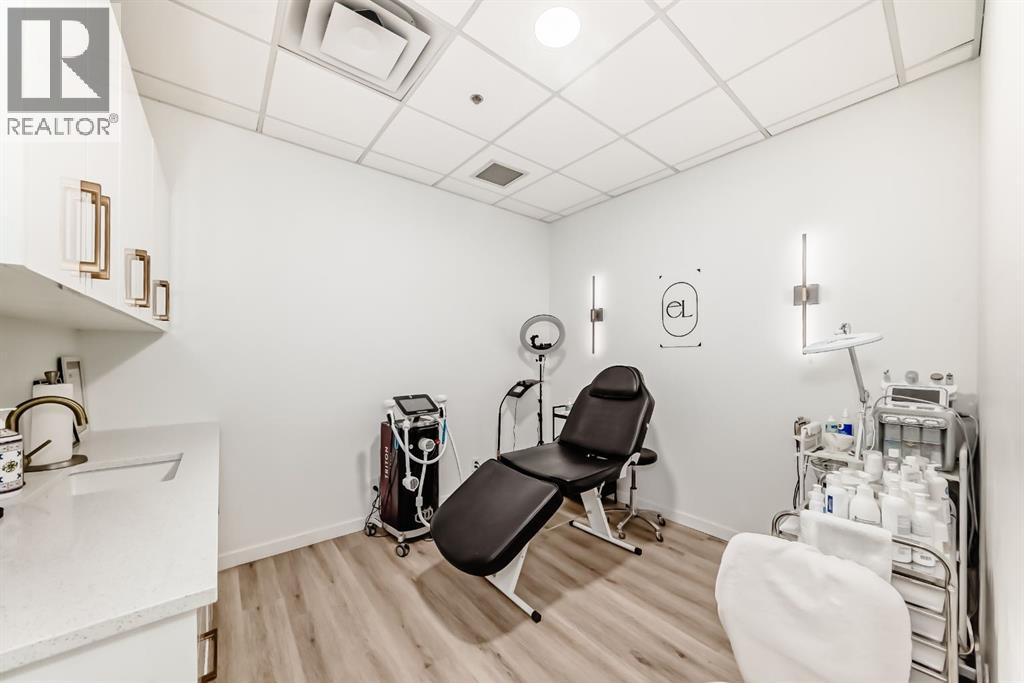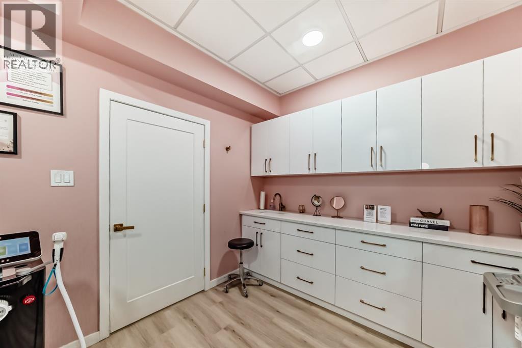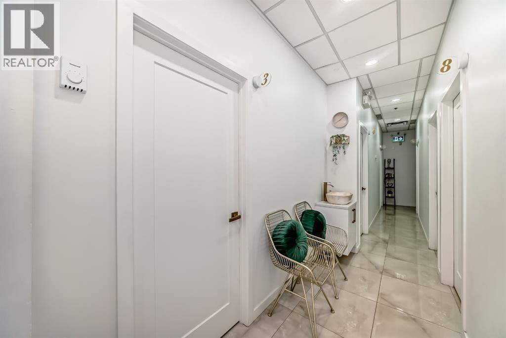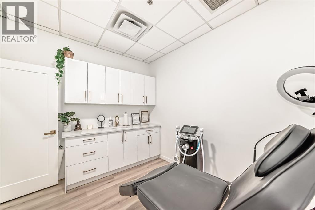 Turn-key professional commercial condominium unit with full clinical infrastructure. Currently operating as an established aesthetics clinic, this impeccably maintained 1,060 square foot suite presents a rare opportunity for medical, wellness, or high-end aesthetics users seeking a fully built-out space. Positioned along the high-exposure Centre Street NW corridor, the unit has been thoughtfully designed to support multiple practitioners while maintaining a refined, boutique atmosphere. The layout features eight private treatment rooms, each equipped with its own sink; an extensive and costly infrastructure upgrade. The space is anchored by a polished front reception and client waiting area that delivers a strong first impression. A central hallway provides efficient circulation, complemented by a private two-piece bathroom and a dedicated laundry and utility room to support daily operations. Dual access points enhance functionality, with a welcoming front entrance for clients and a separate rear exit ideal for staff and deliveries. Two assigned underground parking stalls are included, offering added convenience in this highly accessible inner-city location. This is a rare opportunity to secure a fully plumbed, high-density professional space in a prime Calgary corridor, with immediate usability and long-term flexibility. (id:63190)